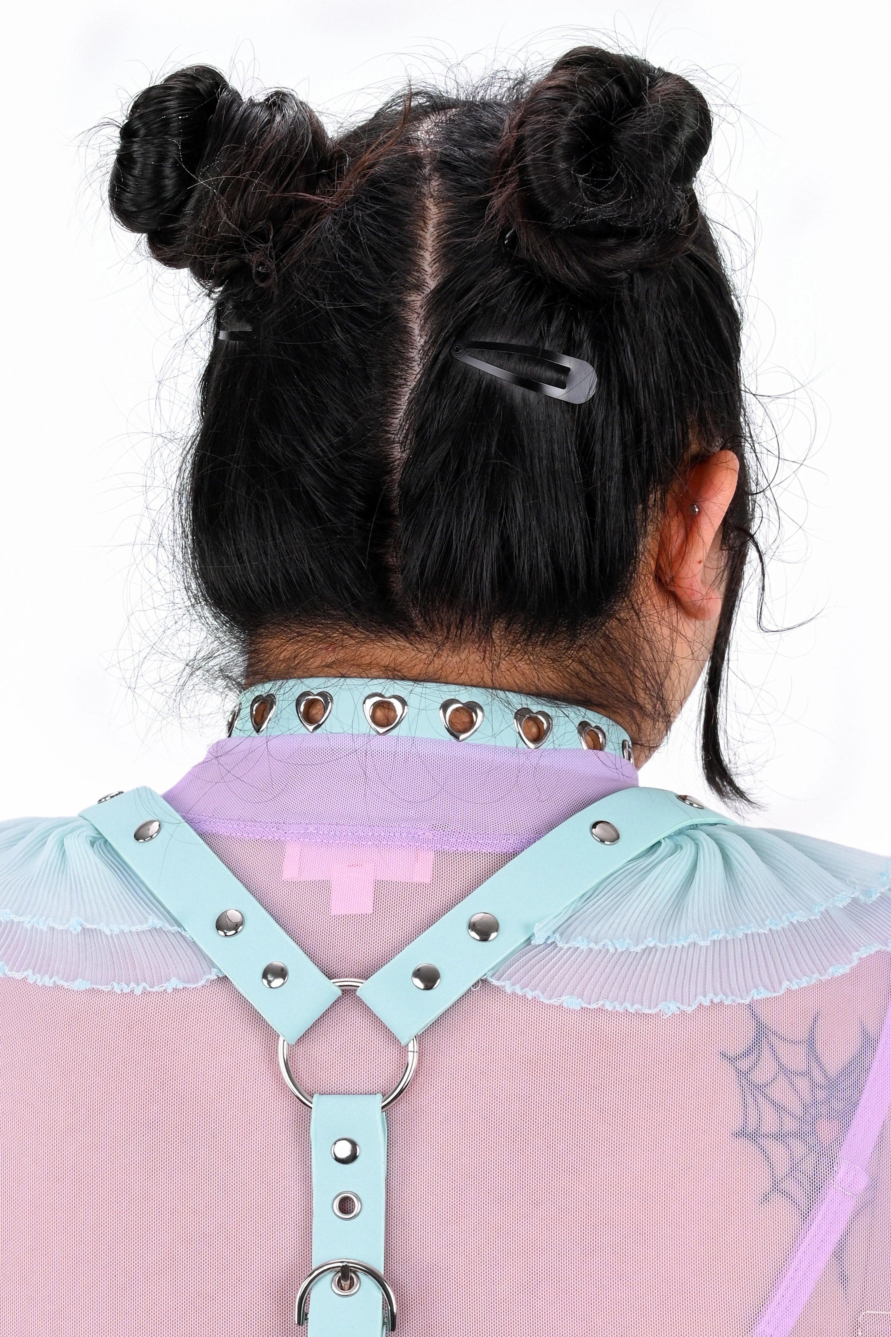 A choker necklace in the perfect shade of mint, complete with a cute heart buckle. The heart rivets are not only cute, but go all around the length of the choker, offering an extremely adjustable fit. Made to match perfectly with the Mint Cherub Harness.
