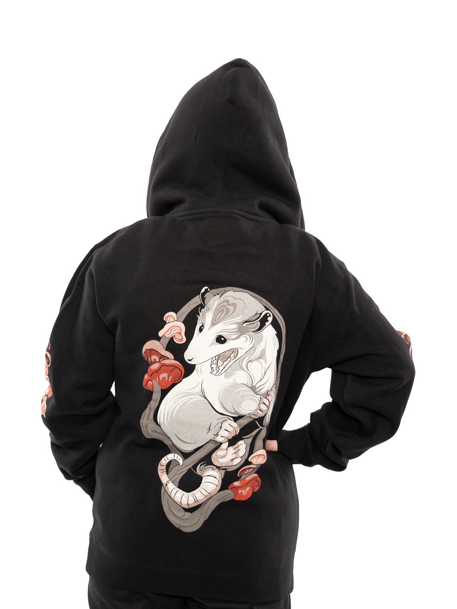 "Did you know Opossums can't get rabies? And they eat ticks? AND they're cute!?" Small opossum art on front, mushrooms on sleeves, large opossum on the back.