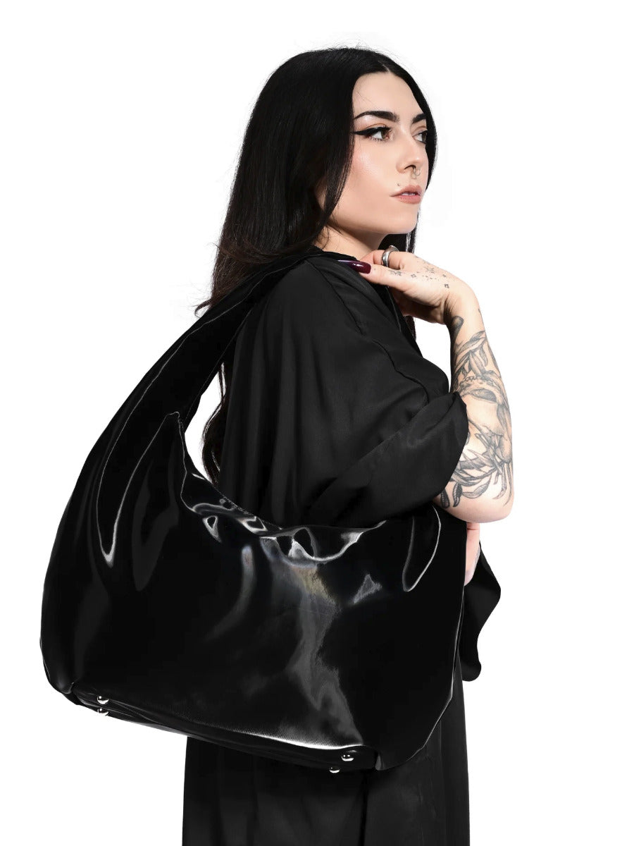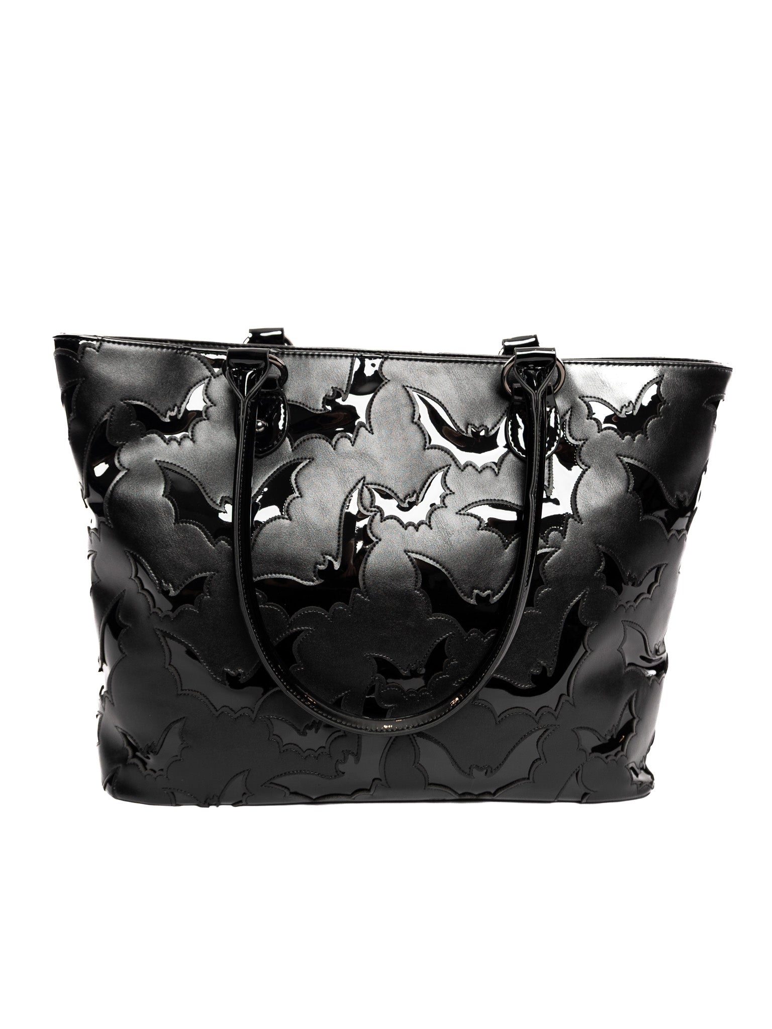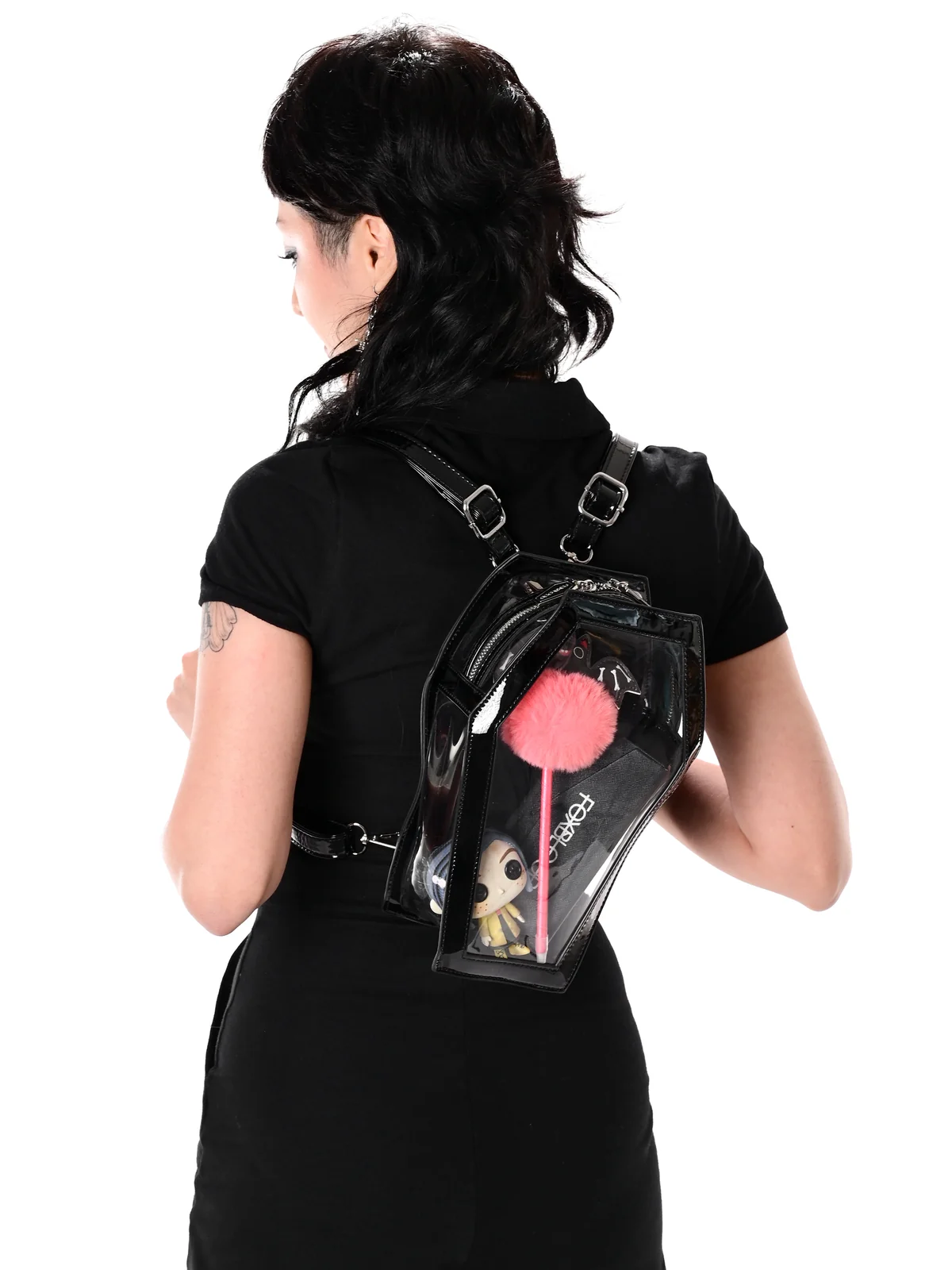 Zipper top closure with coffin zipper pull. Inside is a large hidden zipper pocket and 2 open top pockets.