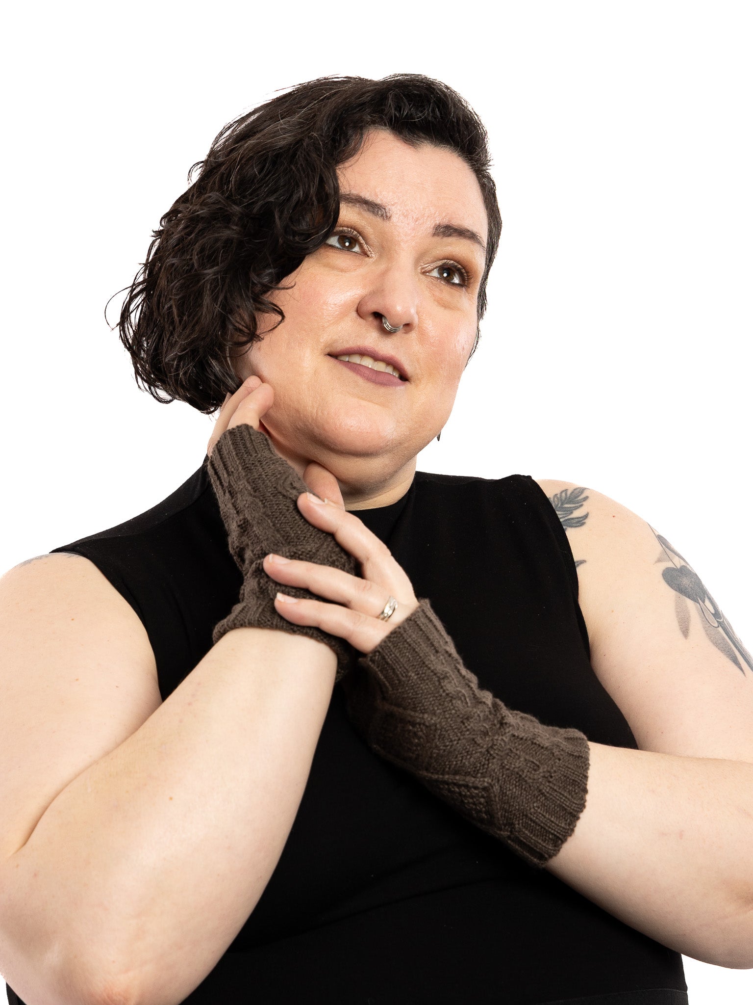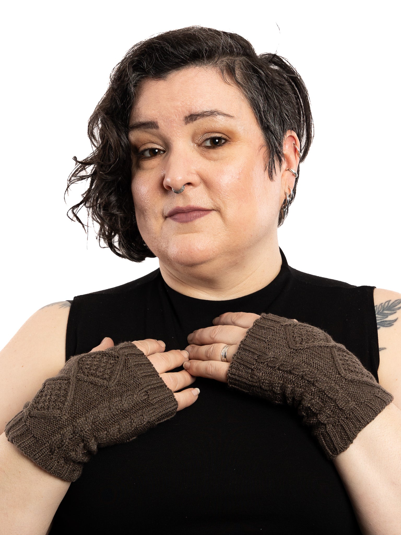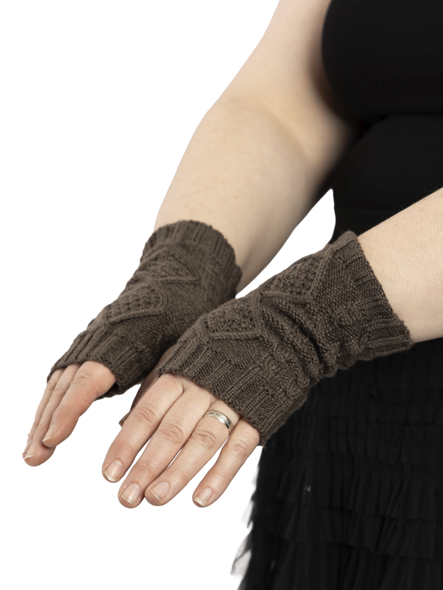 Thick, diamond cable knit texture. Thumb openings allow your hands to stay warm while your fingers peek through.