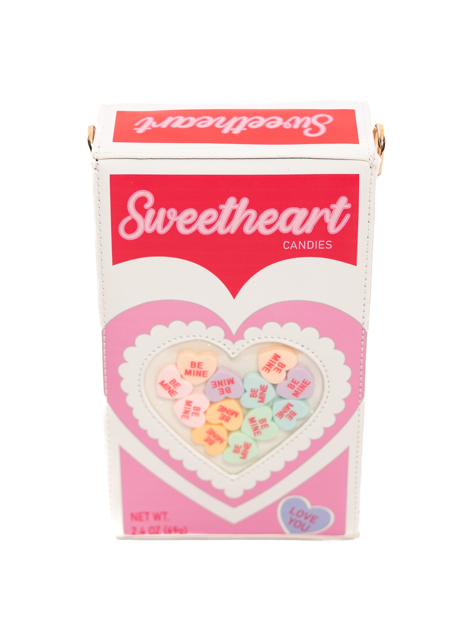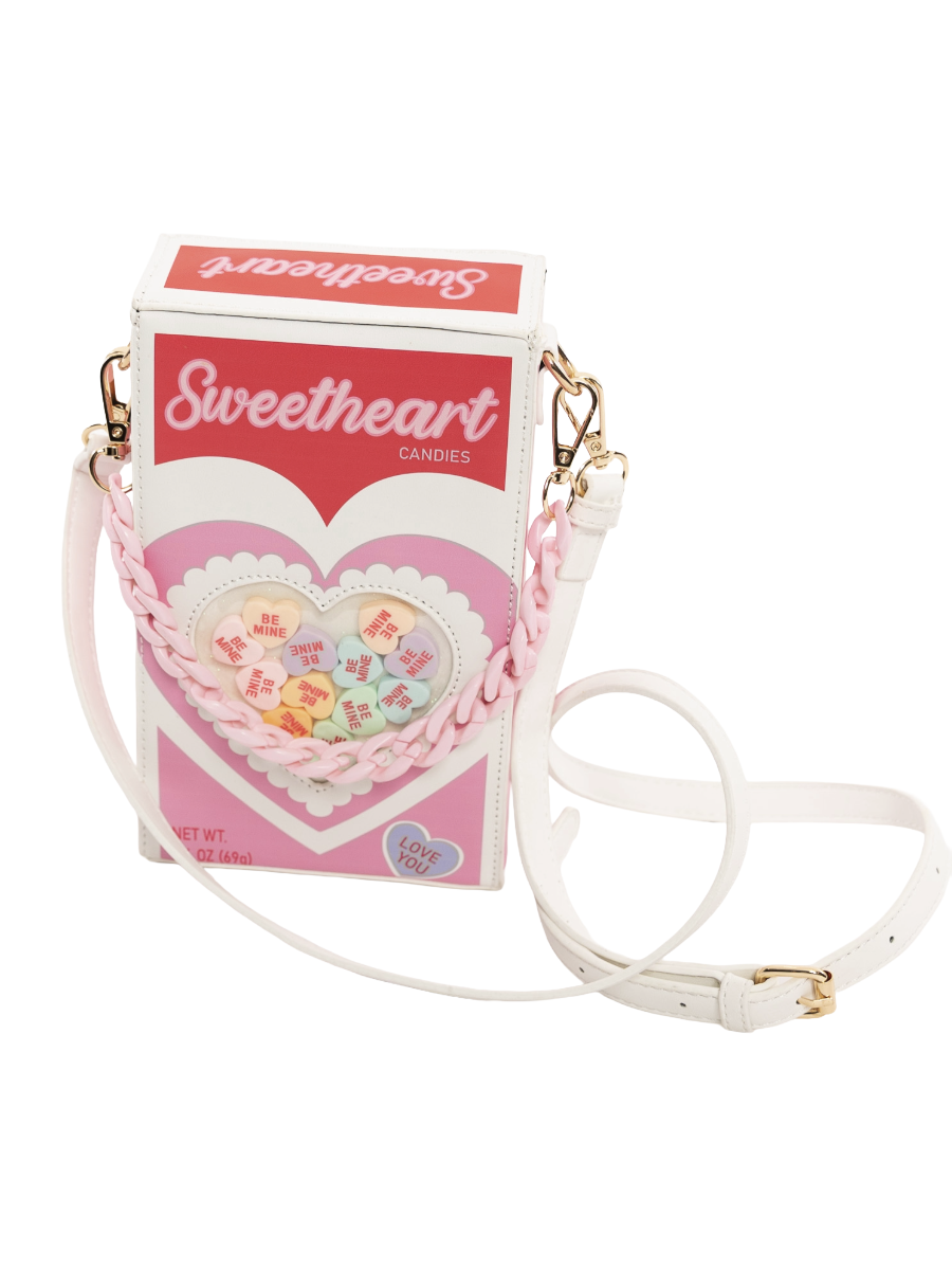 Classic candy as a sweet handbag! Magnetic clasp closure, removable pink chain strap, and removable, adjustable crossbody strap.
