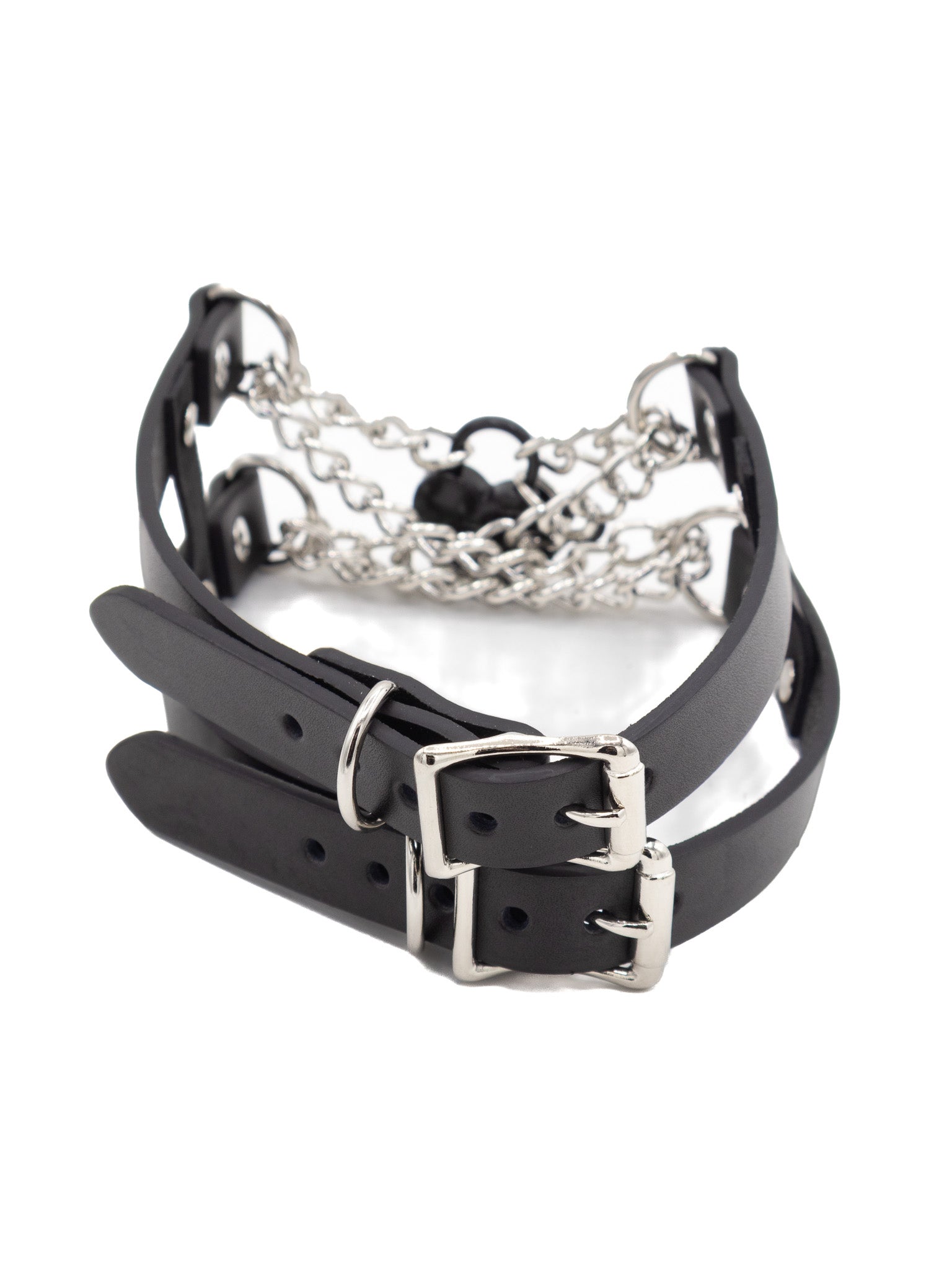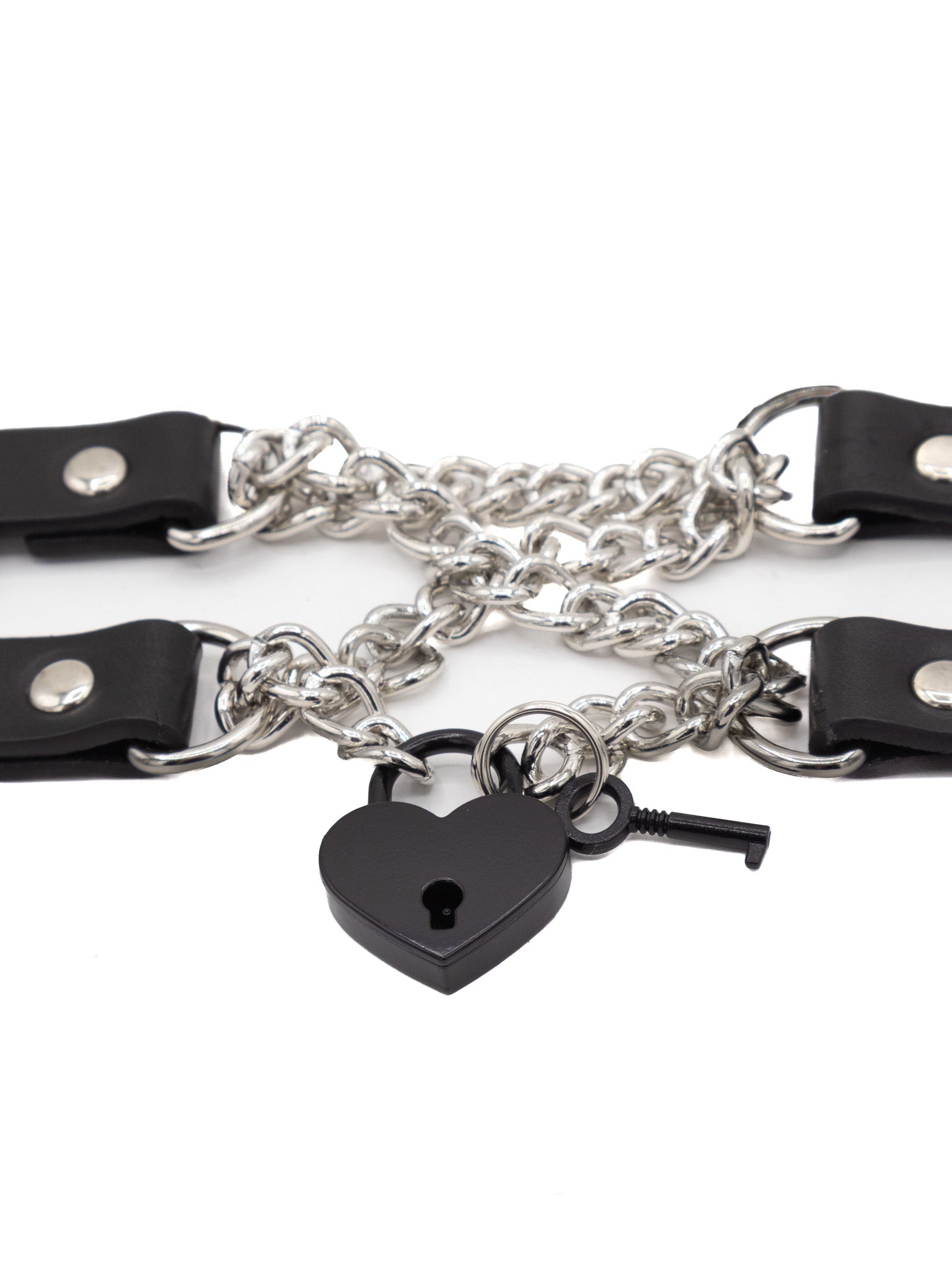3/4" double strap leather choker with interlaced metal chains and a black metal padlock. Made in New Jersey by Funk Plus, an alternative accessory design brand focused on durability and longevity. Handmade from scratch, ensuring unique, carefully crafted pieces. Locally sourced materials, including premium leather from nearby tanneries. High-quality hardware incorporated in every product for enhanced durability.