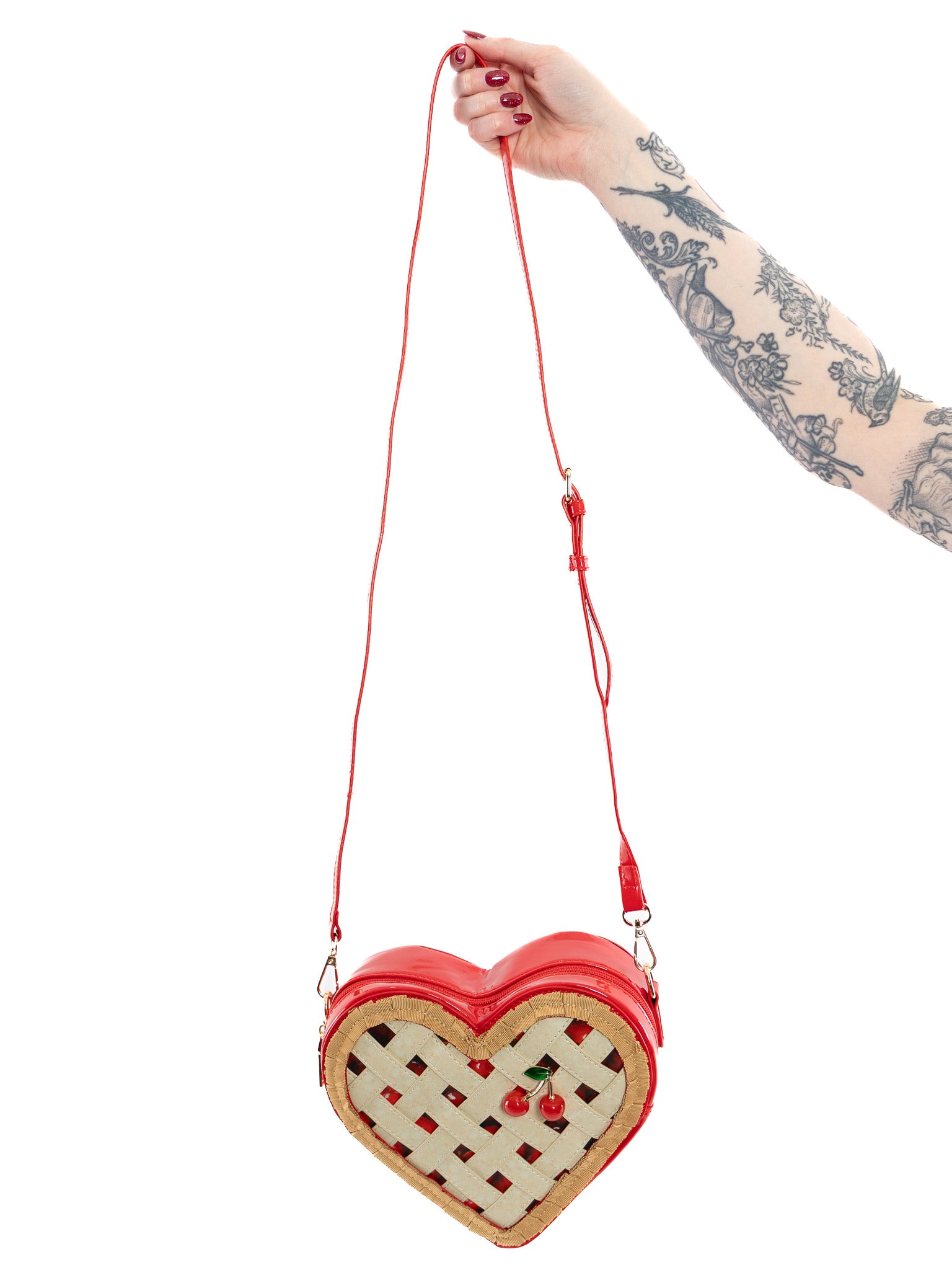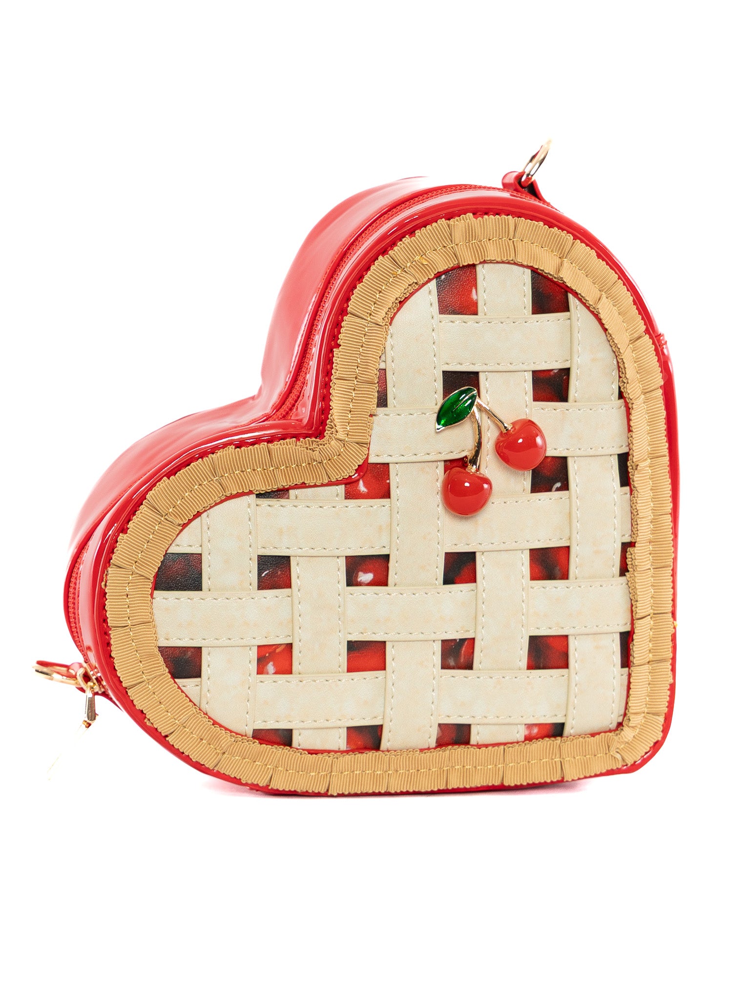 This bag calls out to all the whimsical cottage-goths with its red patent heart-shaped body, intricate front weaving and ribbon details, and mock-recipe graphic on the back. The removable cherry pin on the front is quite literally the cherry on top of this sweet accessory!