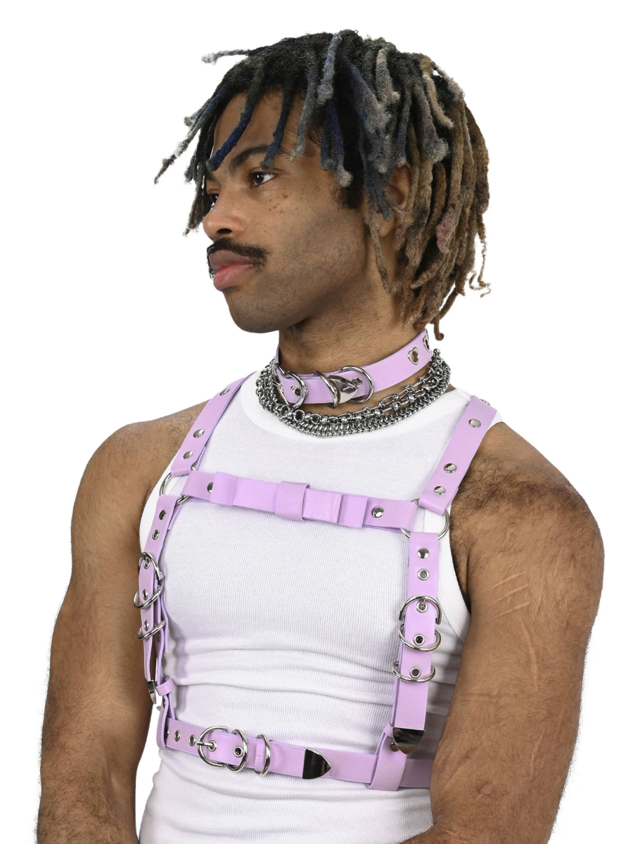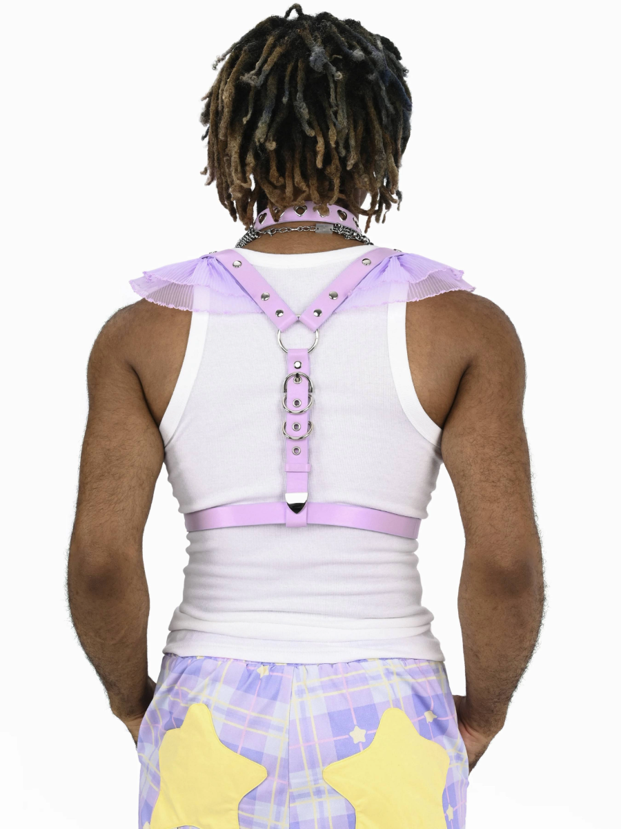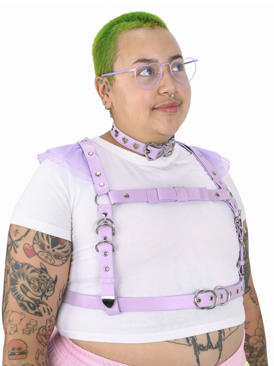 This harness has to be on of our favorite accessories to date! Adjustable at the waist, back, shoulders, and front strap, this harness has been carefully designed for extra comfort on all body types! The front strap at the clavicle and the shoulder ruffles are fully removable (and swappable!) with snaps for maximum versatility. Made to match perfectly with the Amor Choker.