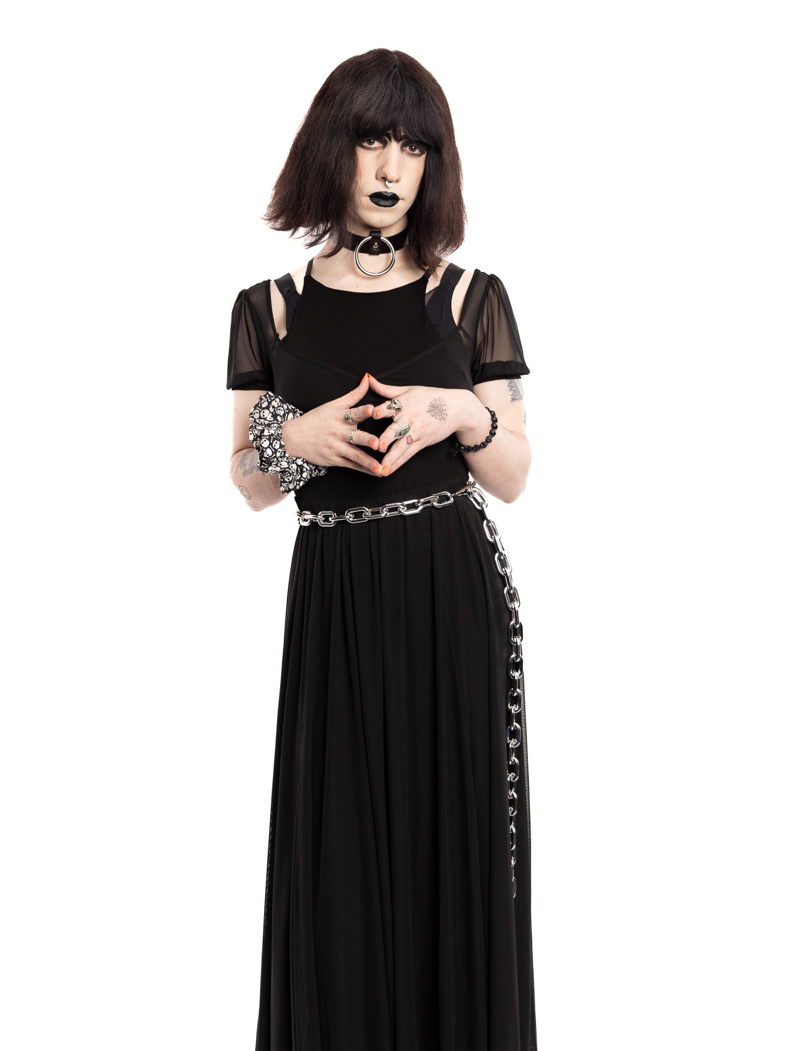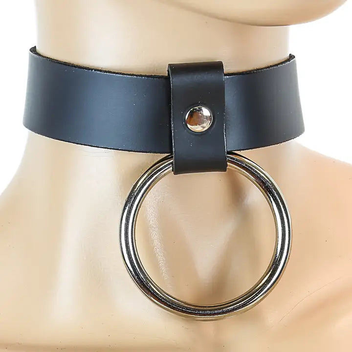 Get industrial with this 1" wide leather choker featuring a hanging 2.5" wide chrome metal ring in the middle. Wear it with the ring on the top or bottom!