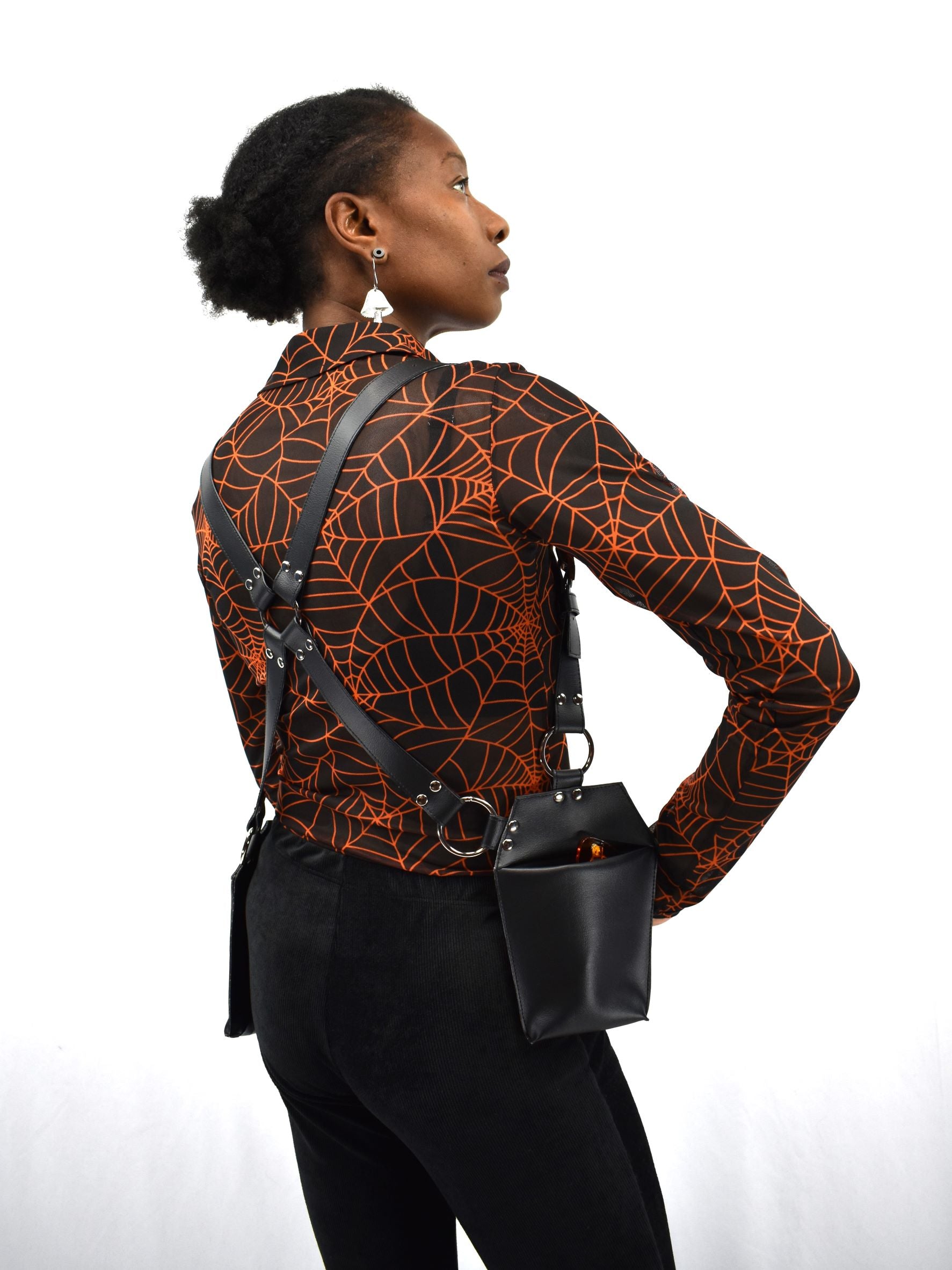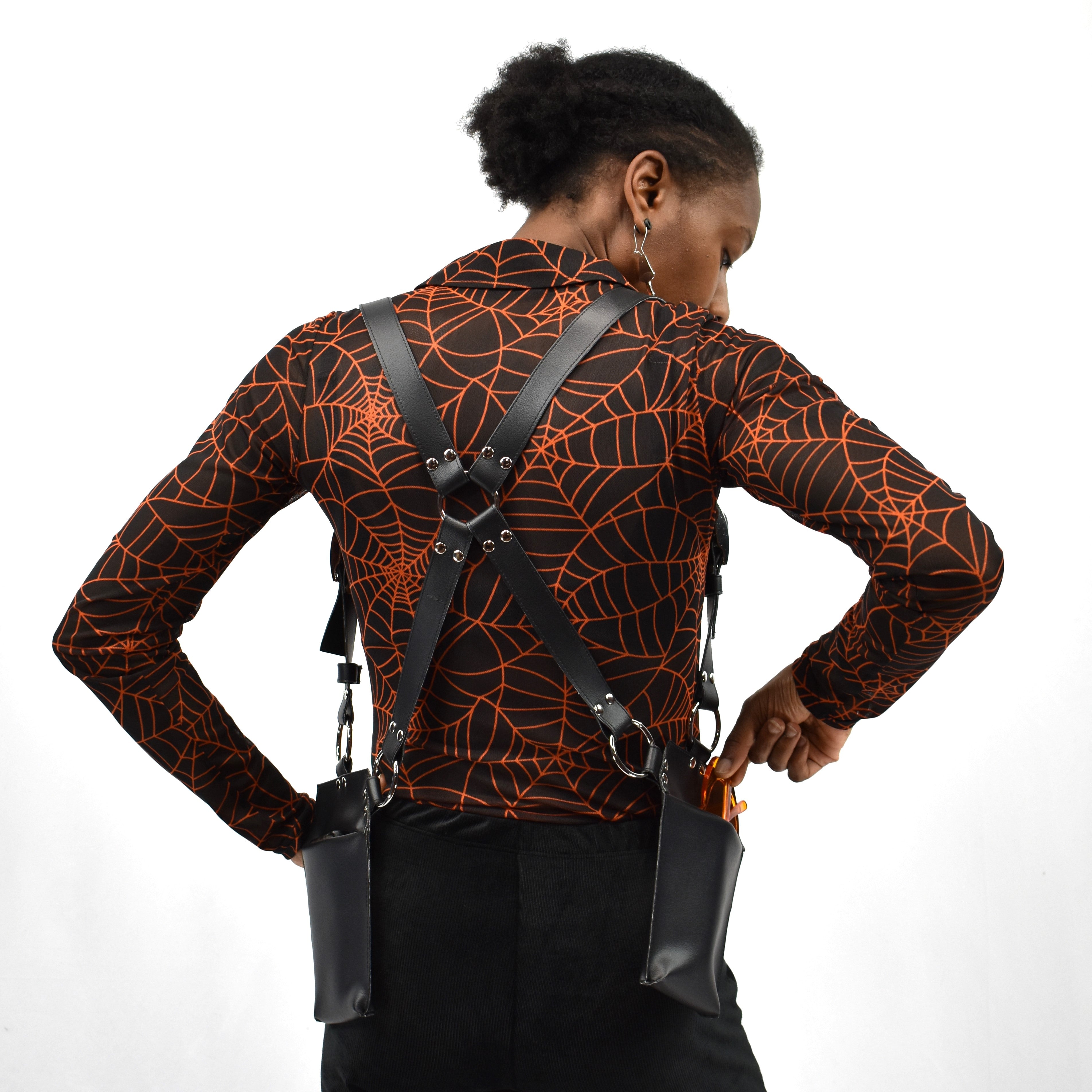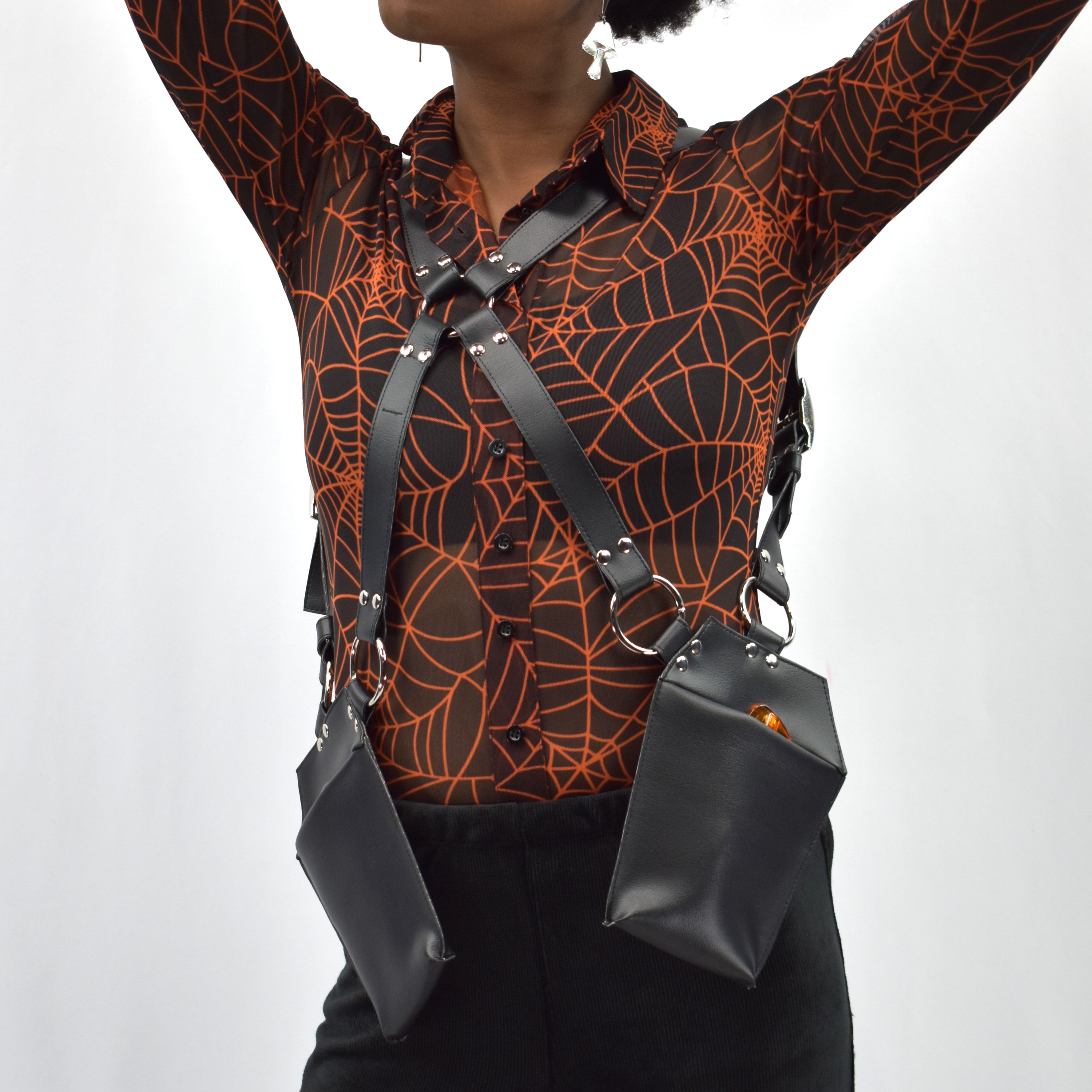 This adjustable, wide strap Coffin Holster Harness by Jenny Machete was inspired by the need for pockets! The coffins have a handy little flap that folds over your phone to keep it secure. This design is unisex and would look fantastic on many shapes and sizes! All metal fastenings are silver toned made of coated zinc.