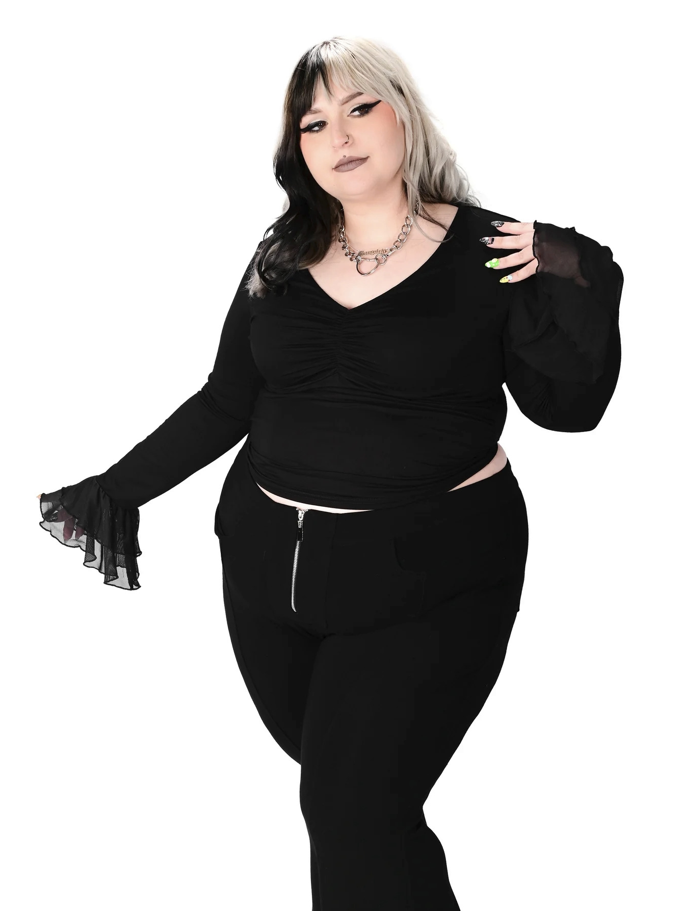 This long sleeve top has ruching on the front bust, and the cutest mini mesh bell sleeves.
