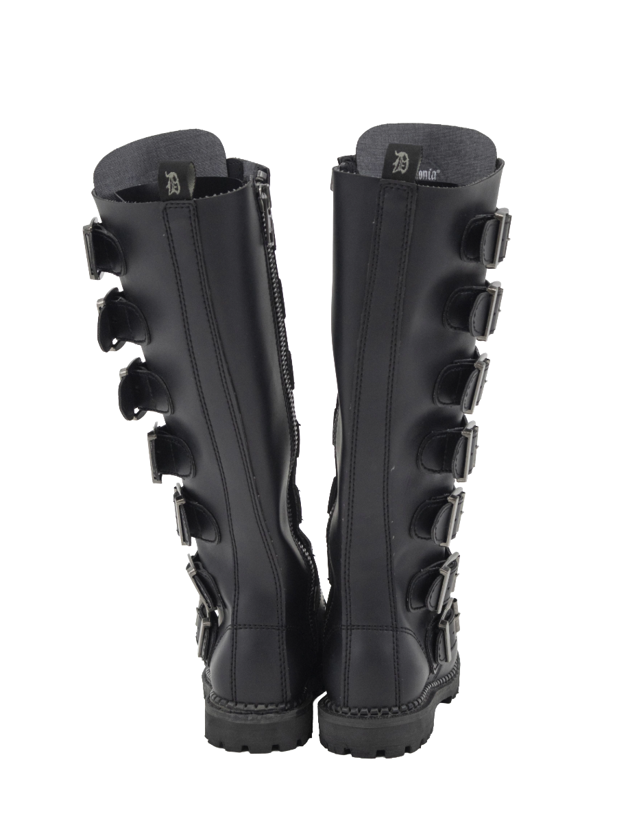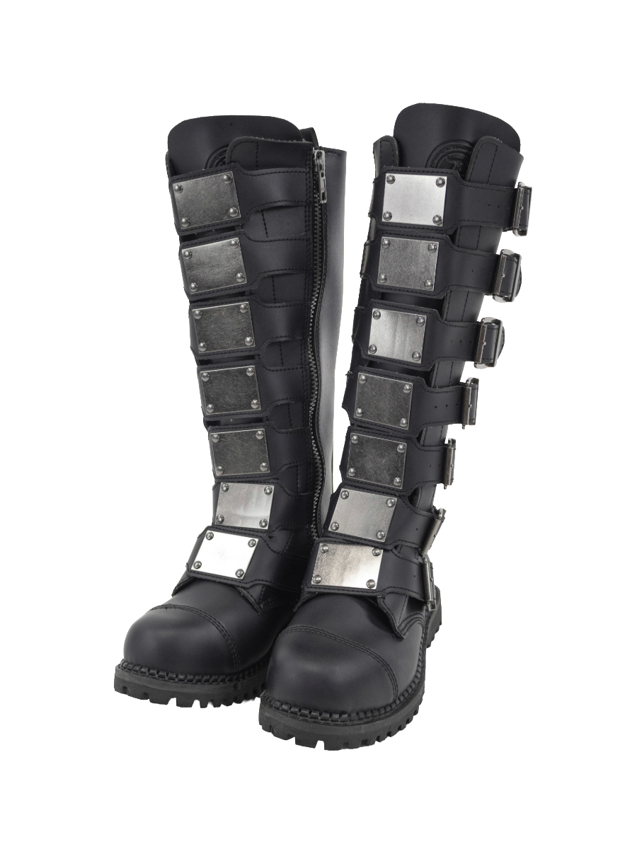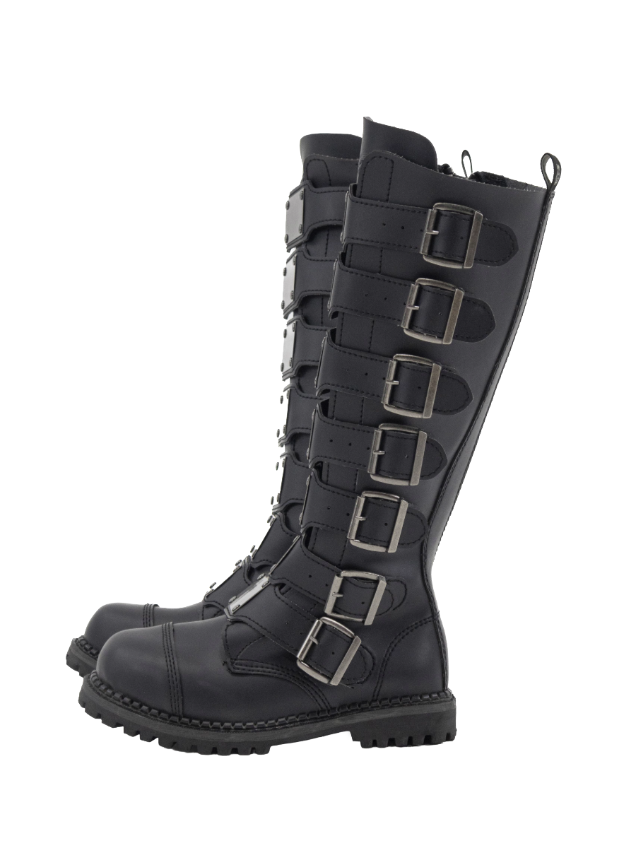 Unisex steel toe knee-high combat boot, featuring vegan leather, adjustable buckles with front metal plates, rubber sole, and full length inside zip closure.