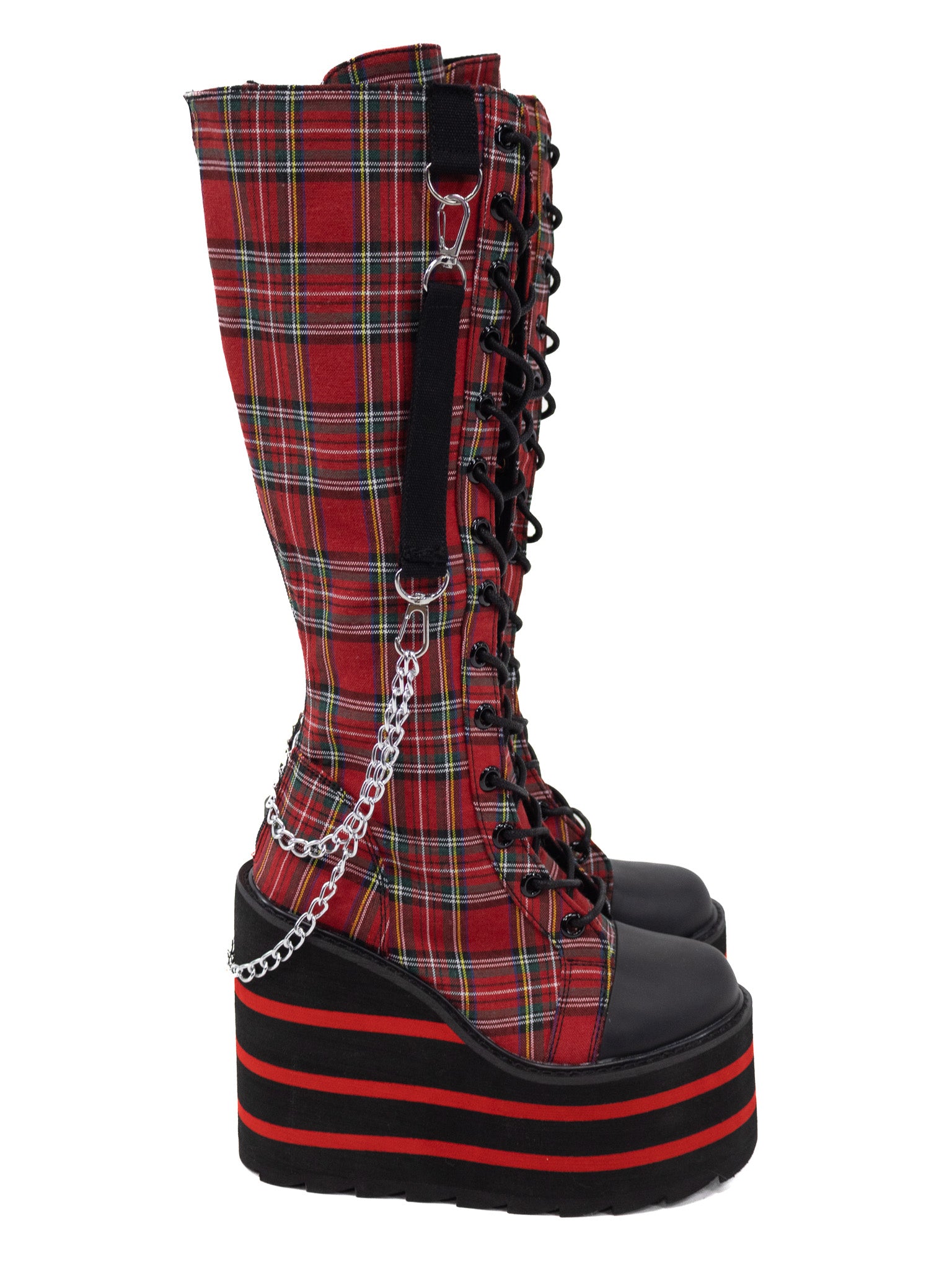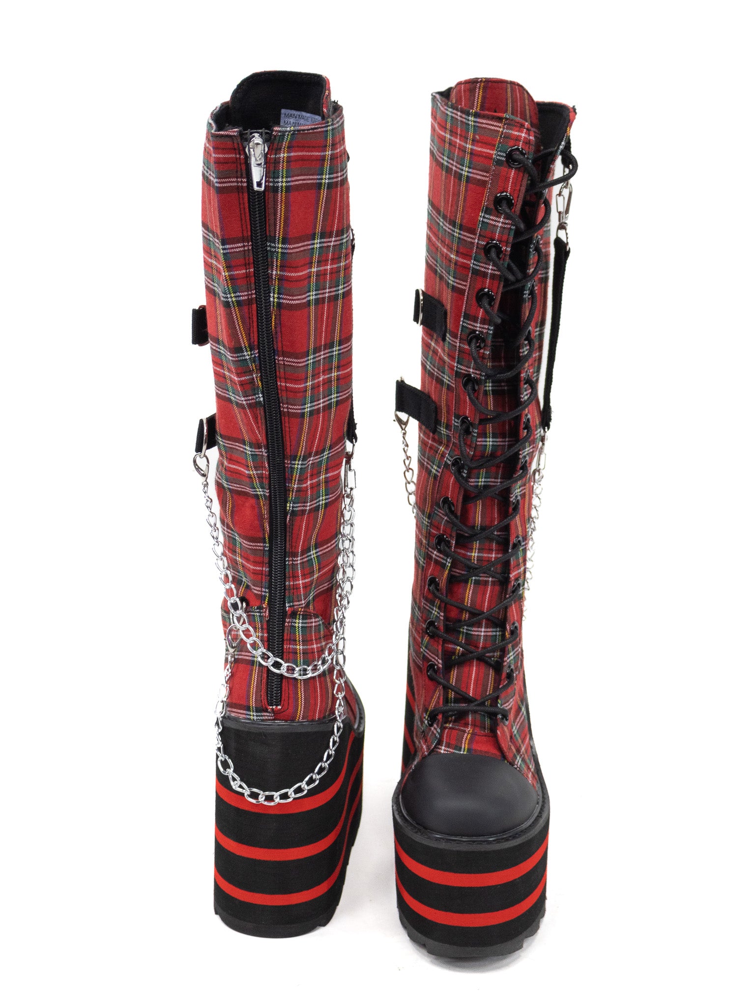 The Detention Bondage Boot features a canvas upper in a striking red plaid design. It is adorned with silver chrome chain and hardware detailing for added edge. A black rubber toe cap further enhances its durability, while the striped EVA bottom and black rubber outsole provide reliable traction. The 3 inch platform and 6 inch heel add height and sophistication to this design, finished with a sleek black back zipper closure.