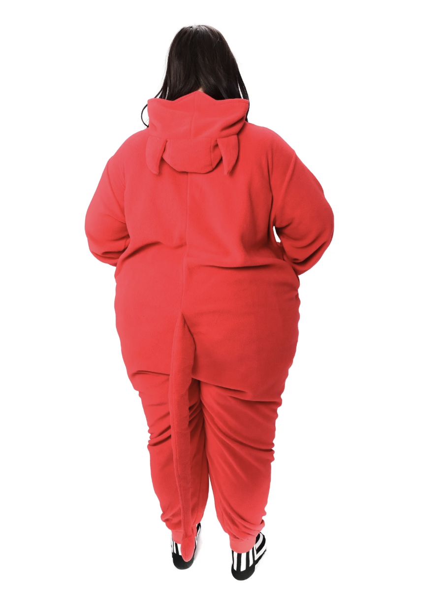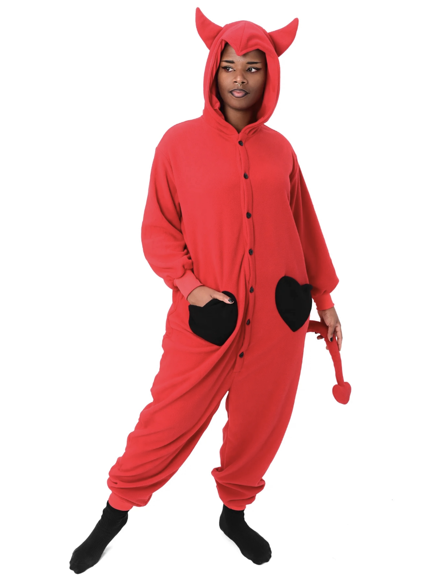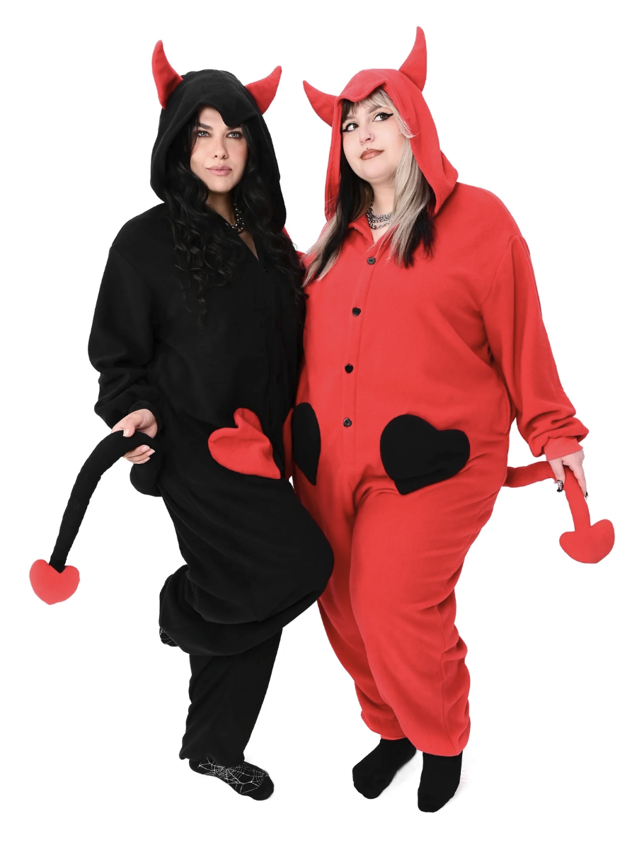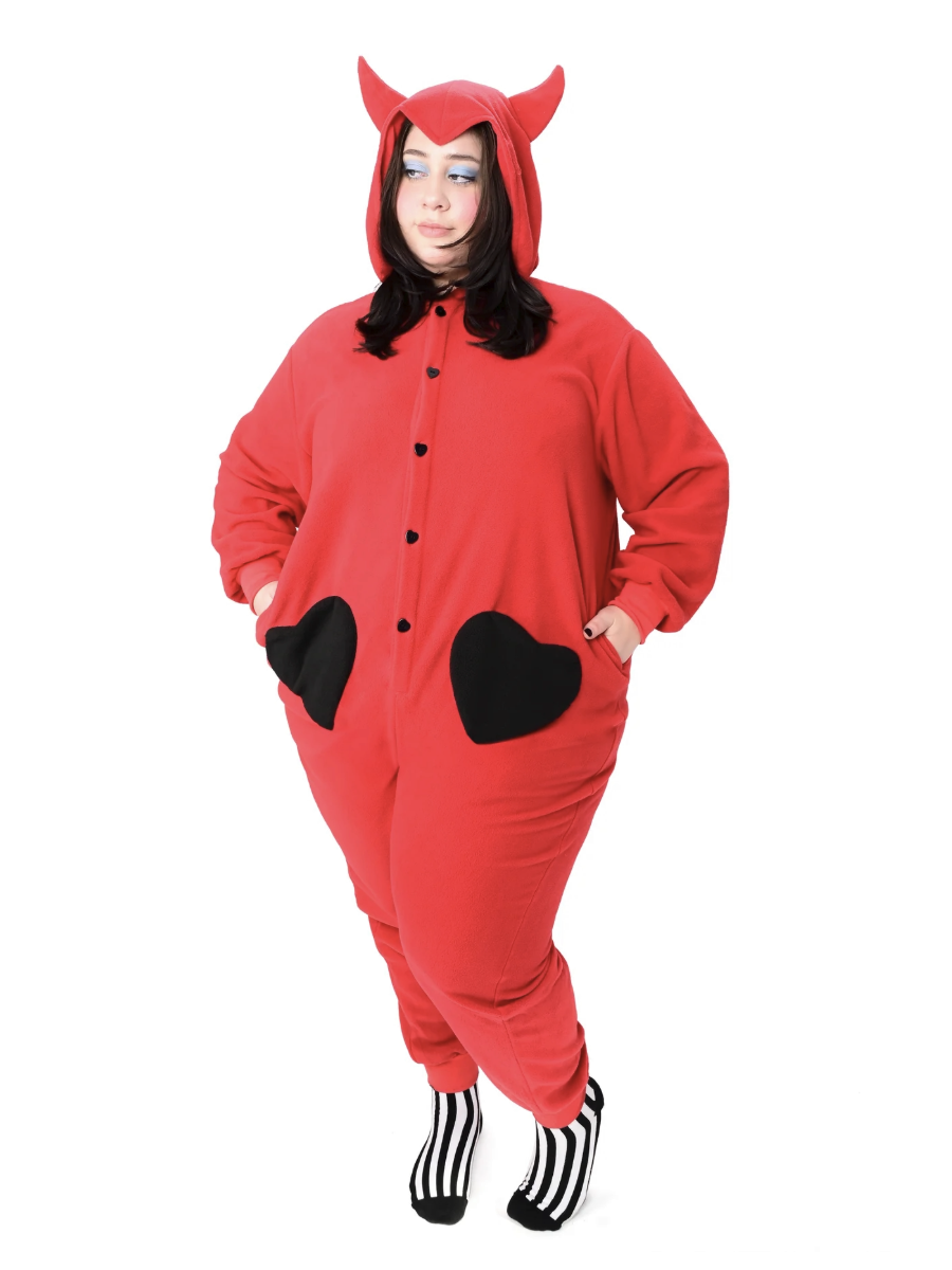 This onesie features a pointed hood with black devil horns and a little heart tail. Black front heart pockets as well as side pockets.