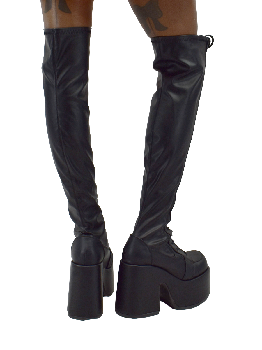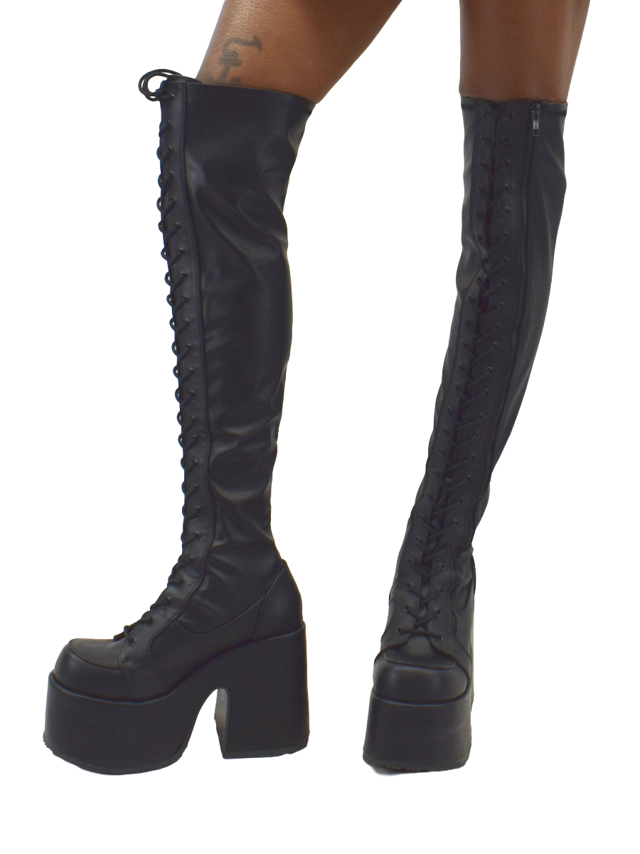 5" Chunky Heel, 3" Platform Lace-Up Stretch Thigh-High Boot, Full Length Outside Metal Zipper