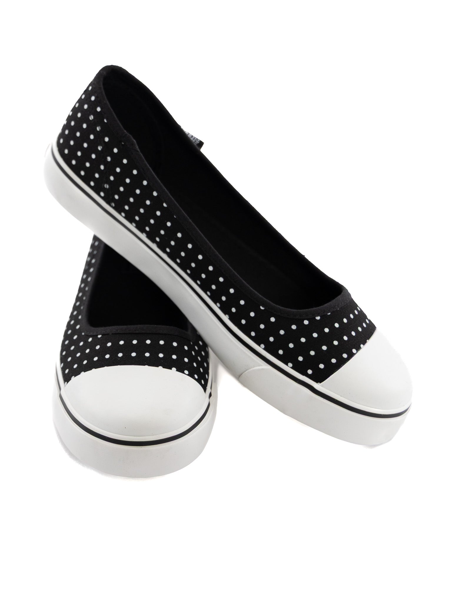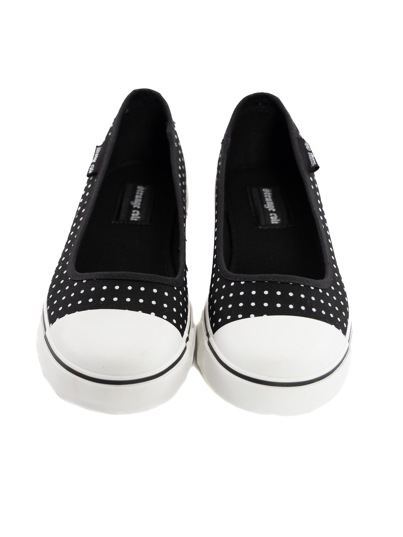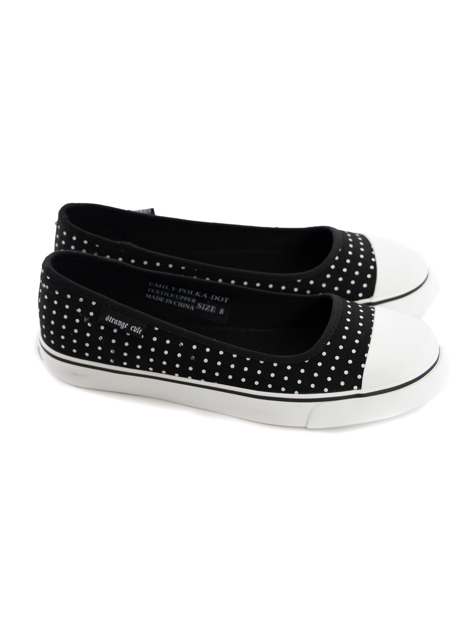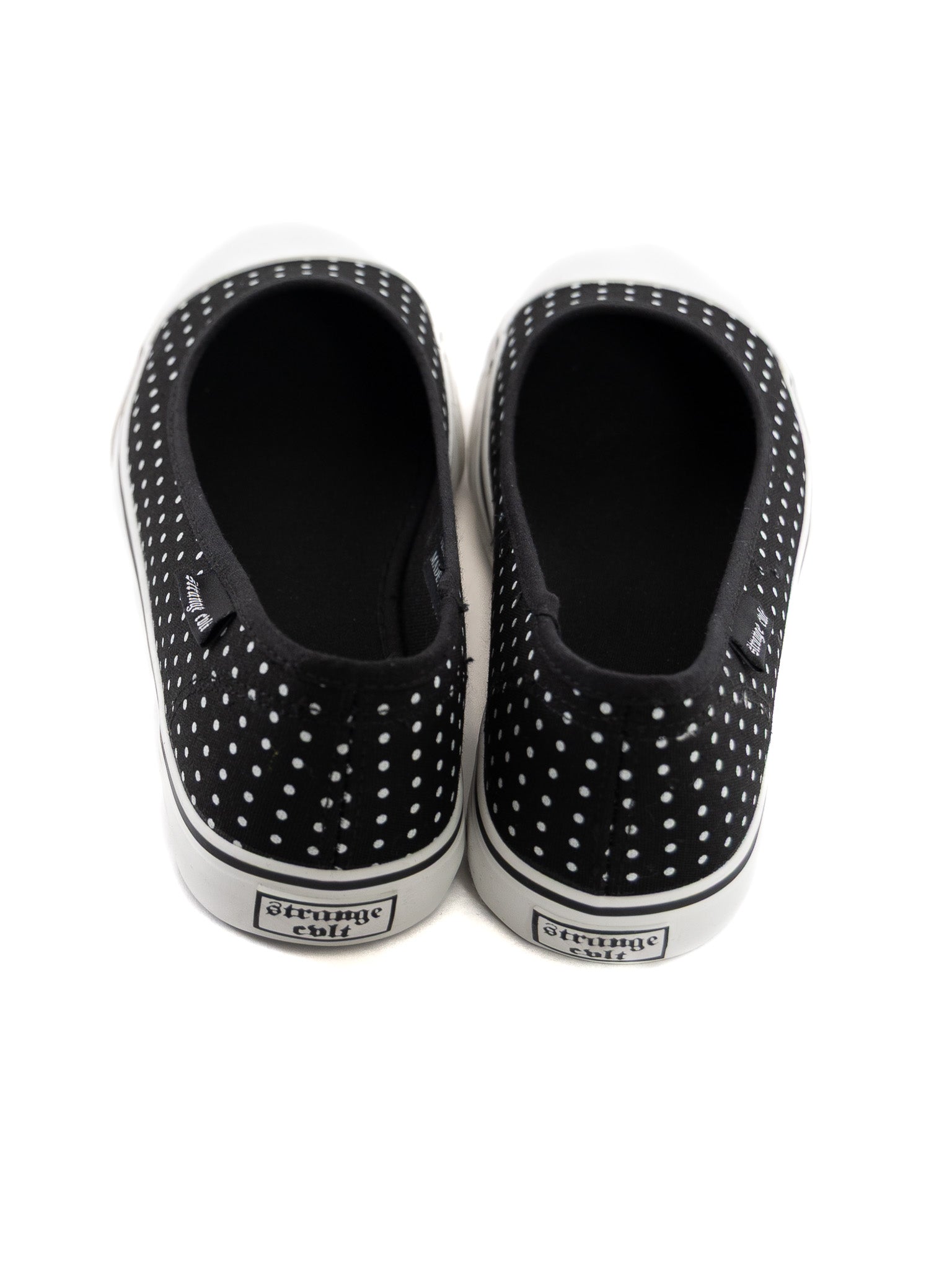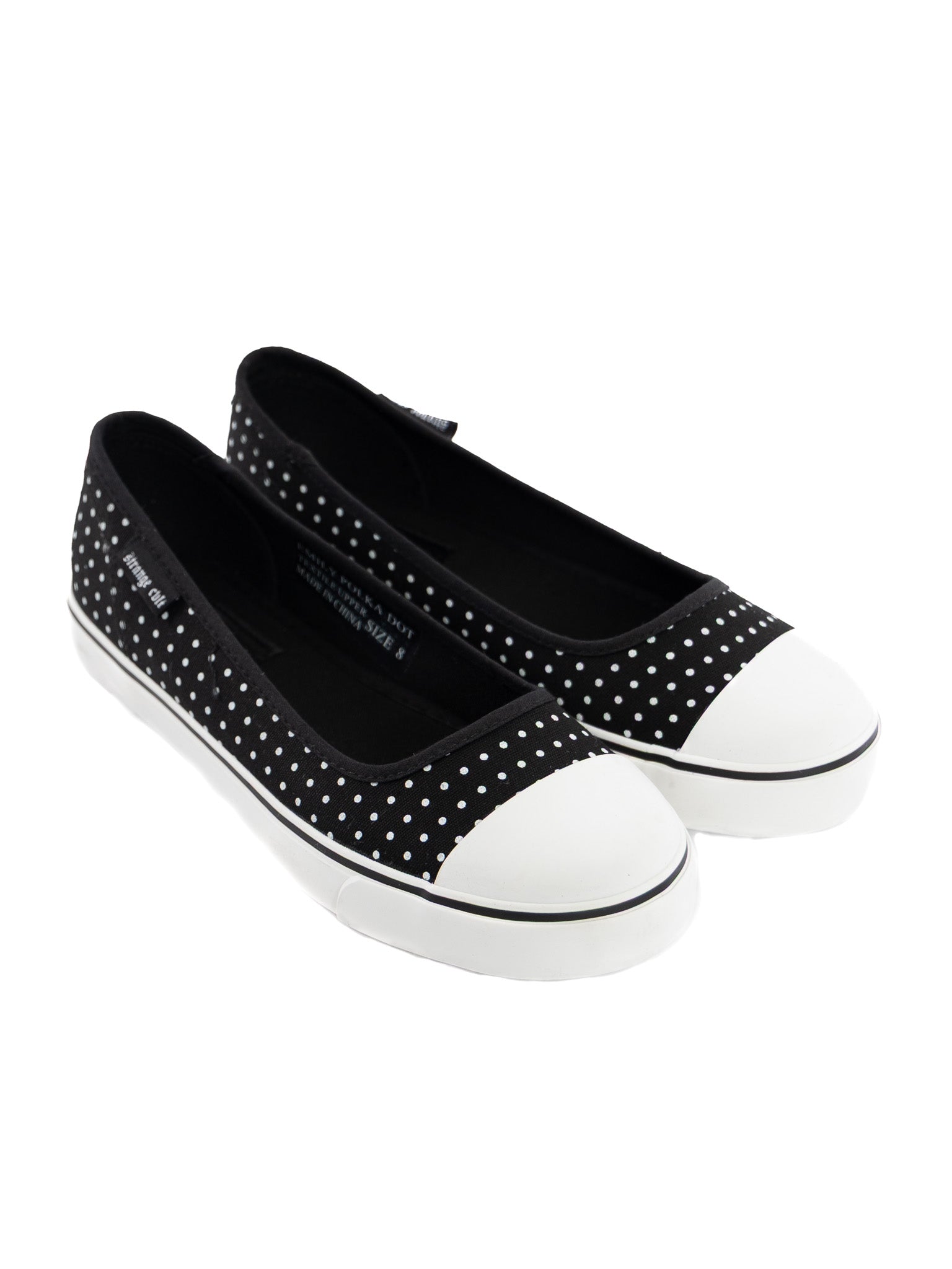 Treat yourself to a blast from the past with these sneaker flats. Featuring a sleek black canvas upper with a printed white polka dot detail, these mid 2000's dream shoes are both edgy and comfortable. Finished with a black canvas lining and sock, and a white rubber outsole and toe cap.