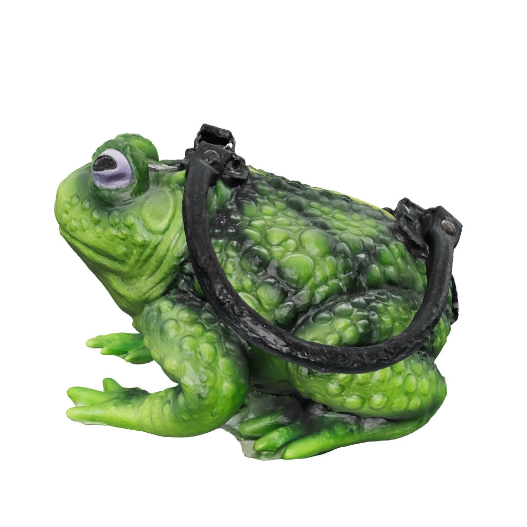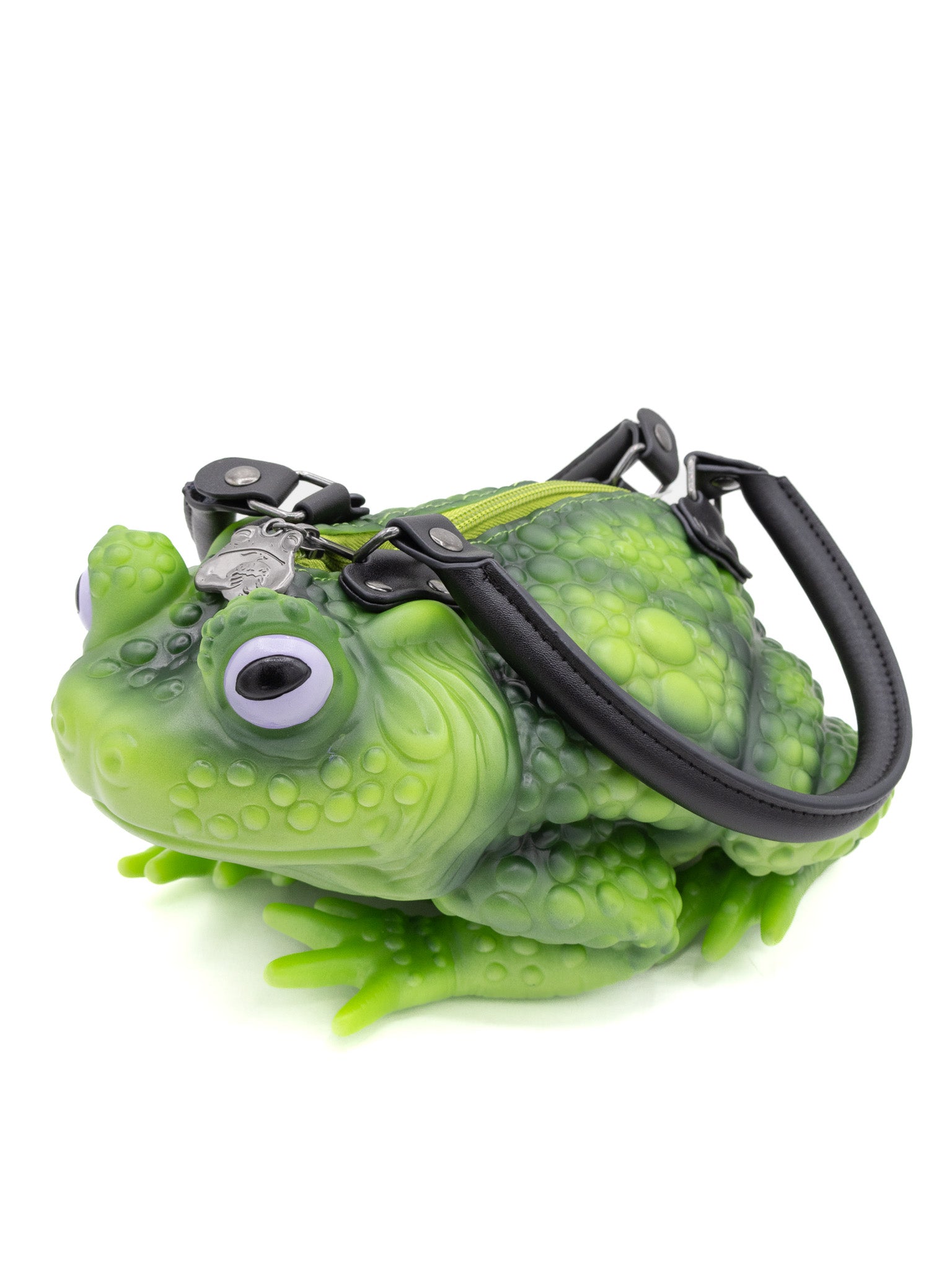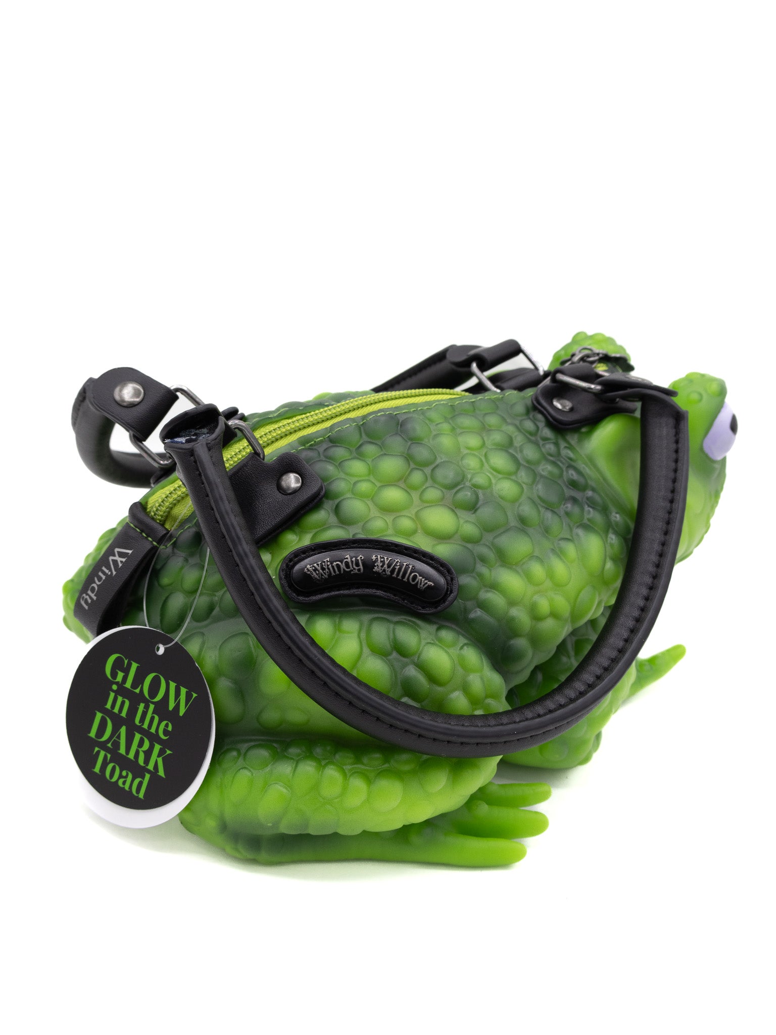 This green toad bag from Windy Willow is made from soft vinyl with glow-in-the-dark body and lilac glow eyes, a deep red poly fabric lining, gunmetal details, and a zippered top closure. The two handles are removable, and it includes a removable black adjustable cross body strap. These toady babies are quite roomy inside! Measures approximately 11" long, 8" wide, and 4" tall.