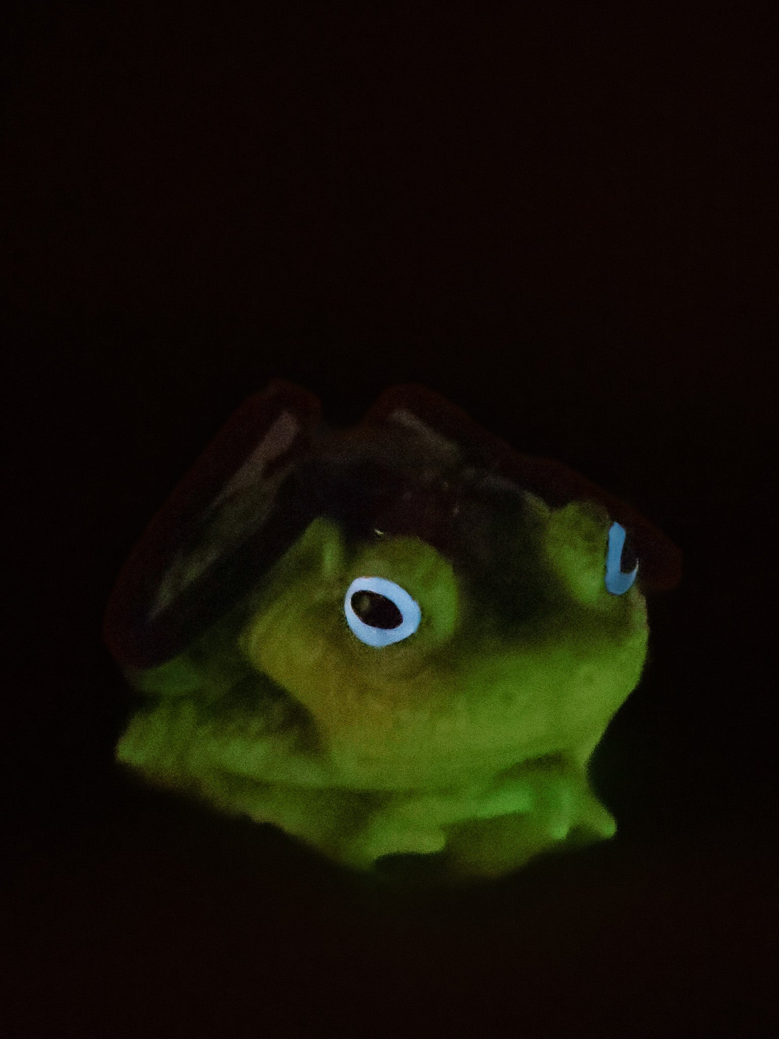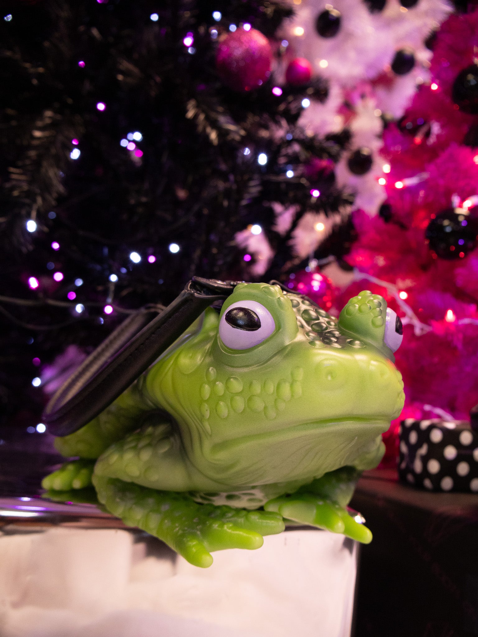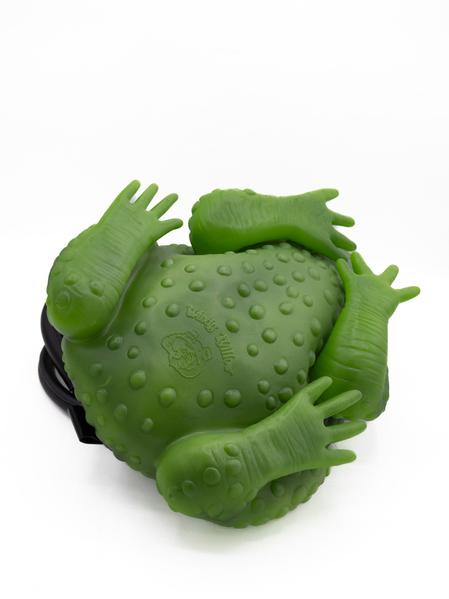 This green toad bag from Windy Willow is made from soft vinyl with glow-in-the-dark body and lilac glow eyes, a deep red poly fabric lining, gunmetal details, and a zippered top closure. The two handles are removable, and it includes a removable black adjustable cross body strap. These toady babies are quite roomy inside! Measures approximately 11" long, 8" wide, and 4" tall.