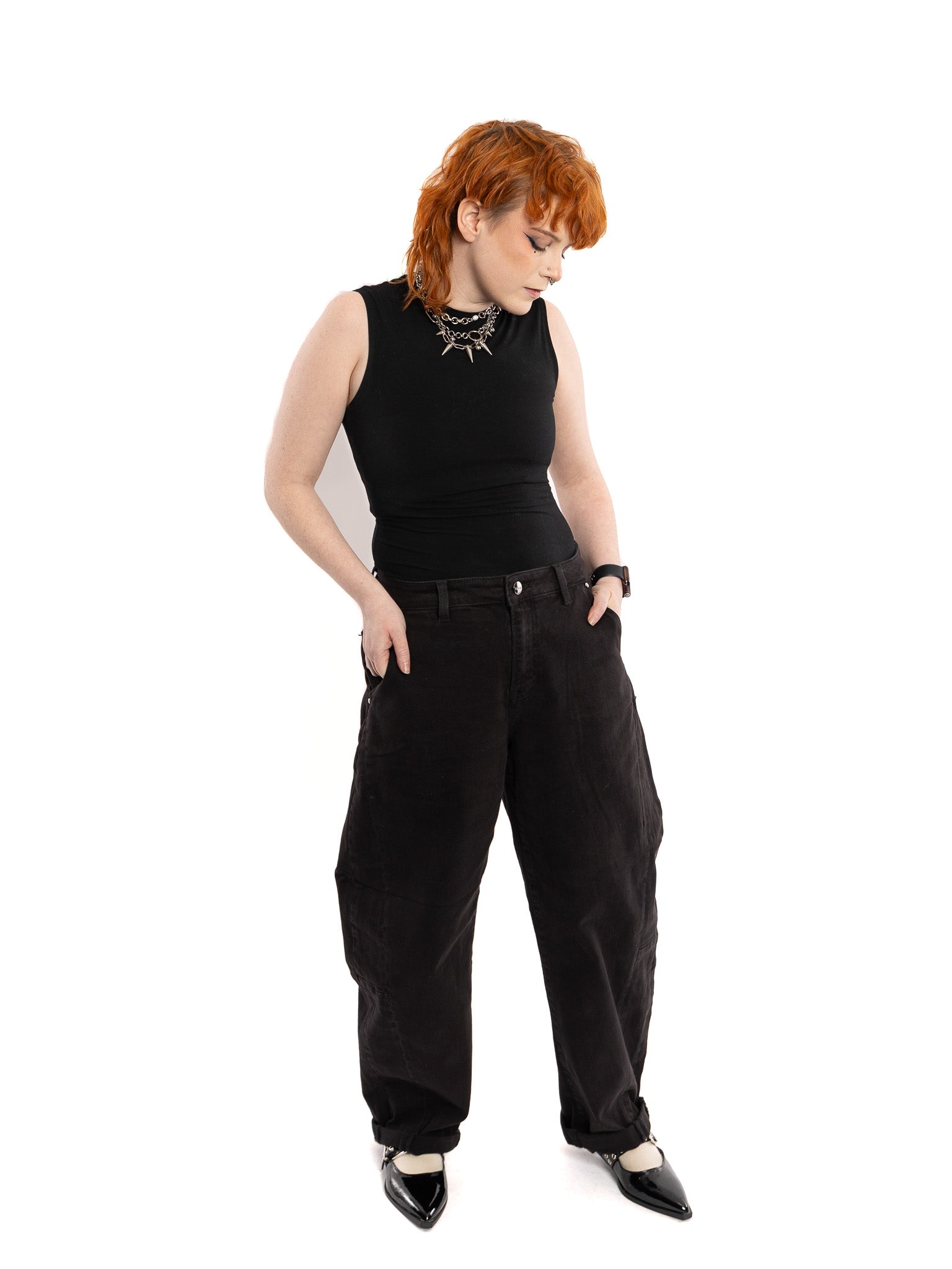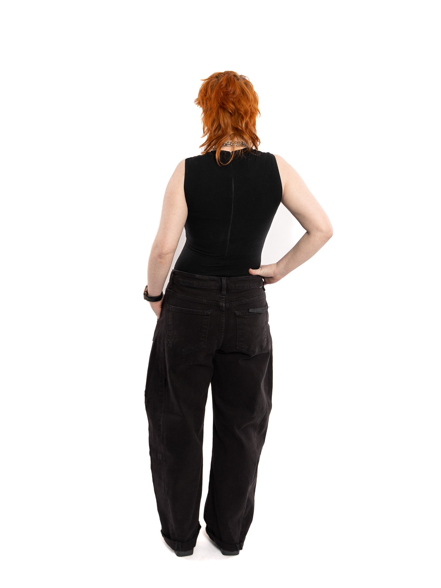 Black denim, relaxed fit barrel jeans with cuffs, a perfect wardrobe basic. Belt loops, zipper & button fly, front and back pockets. Cuff can be released if desired.