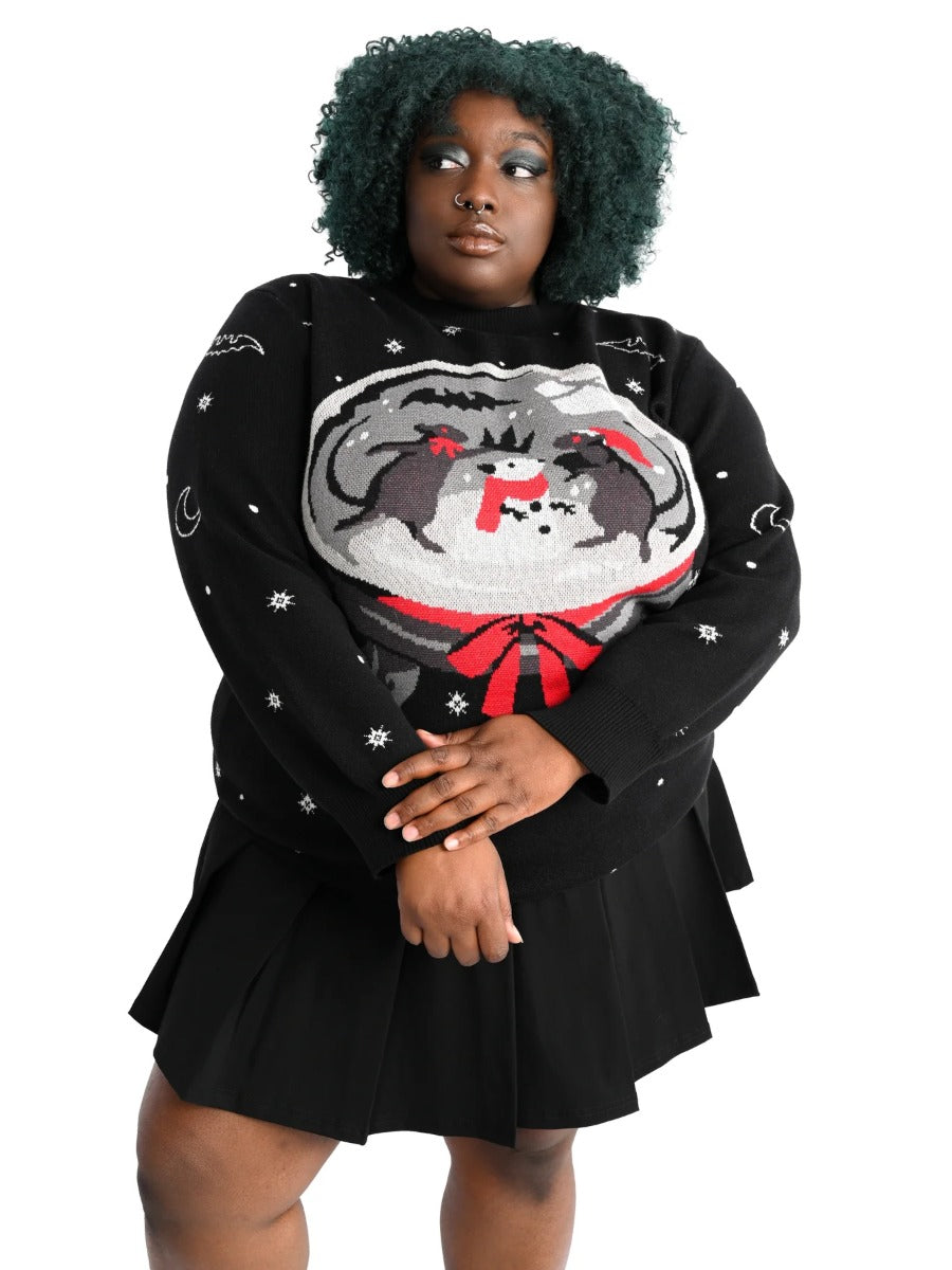 Soft pullover sweater featuring 2 holiday rats in a snow globe building a snow rat.