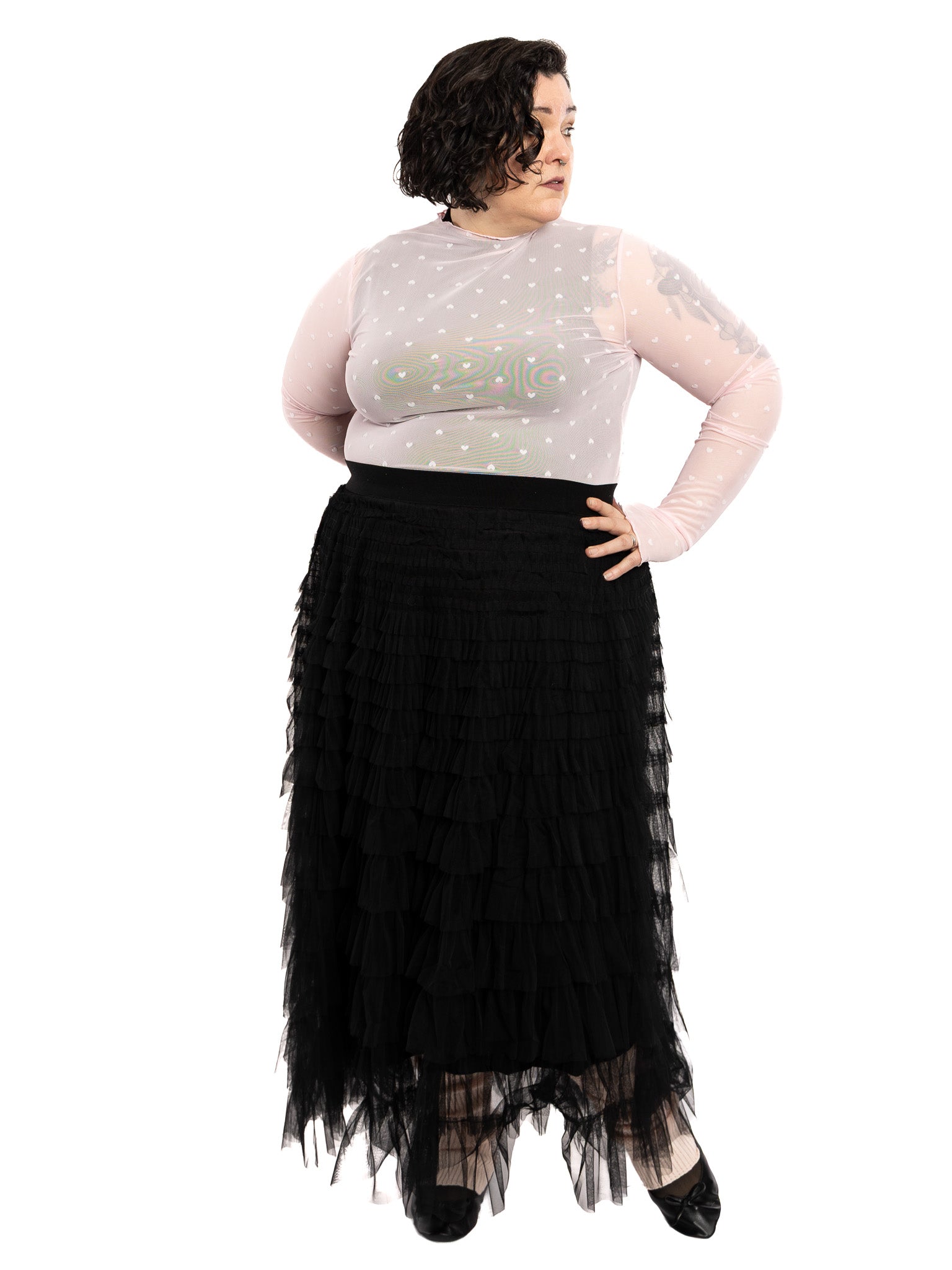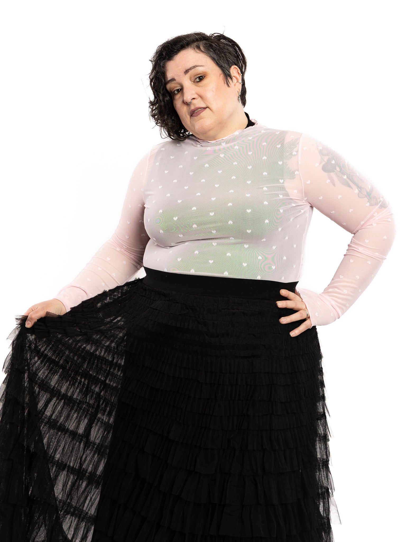 This pale pink sheer mesh top features hearts all over! Mock neckline, sleeves with flare cuffs, and over-the-hips length. Tuck it in or wear it out as a tunic top. This shirt is fully sheer, shown here layered over the Mock Neck Top.