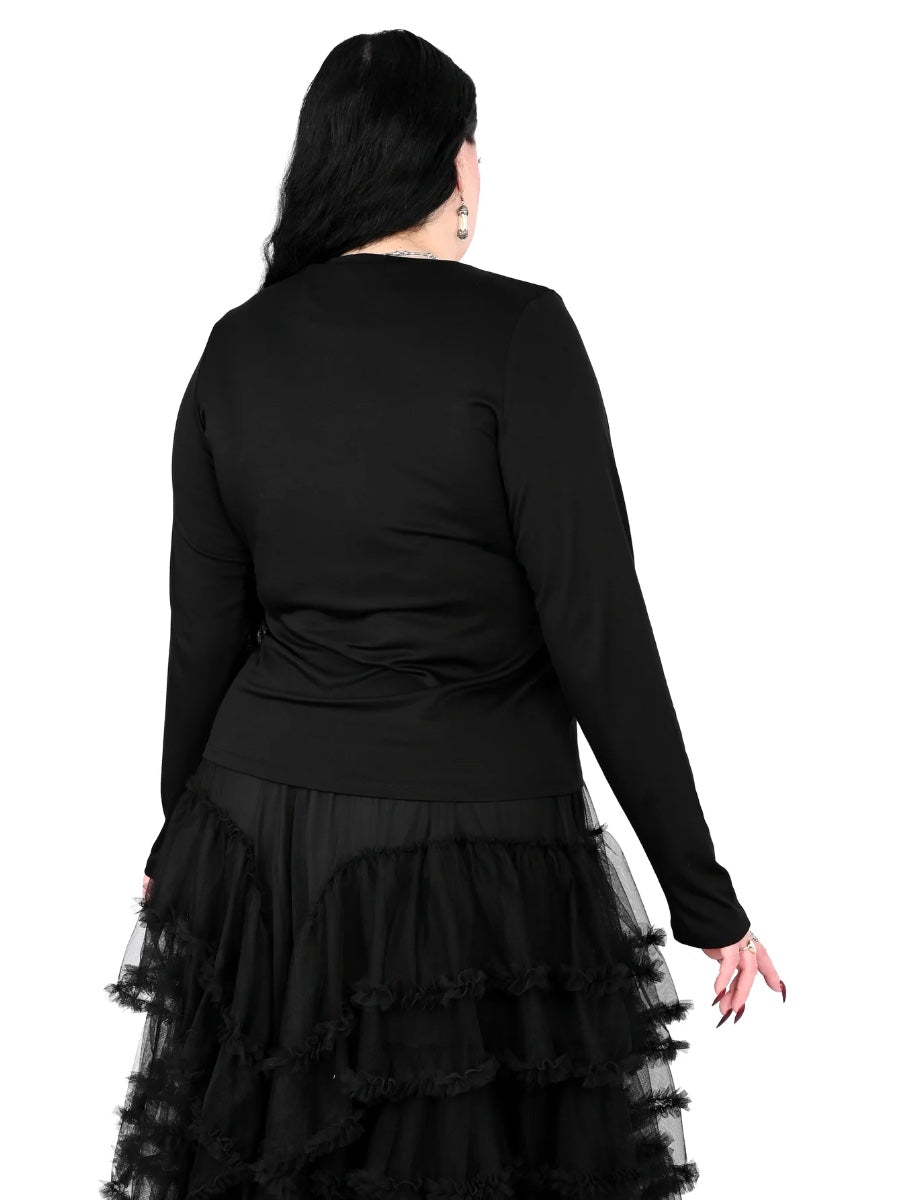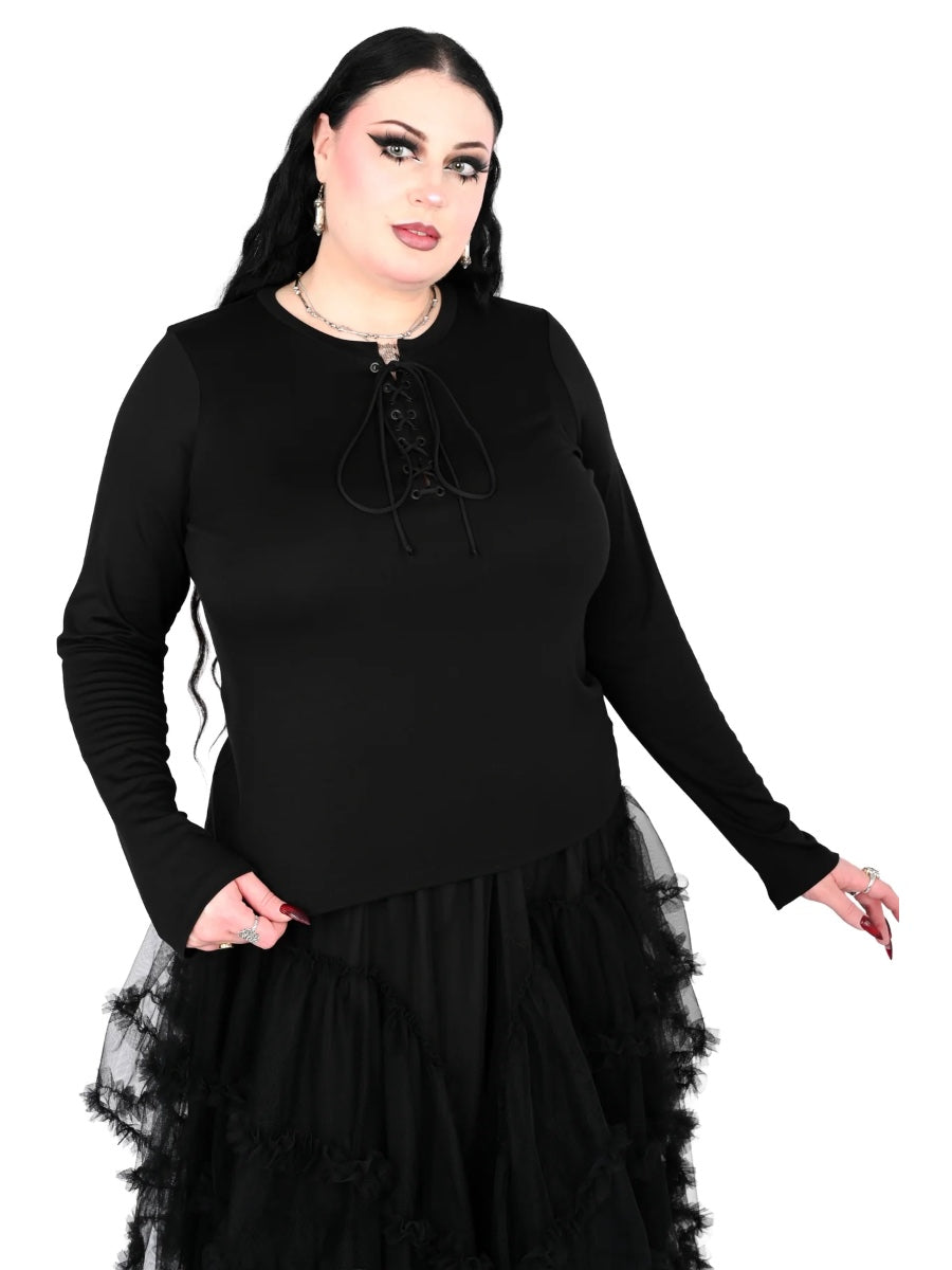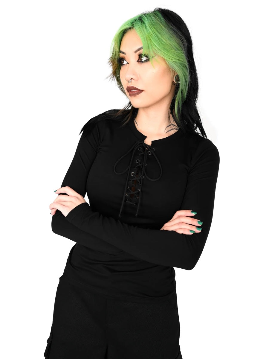 Long sleeve top with lace up front and black grommets.