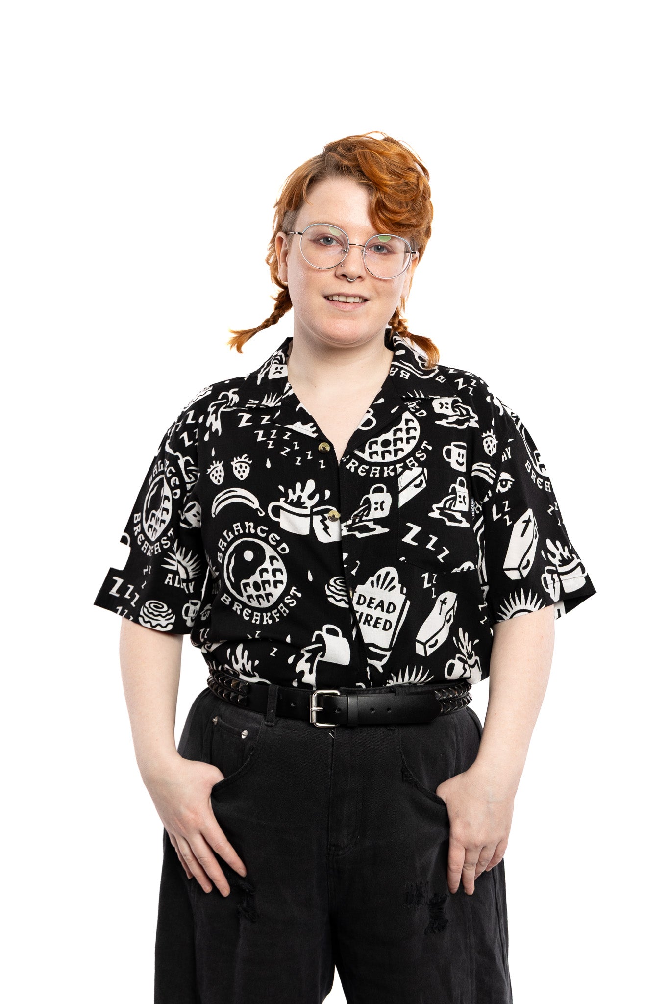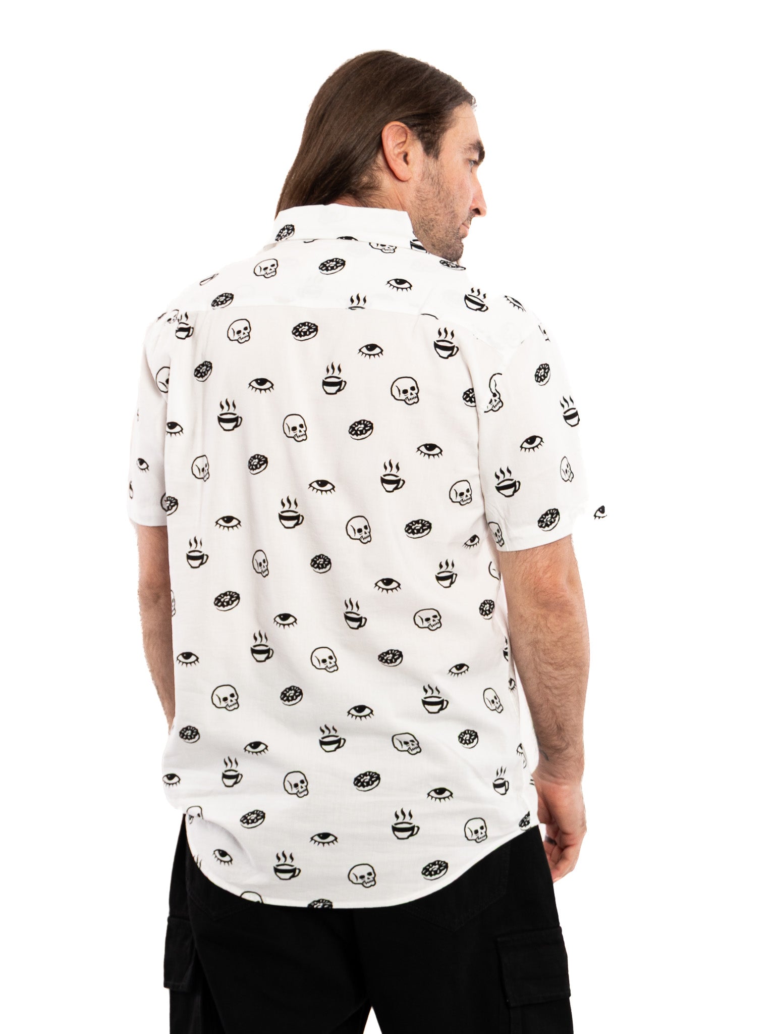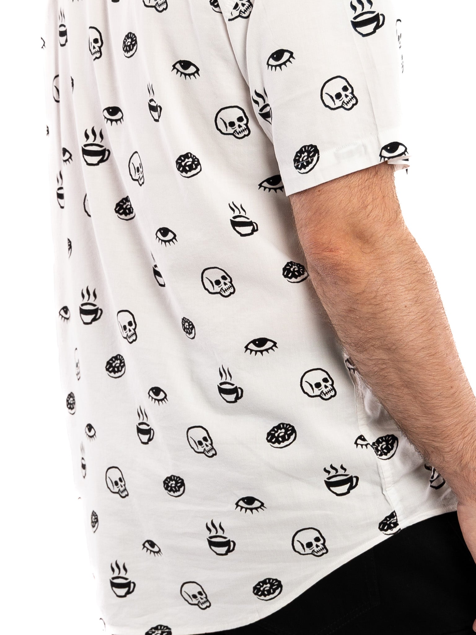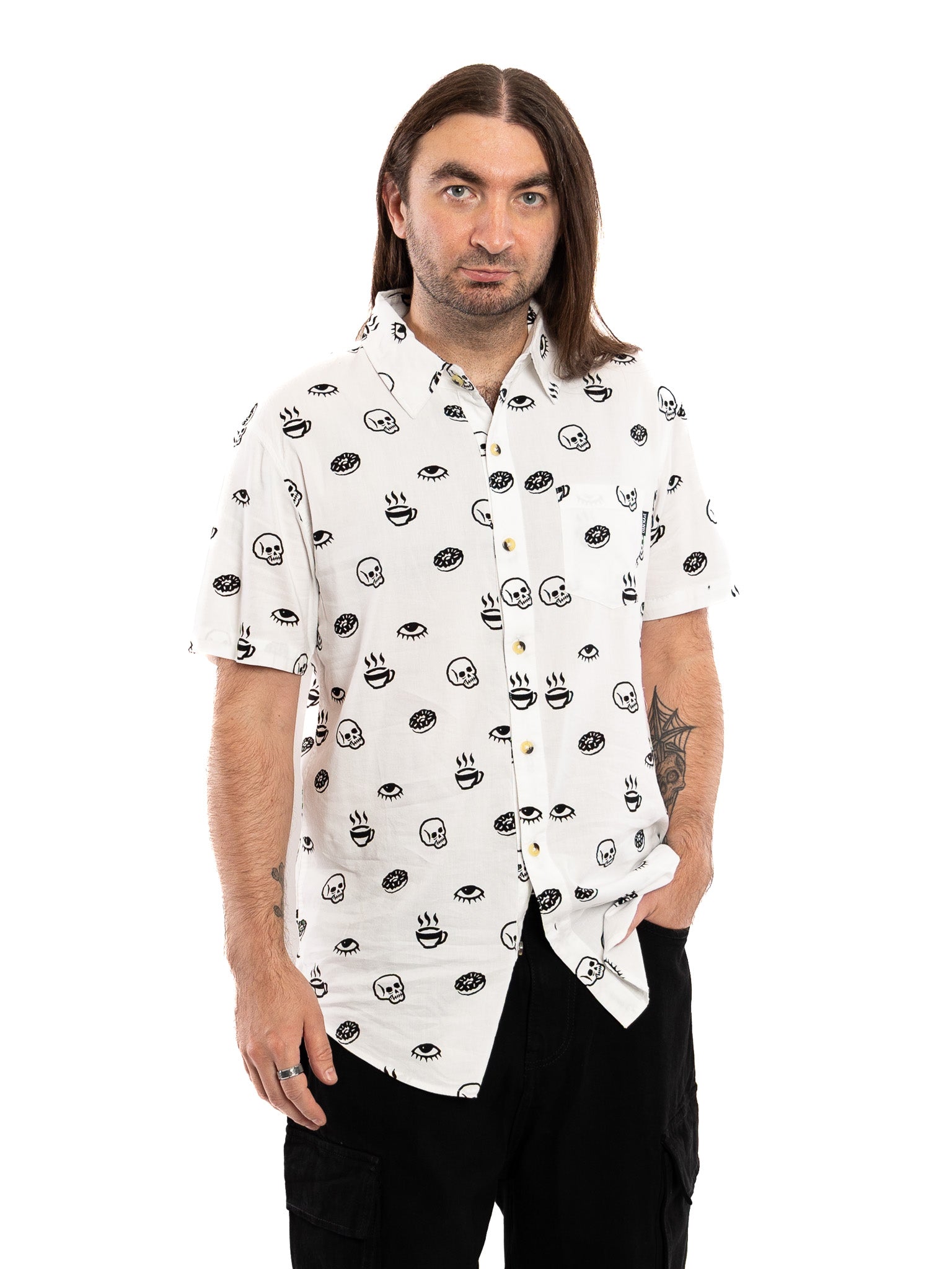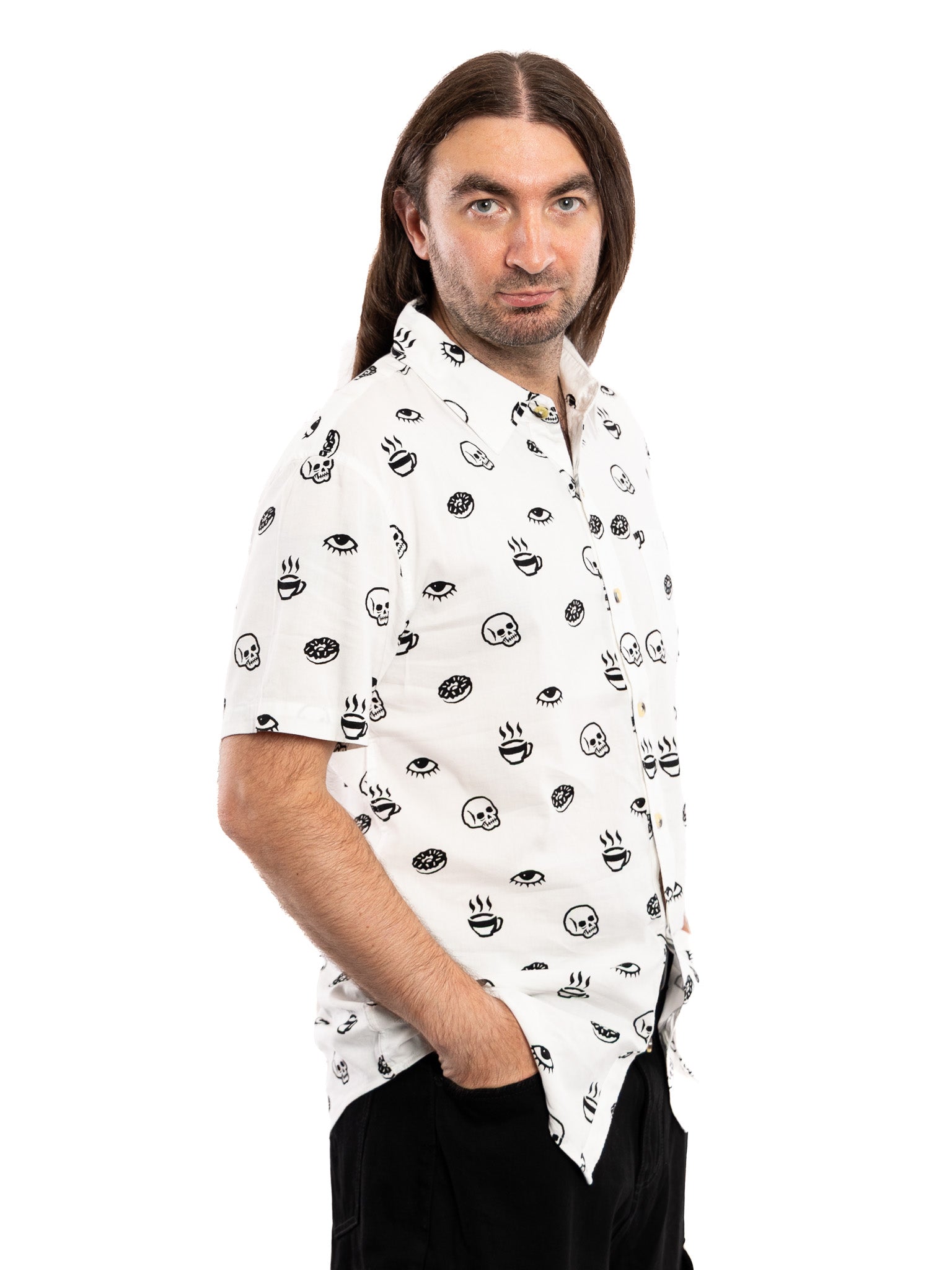 We're not really morning people, but this cute unisex button up has us ready to hop out of bed and run for a cup of coffee! This snappy button-up shirt from our friends at Pyknic is just the thing to start your day off right! It is made of 100% cotton poplin fabric and has tortoise buttons. This casual shirt features a bold all-over print of skulls, sleepy eyes, donuts, and cups of steamy coffee! Stay sophisticated while not-so-subtly letting everyone know you're always up for a damn fine cup of coffee. Left breast pocket, tortoise buttons.
