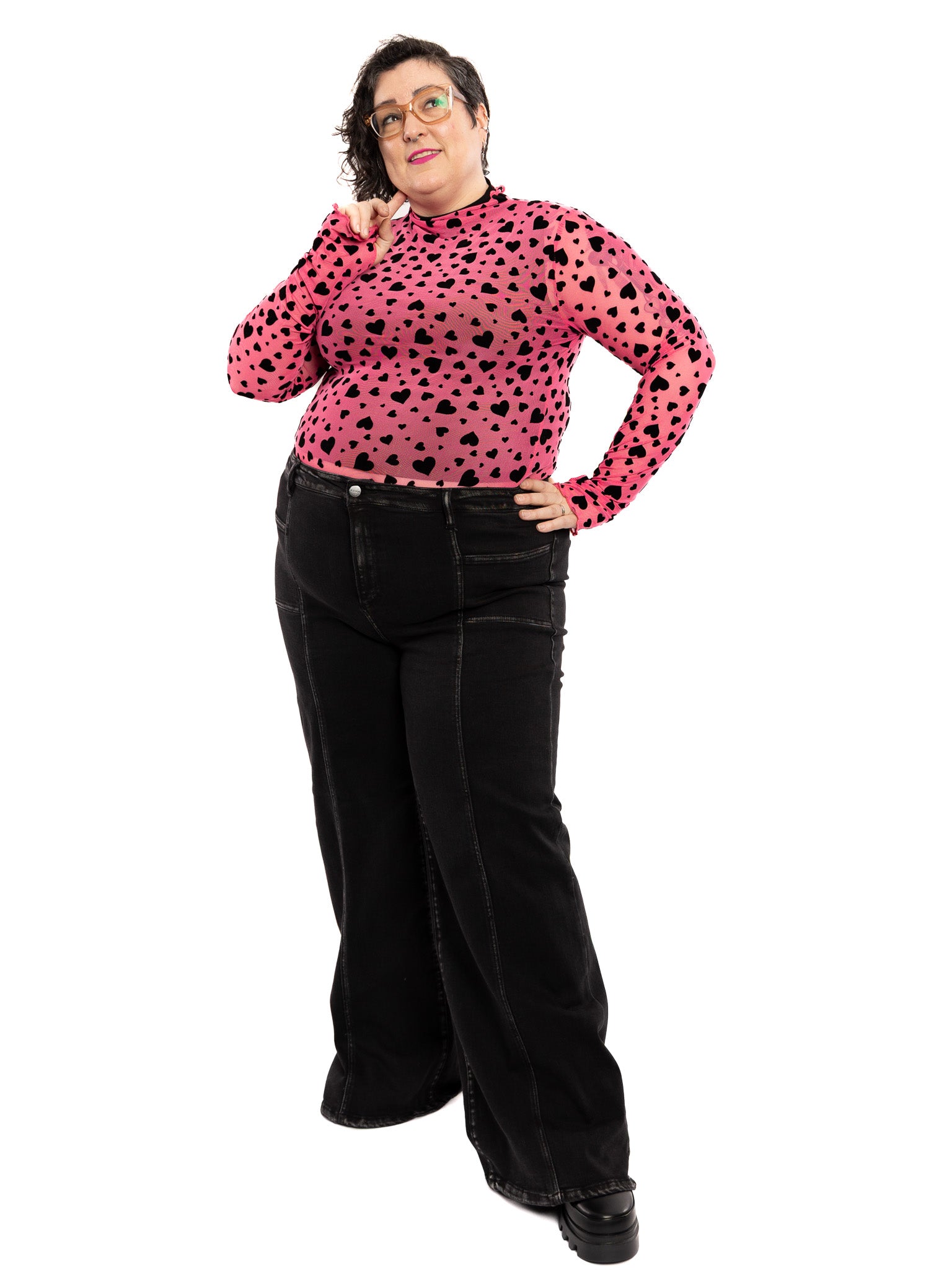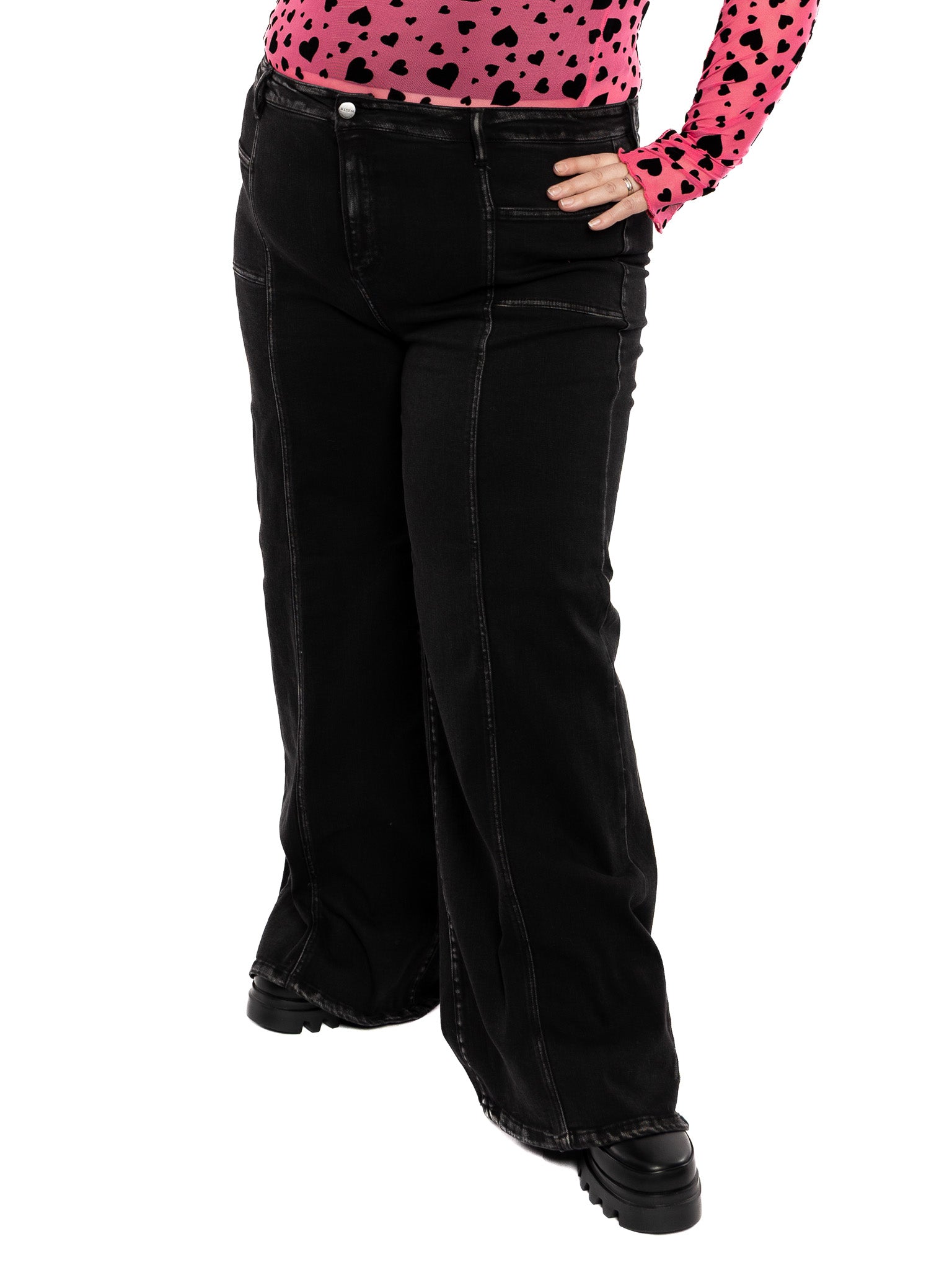These mid-rise wide leg black denim jeans feature front leg seams and patch pockets with subtle fading along the seams.