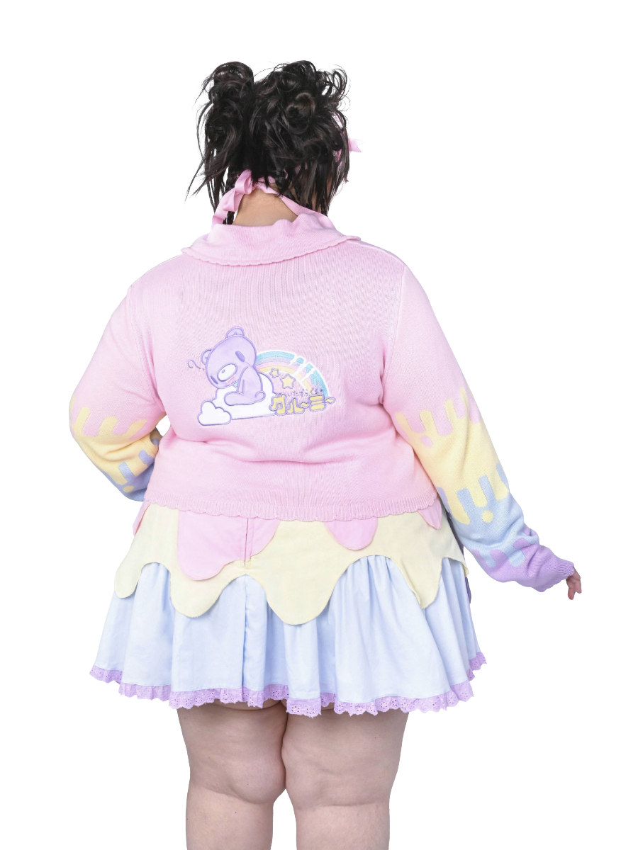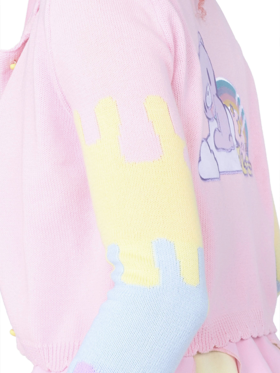 This pastel pink cardigan playfully features knit drip designs on the sleeves, a Gloomy Bear applique on the back, and a cute small emblem on the front. Finished with a Peter Pan collar and charming heart-shaped buttons, it matches perfectly with the Pastel Drip Skirt and Pastel Drip Legwarmers.