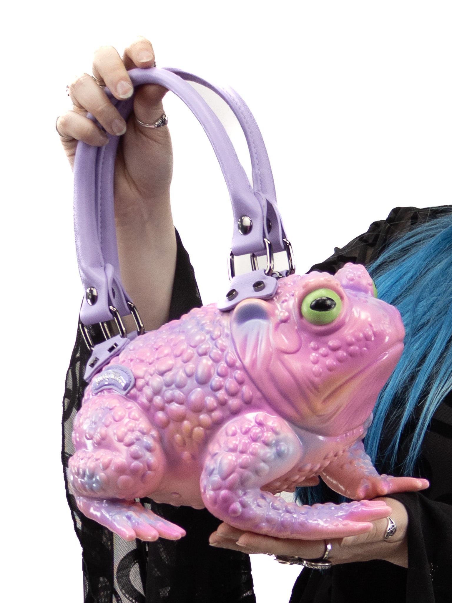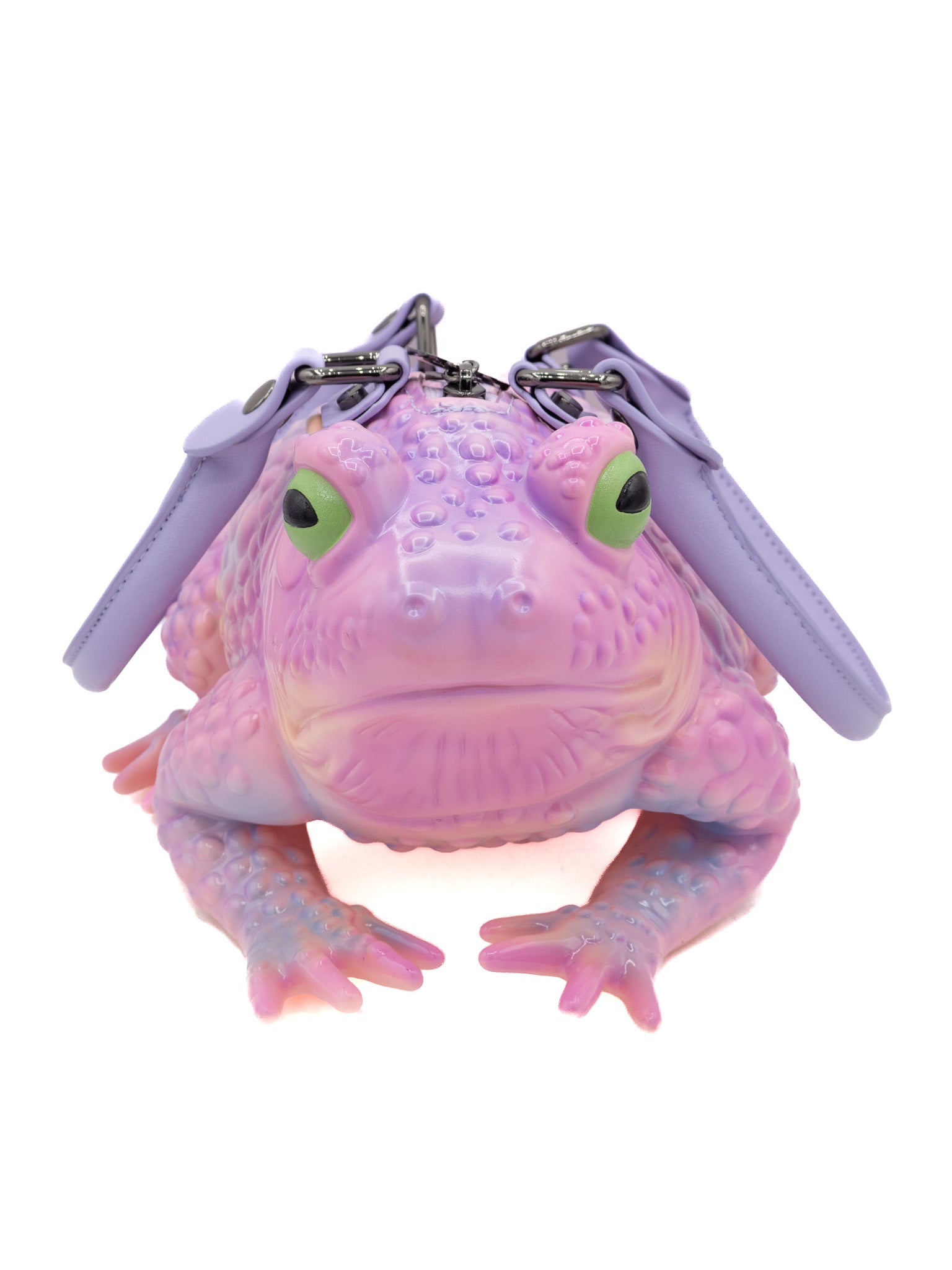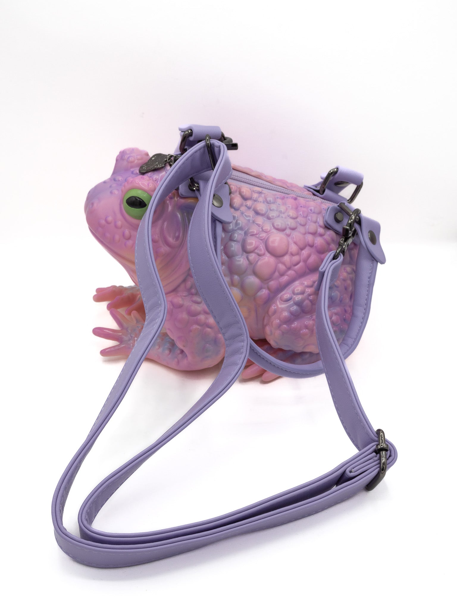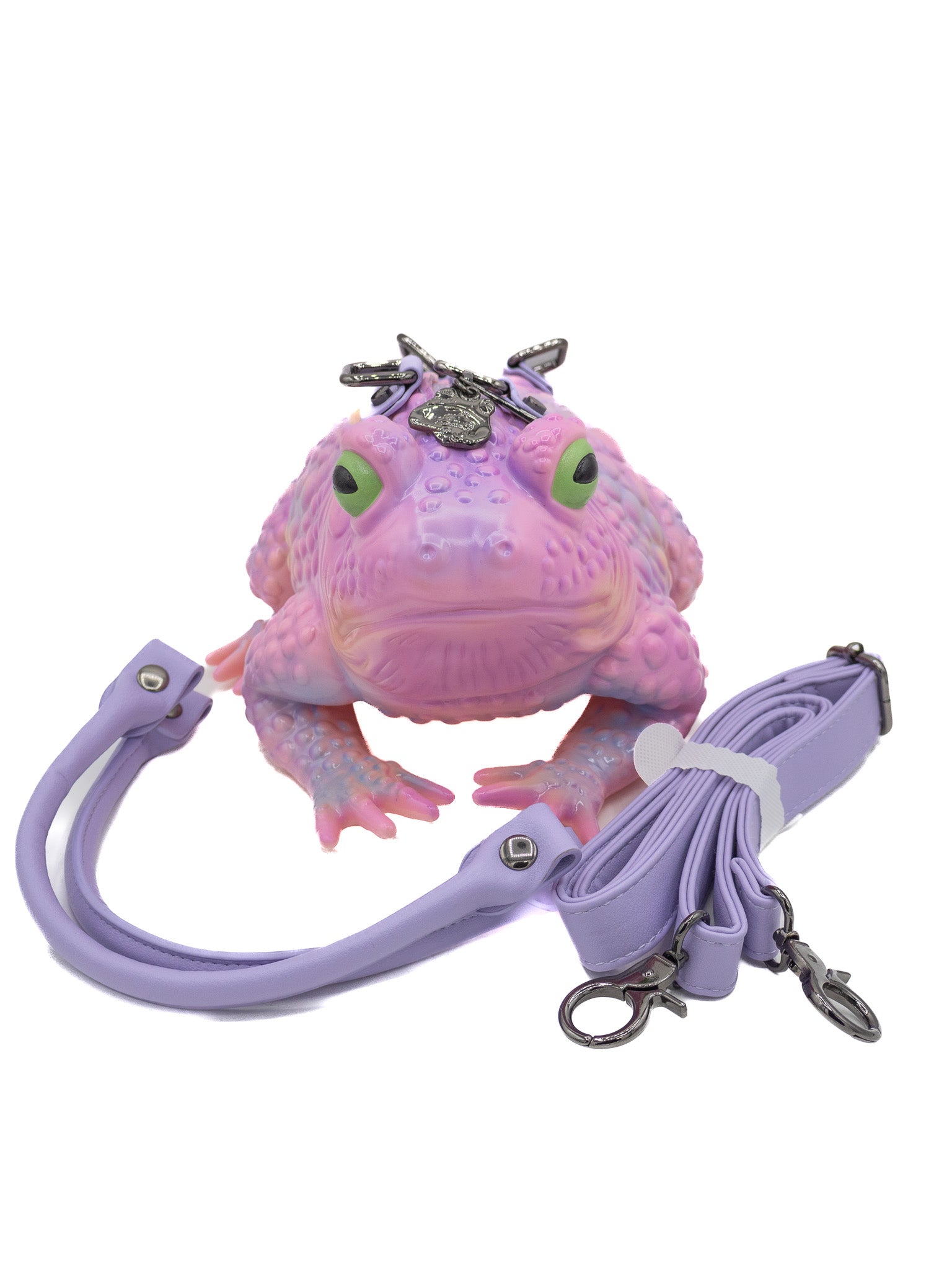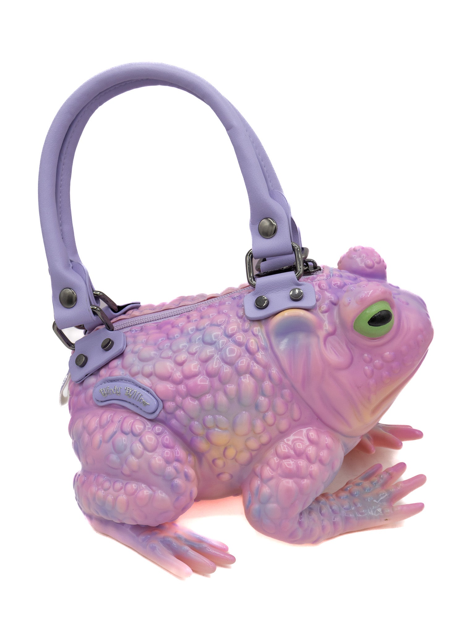 This pastel toad bag from Windy Willow is made from soft vinyl with glow-in-the-dark green eyes, a lavender poly fabric lining, gunmetal hardware, and a zippered top closure. The two handles are removable, and it includes a removable lavender adjustable cross body strap. These toady babies are quite roomy inside! Measures approximately 11" long, 8" wide, and 4" tall.
