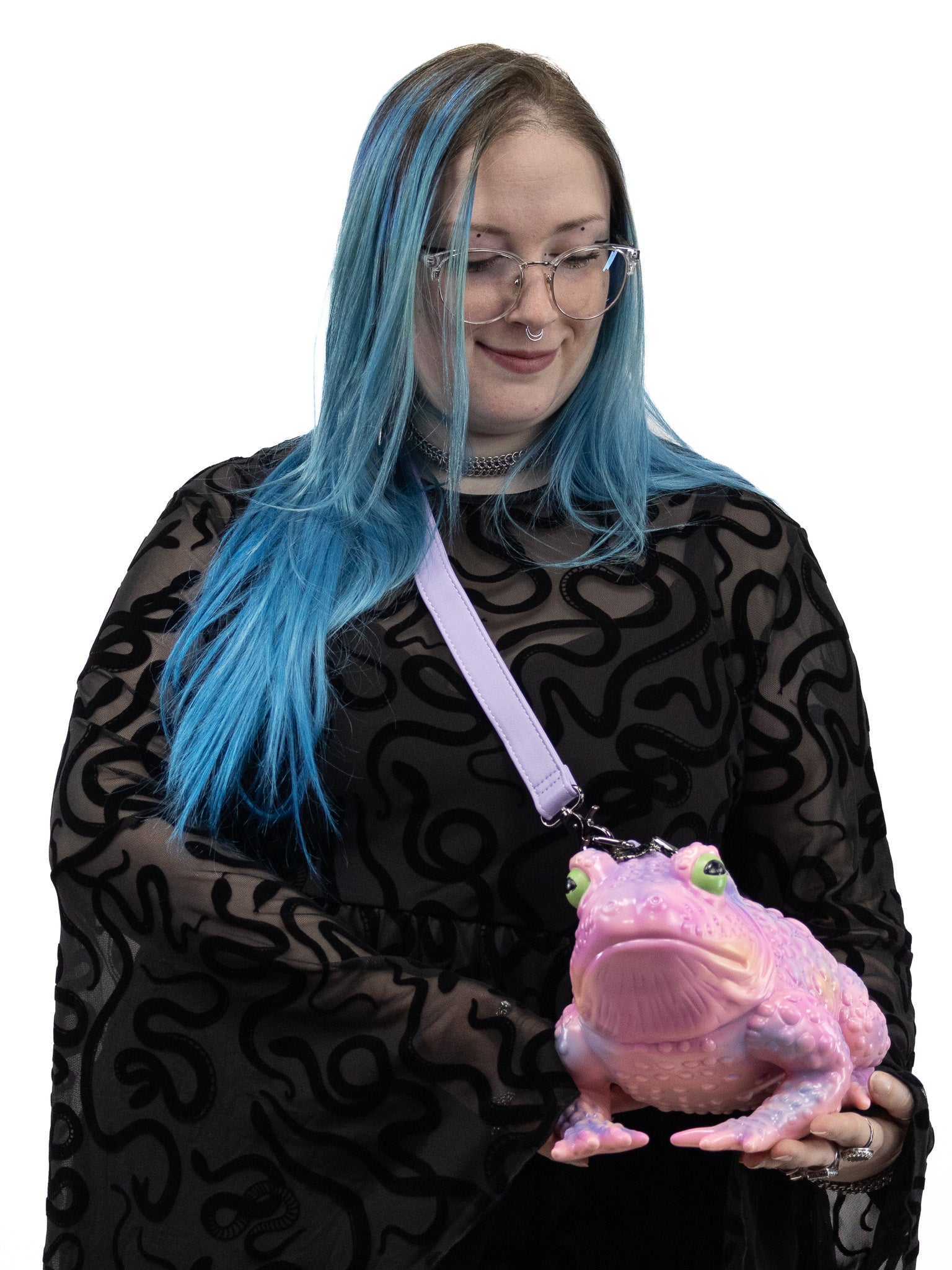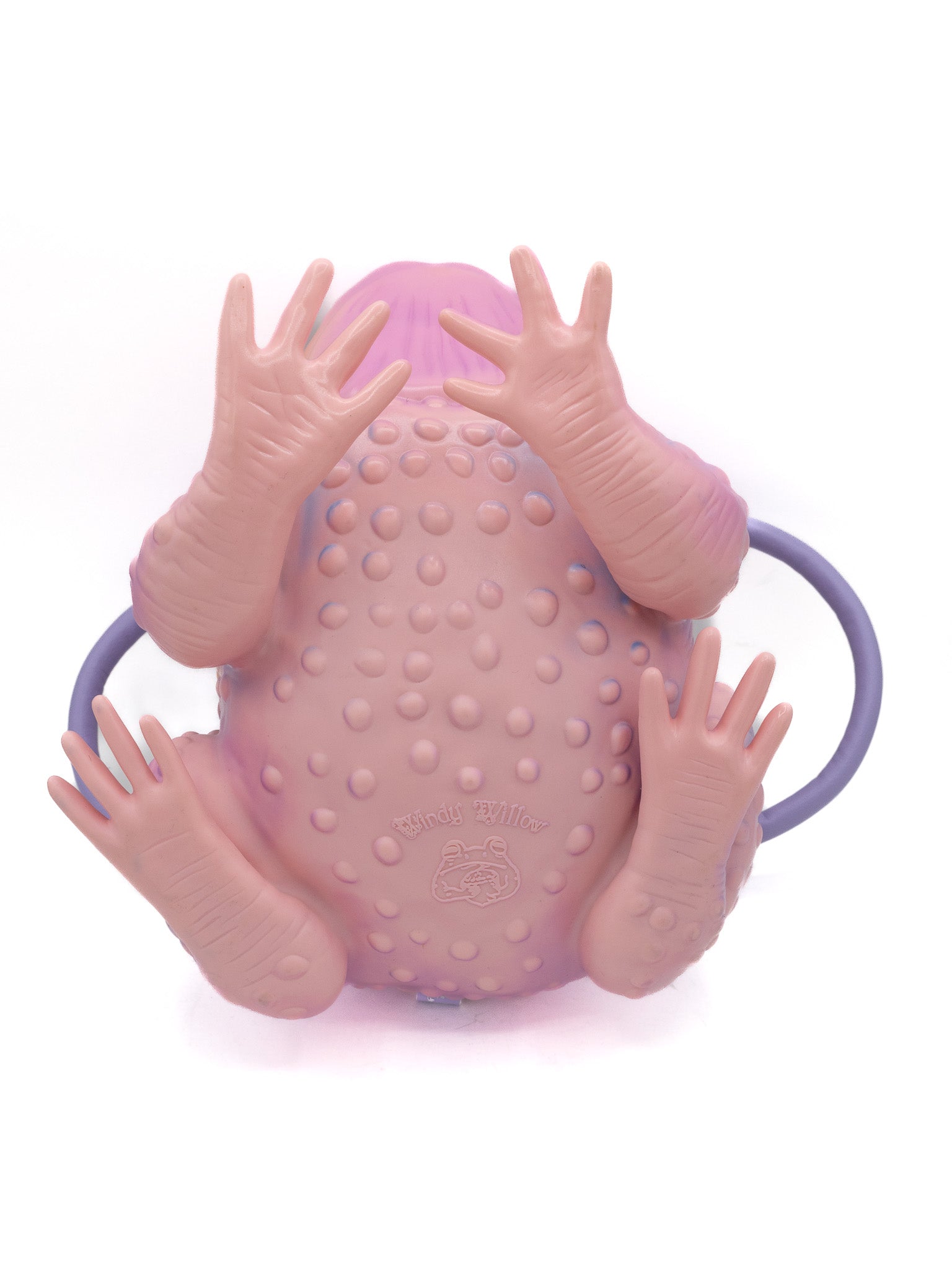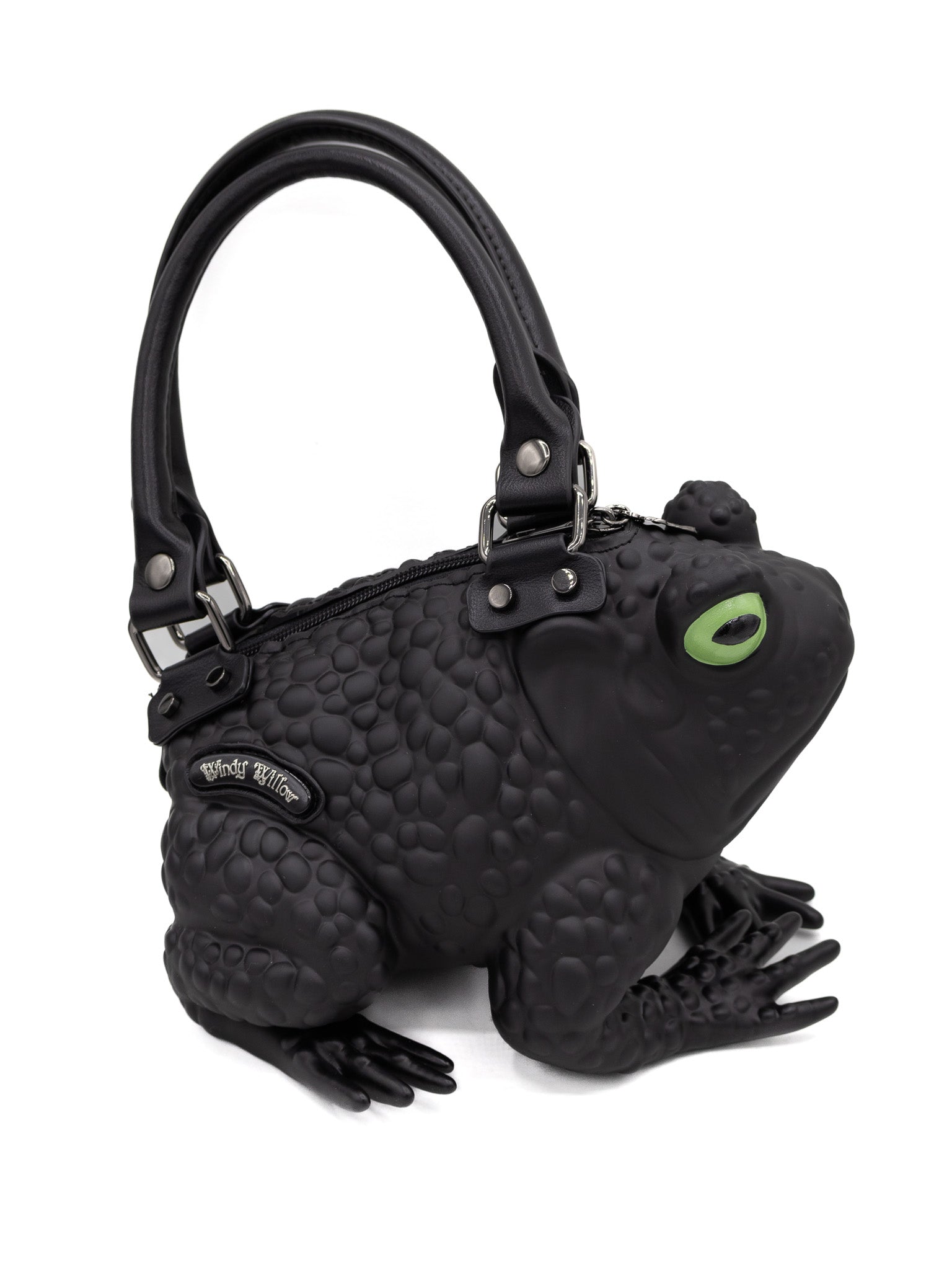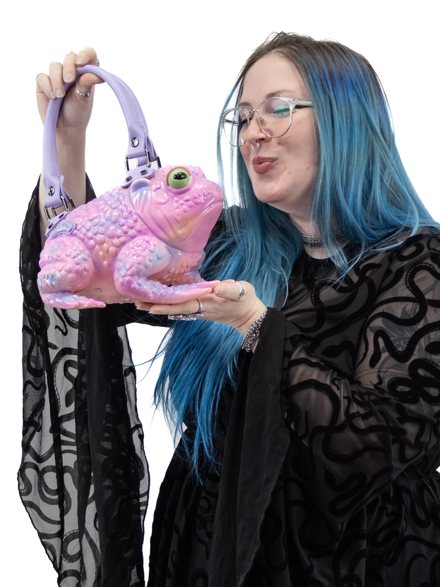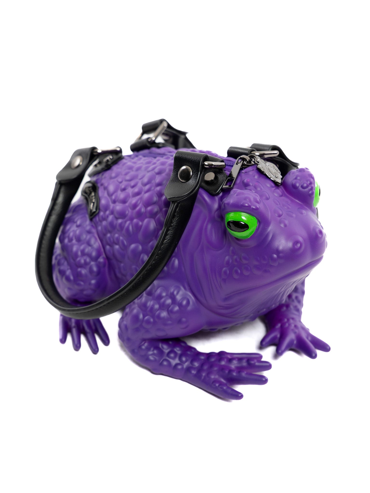 This pastel toad bag from Windy Willow is made from soft vinyl with glow-in-the-dark green eyes, a lavender poly fabric lining, gunmetal hardware, and a zippered top closure. The two handles are removable, and it includes a removable lavender adjustable cross body strap. These toady babies are quite roomy inside! Measures approximately 11" long, 8" wide, and 4" tall.