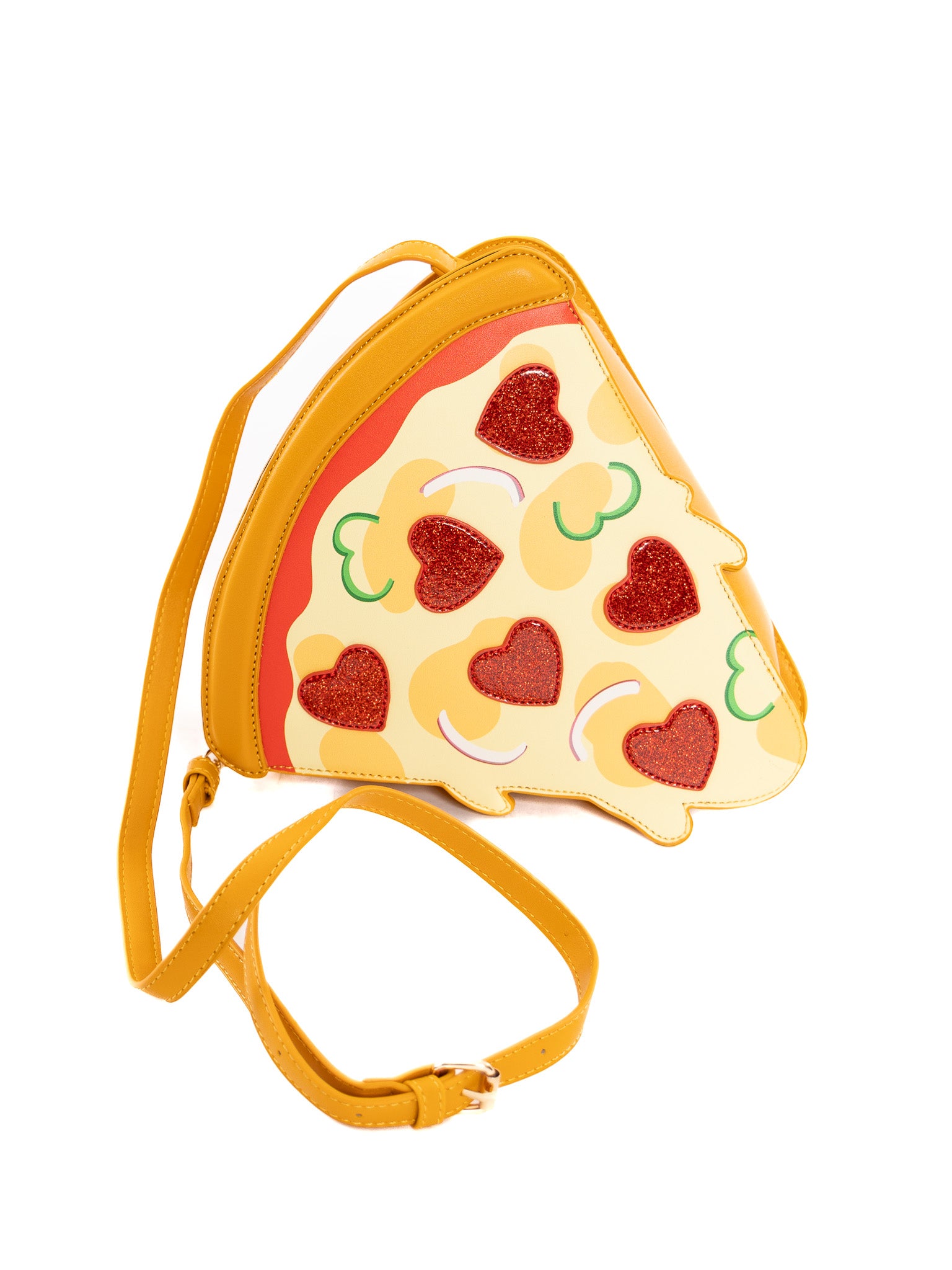 The key to my heart is draped with molten cheese and studded with pepperoni. Faux leather (PU) with printed and vinyl details. Top zip closure, fabric lining, removable and adjustable strap. 10 inches tall, 10 inches wide at the top, 3 inches deep. Strap adjustable with buckle closure, 36 to 44 inches.