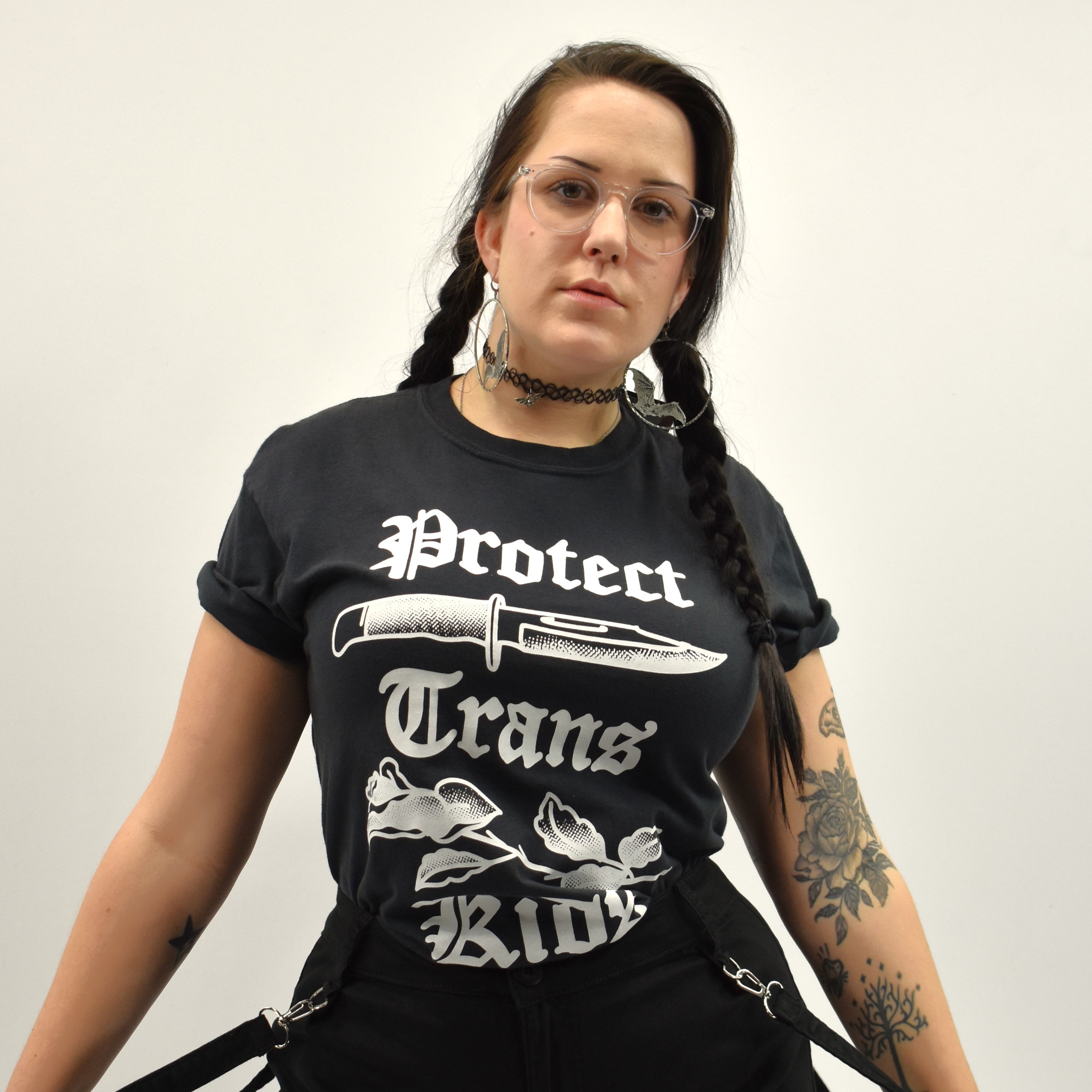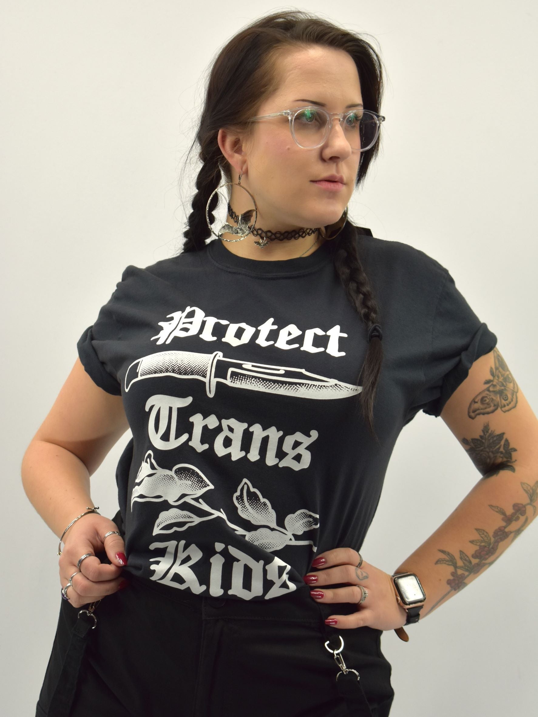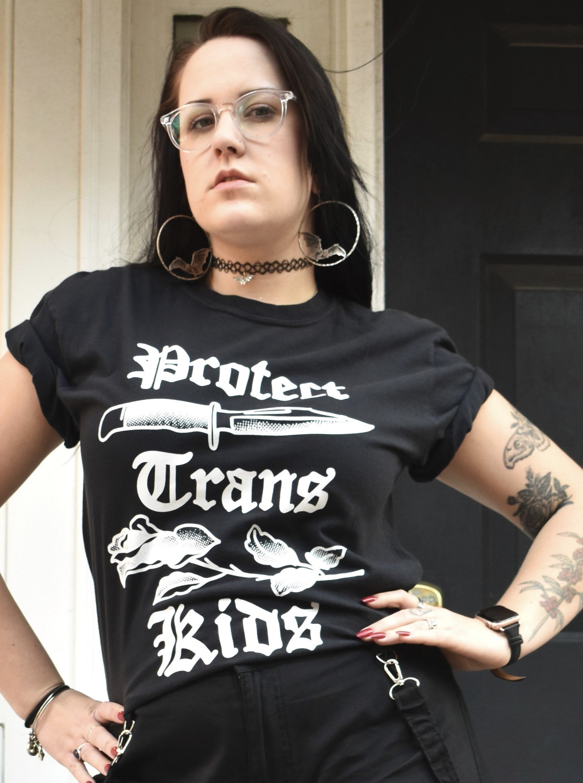 A black short sleeve shirt with the statement “Protect Trans Kids” with a rose and knife between the letters, all in a white gothic font.