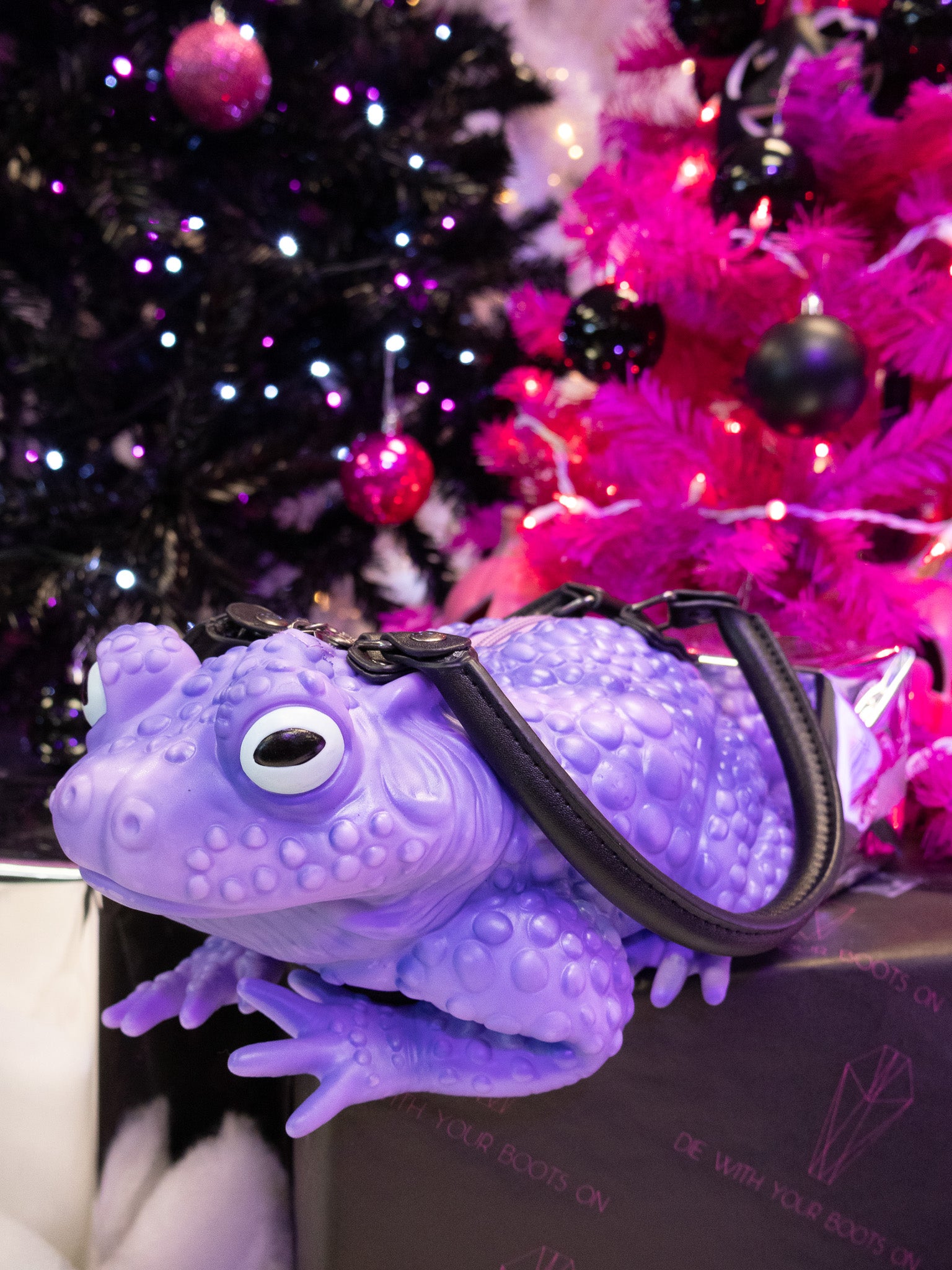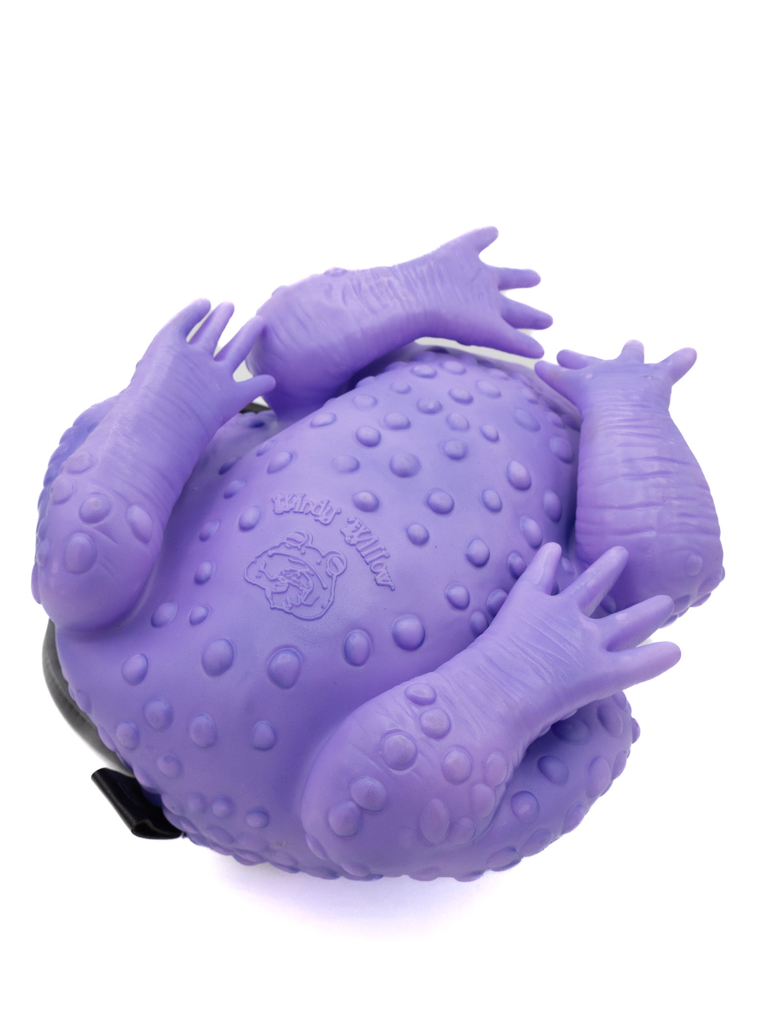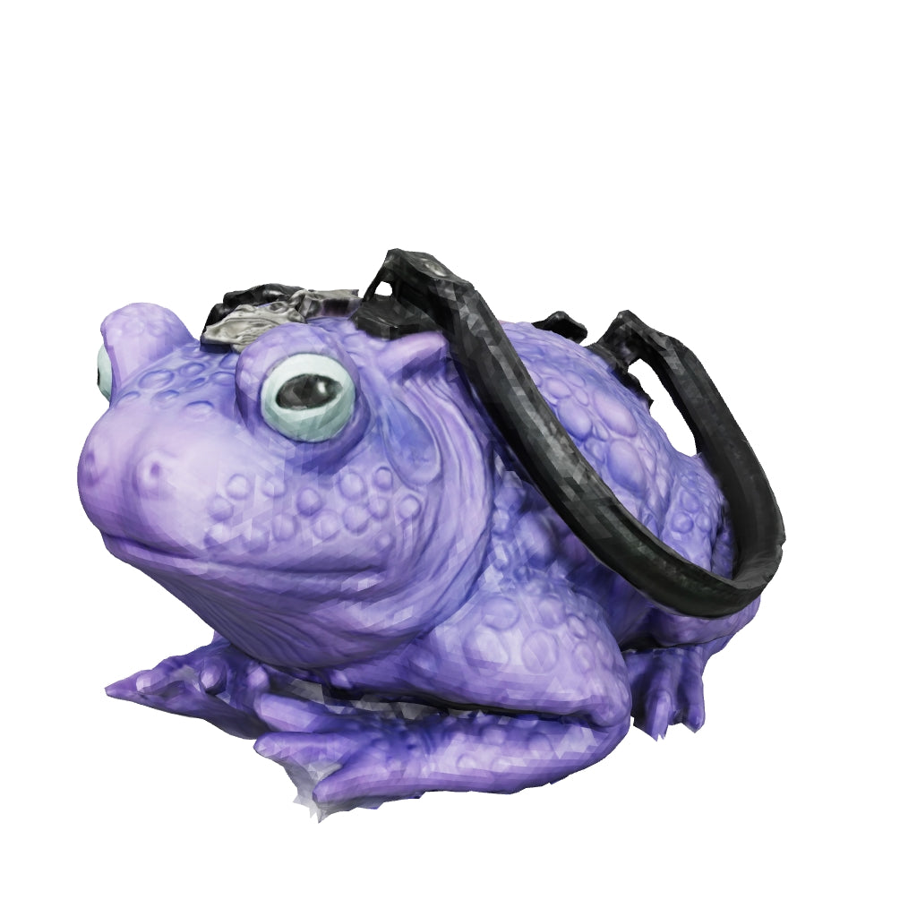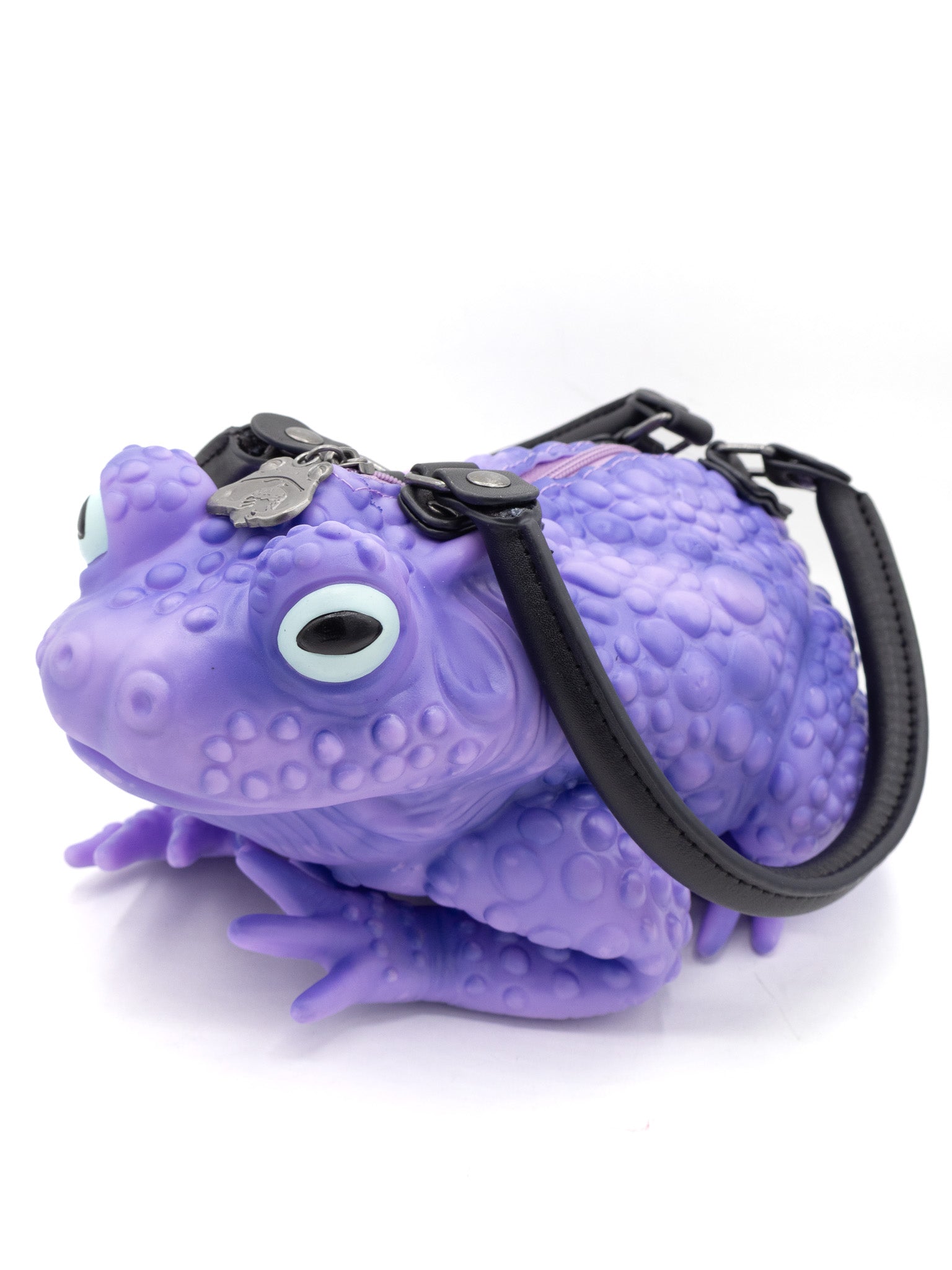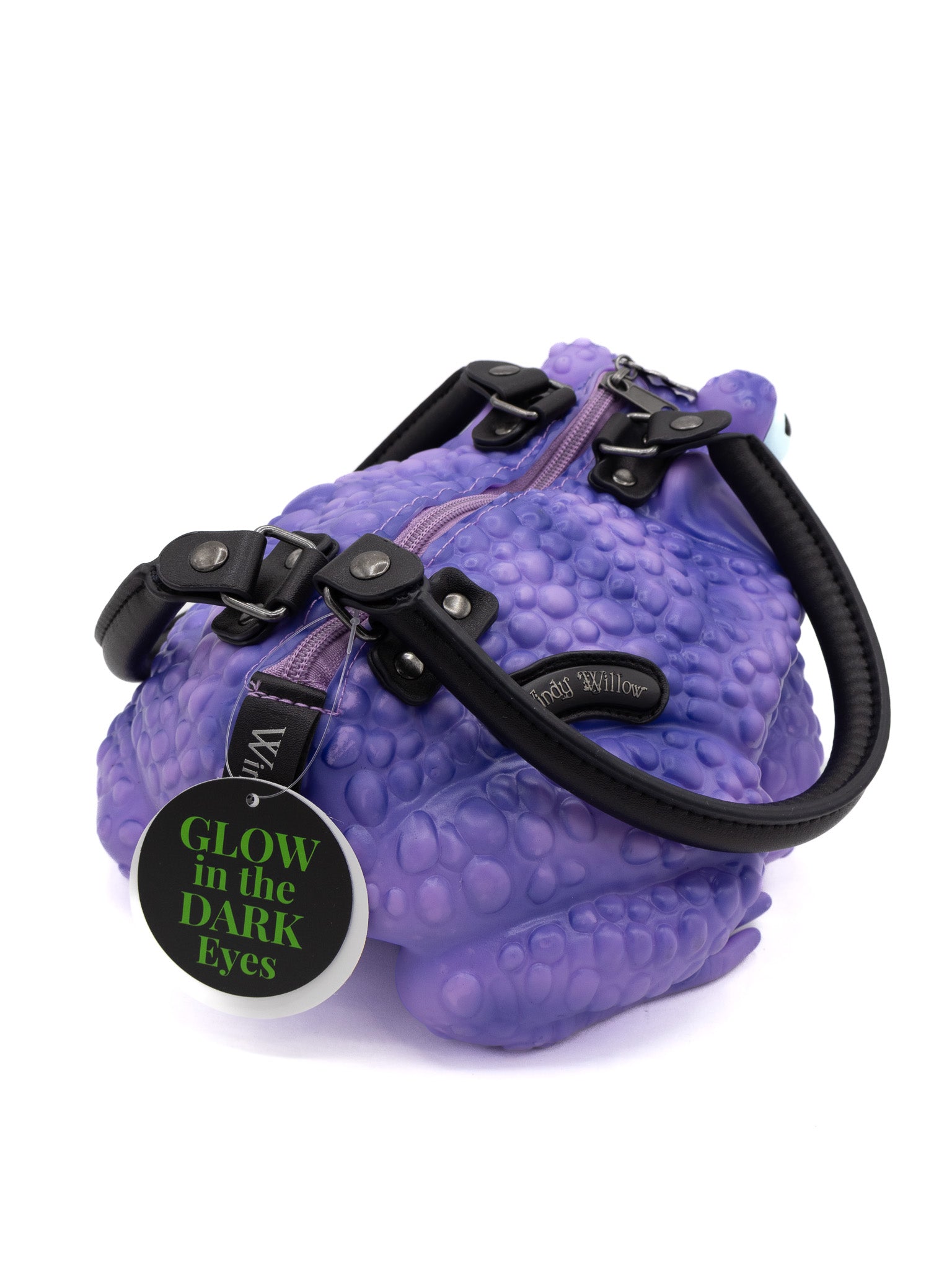 This purple toad bag from Windy Willow is made from soft vinyl with glow-in-the-dark eyes, a mint green fabric lining, gunmetal details, and a zippered top closure. The two handles are removable, and it includes a removable black adjustable cross body strap. These toady babies are quite roomy inside! Measures approximately 11" long, 8" wide, and 4" tall.