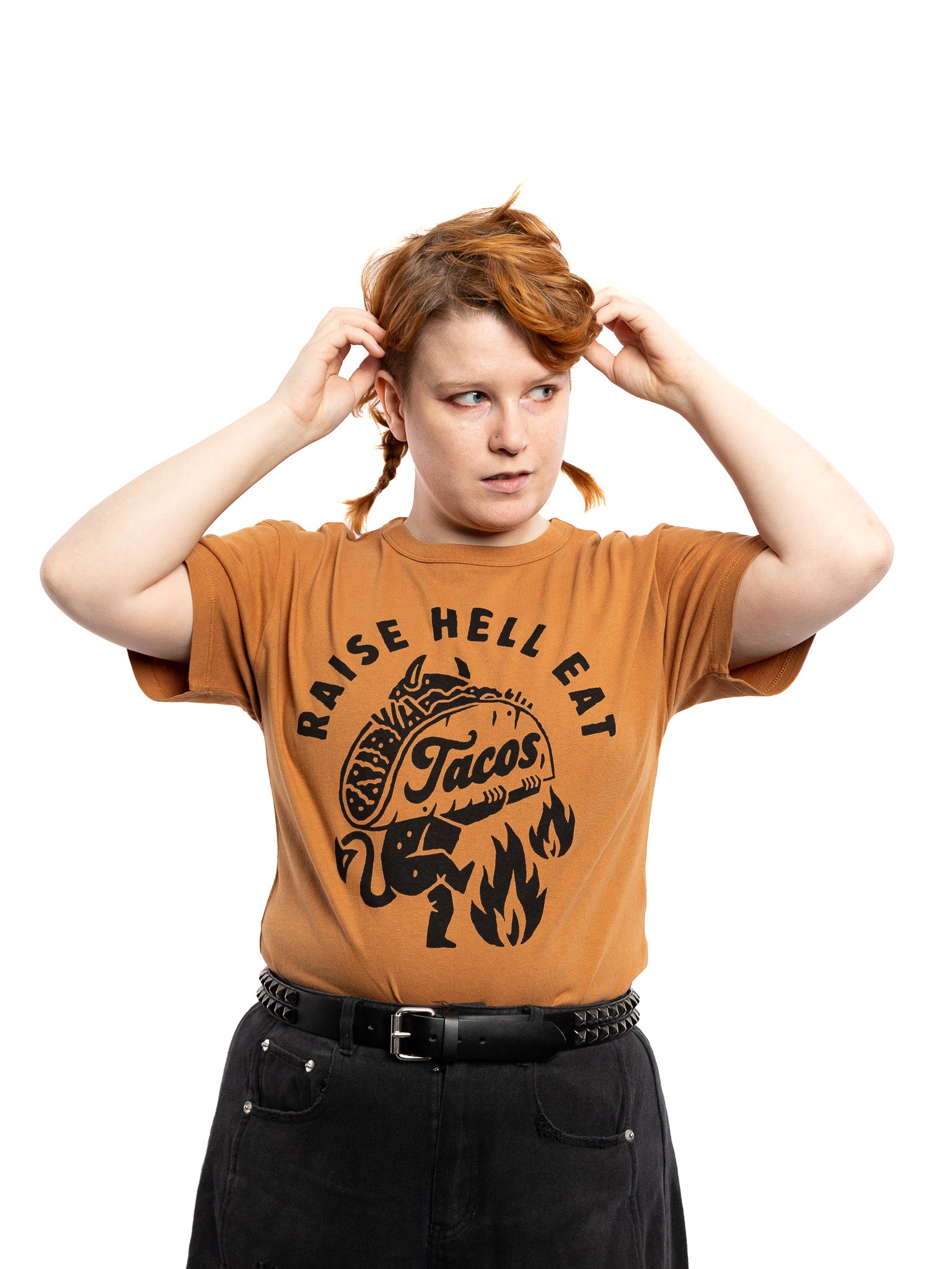 The Raise Hell Eat Tacos unisex adult t-shirt is made of high quality and comfy, vintage-inspired fabric. The edgy graphic tee design features a taco slogan accompanied by a devil holding a taco.