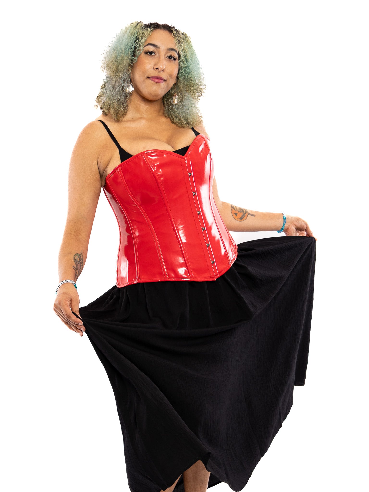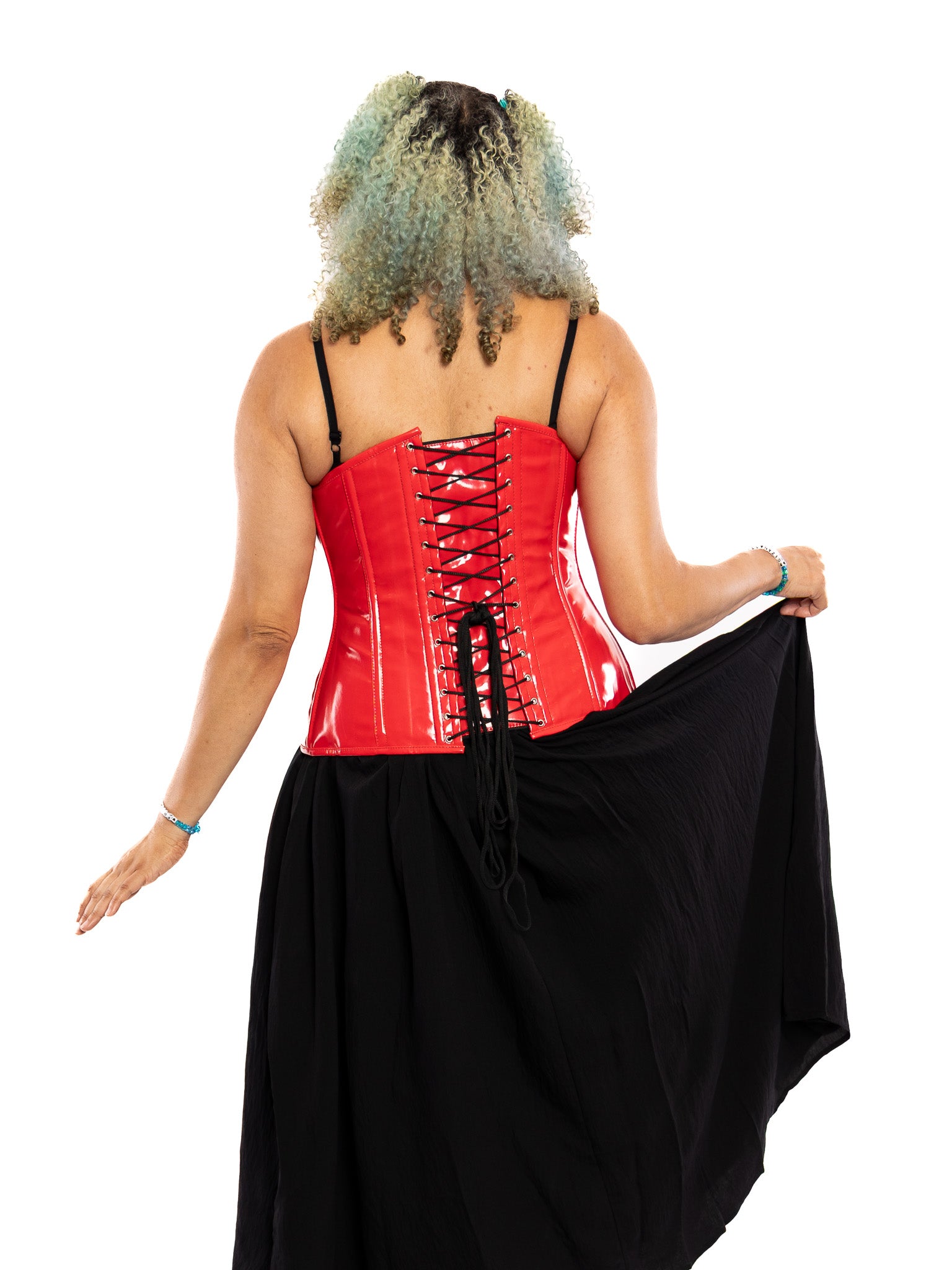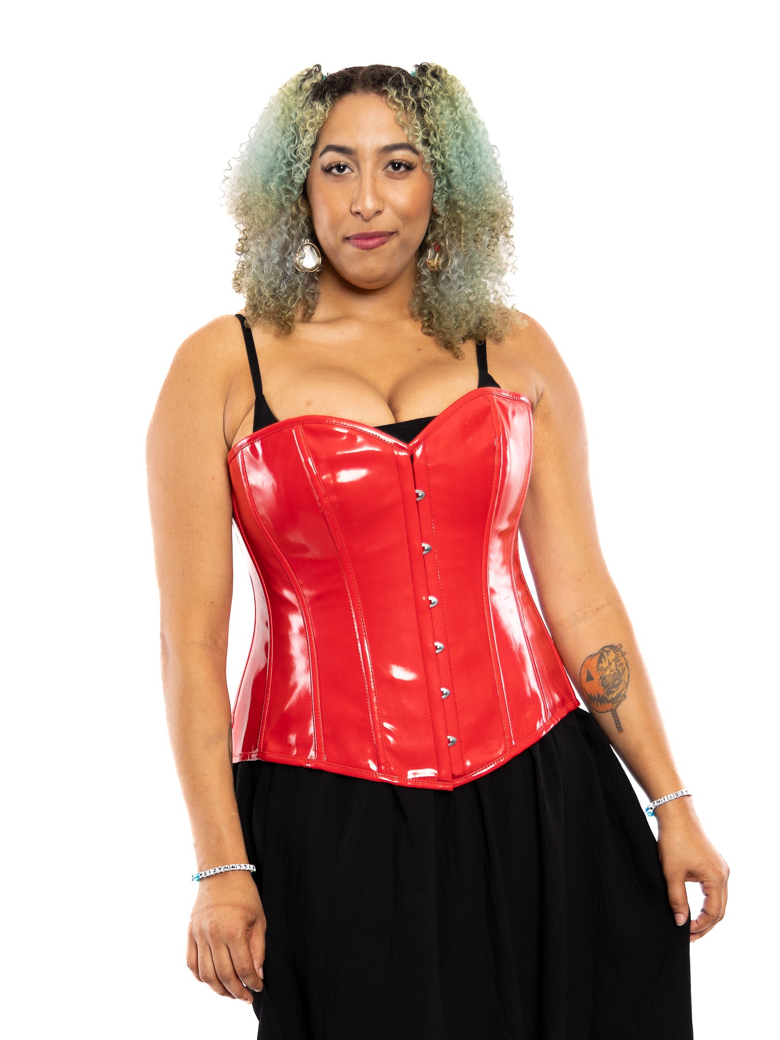 Careful, don't get burned! Sizzling hot fullbust corset made of high quality patent red PVC fabric.