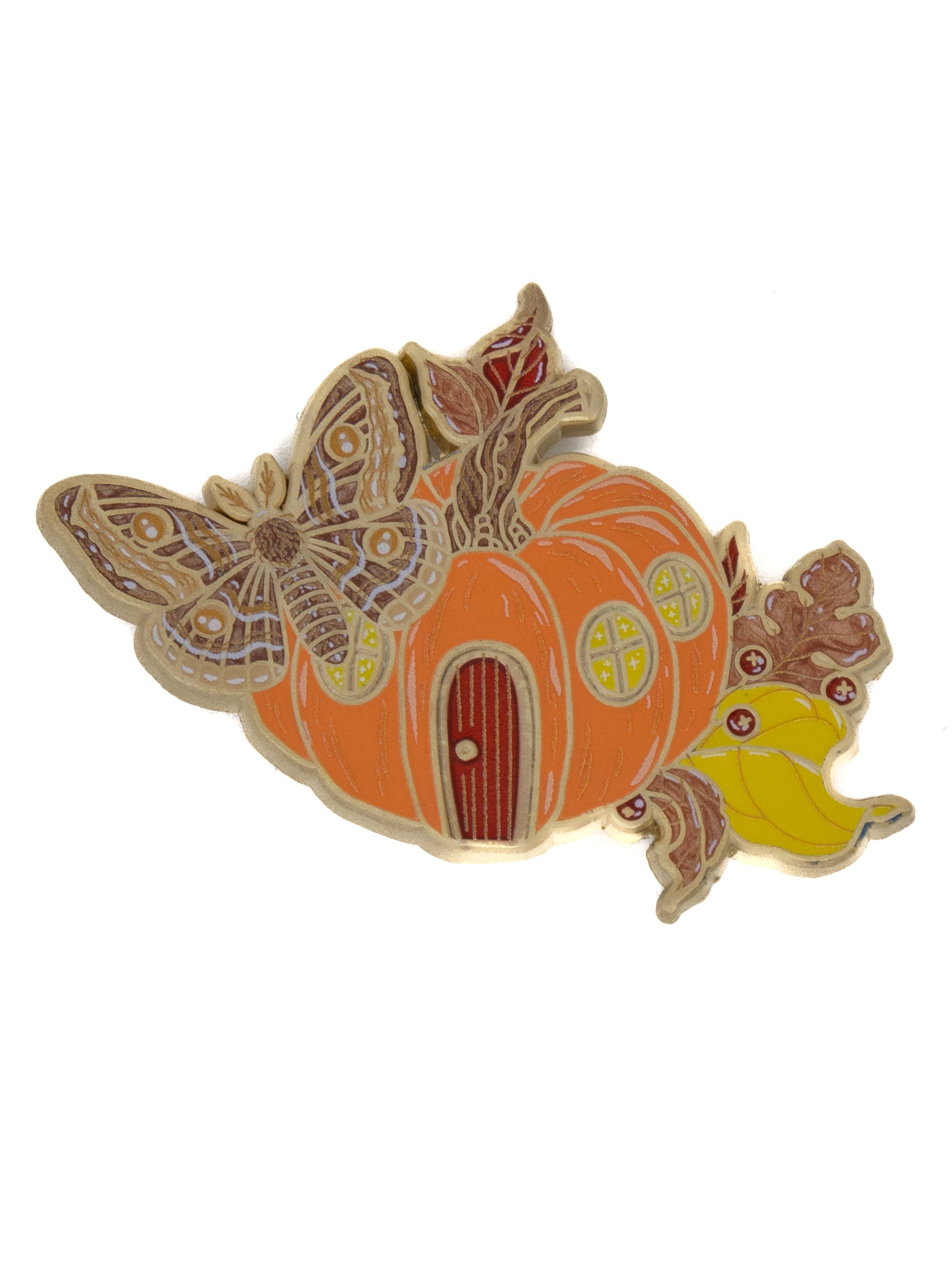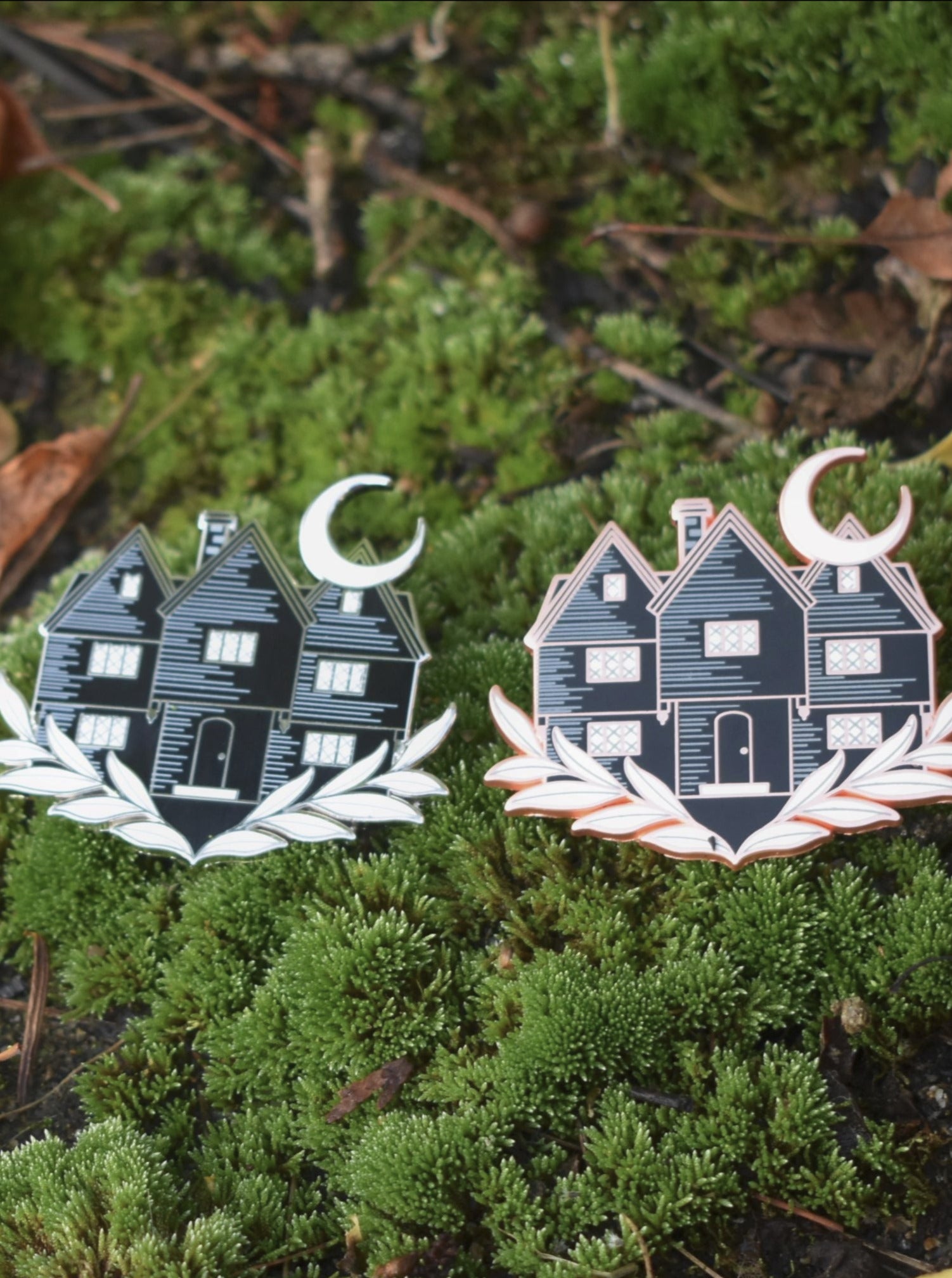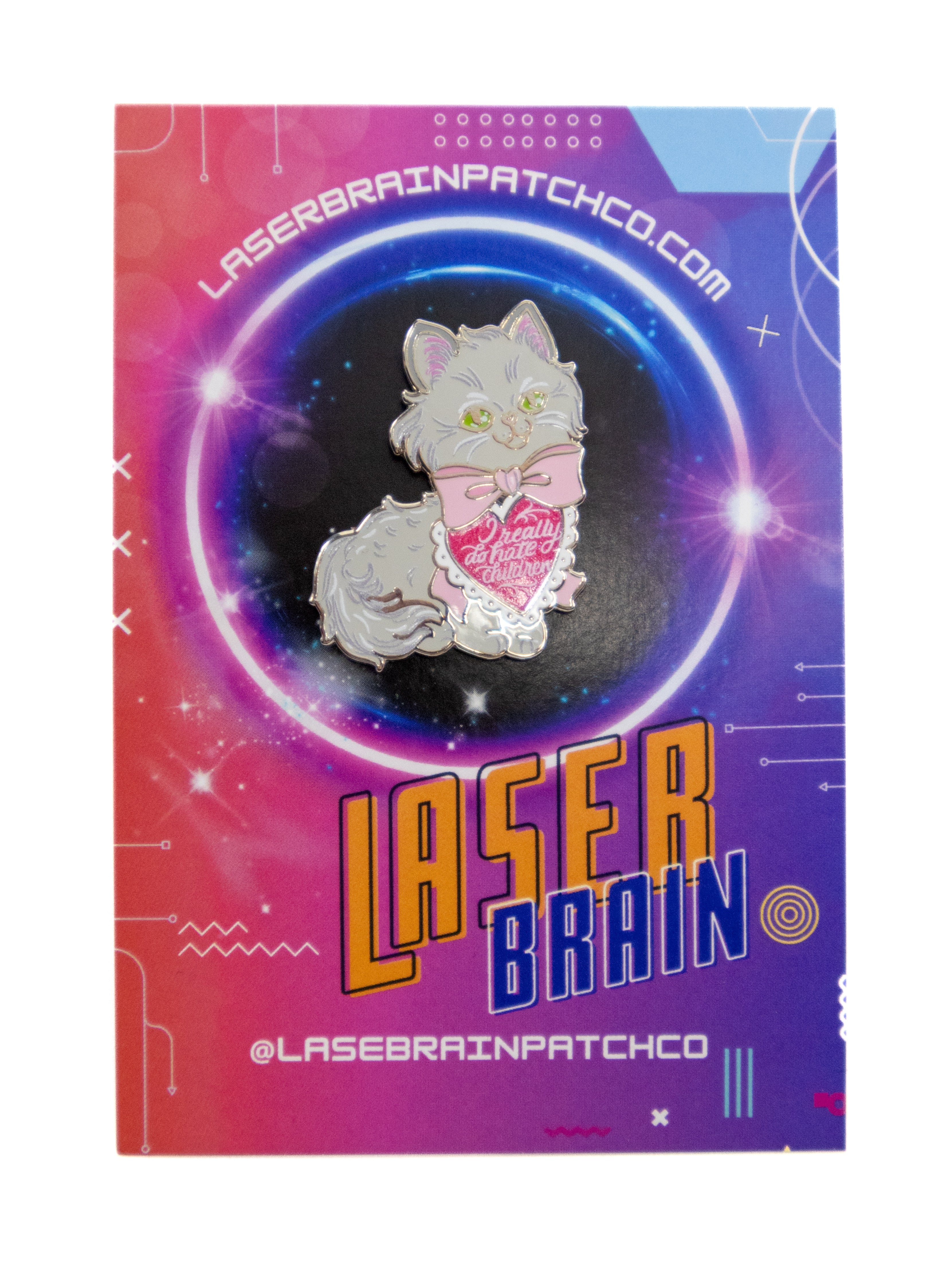 Silver metal pin with colored enamel. Two pin posts with rubber backs. Measures approximately 1" x 1.5". Gray variant has green eyes, a white bow, and a frilly red heart that reads "I'll See You In Hell." Brown variant has teal eyes, a pink bow, and a frilly blue glitter heart that reads "Fuck." White variant has green eyes, a pink bow, and a frilly pink glitter heart that reads "I Really Do Hate Children." Orange variant has yellow eyes, a teal bow, and a frilly pink heart that reads "Fuck Around & Find Out."