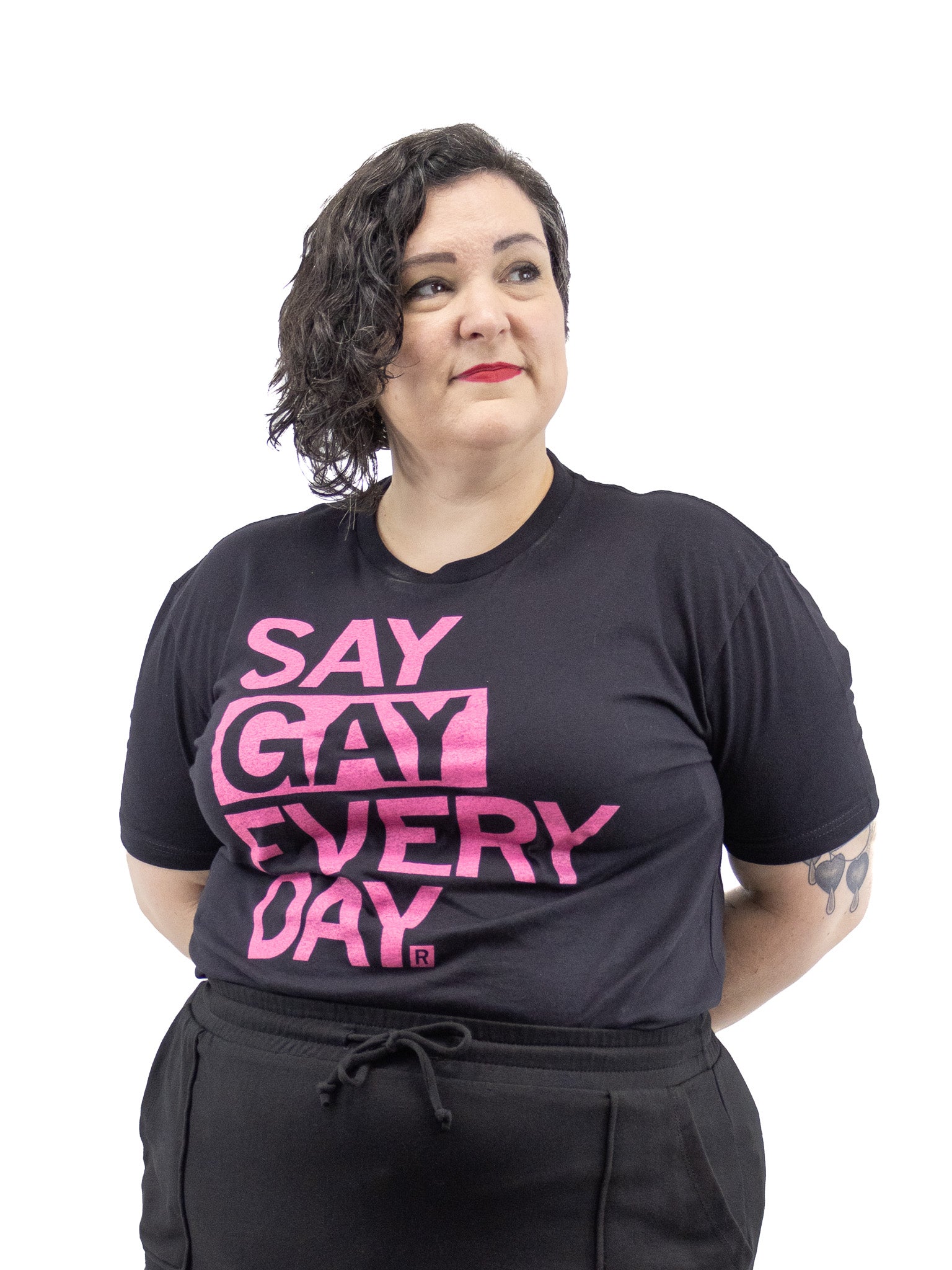 Say gay every day. Aura pink screen print on a black t-shirt (100% combed ringspun cotton). Cut and sewn sweatshop free. Designed and printed by union labor at Raygun. Unisex sizing.