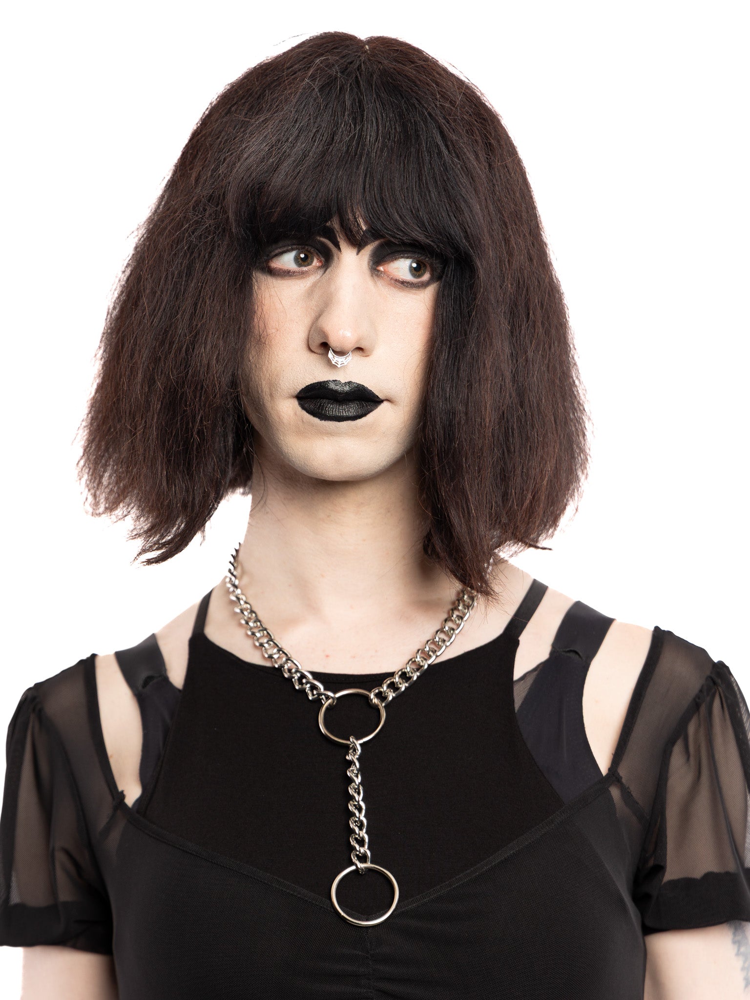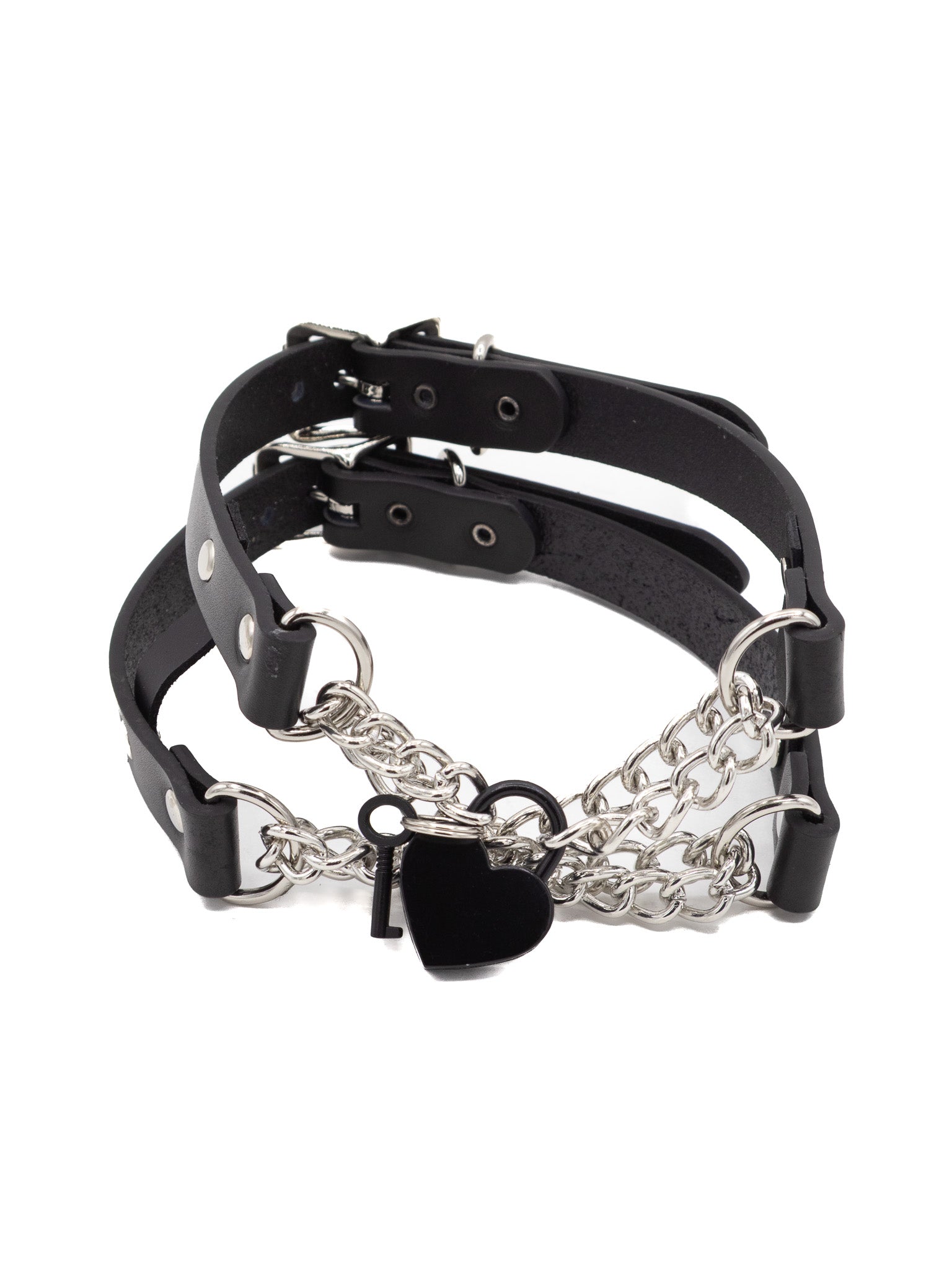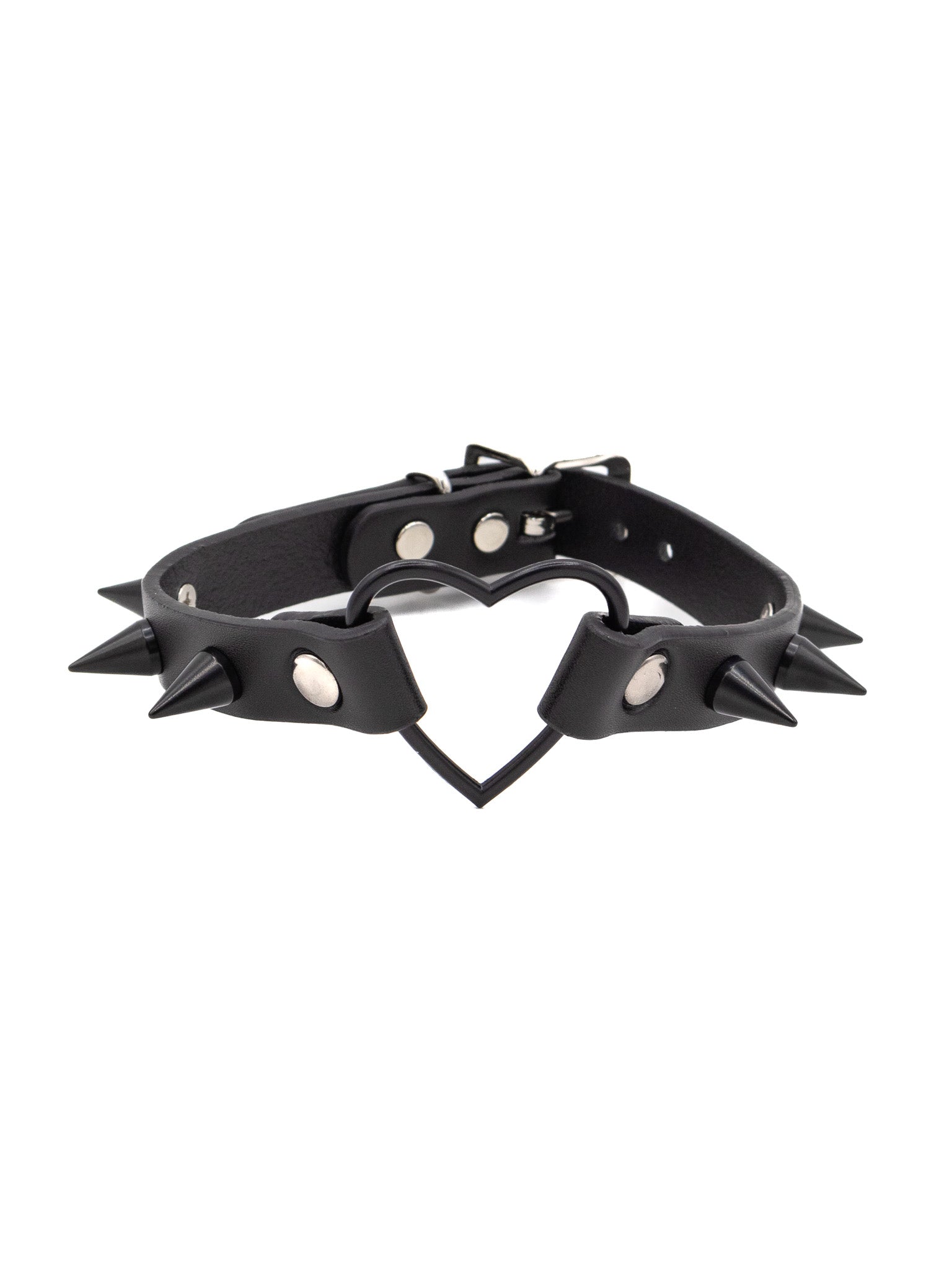This choker is dangerous but cute, featuring a silver metal heart charm in the front and matching silver metal cone spikes on both sides.