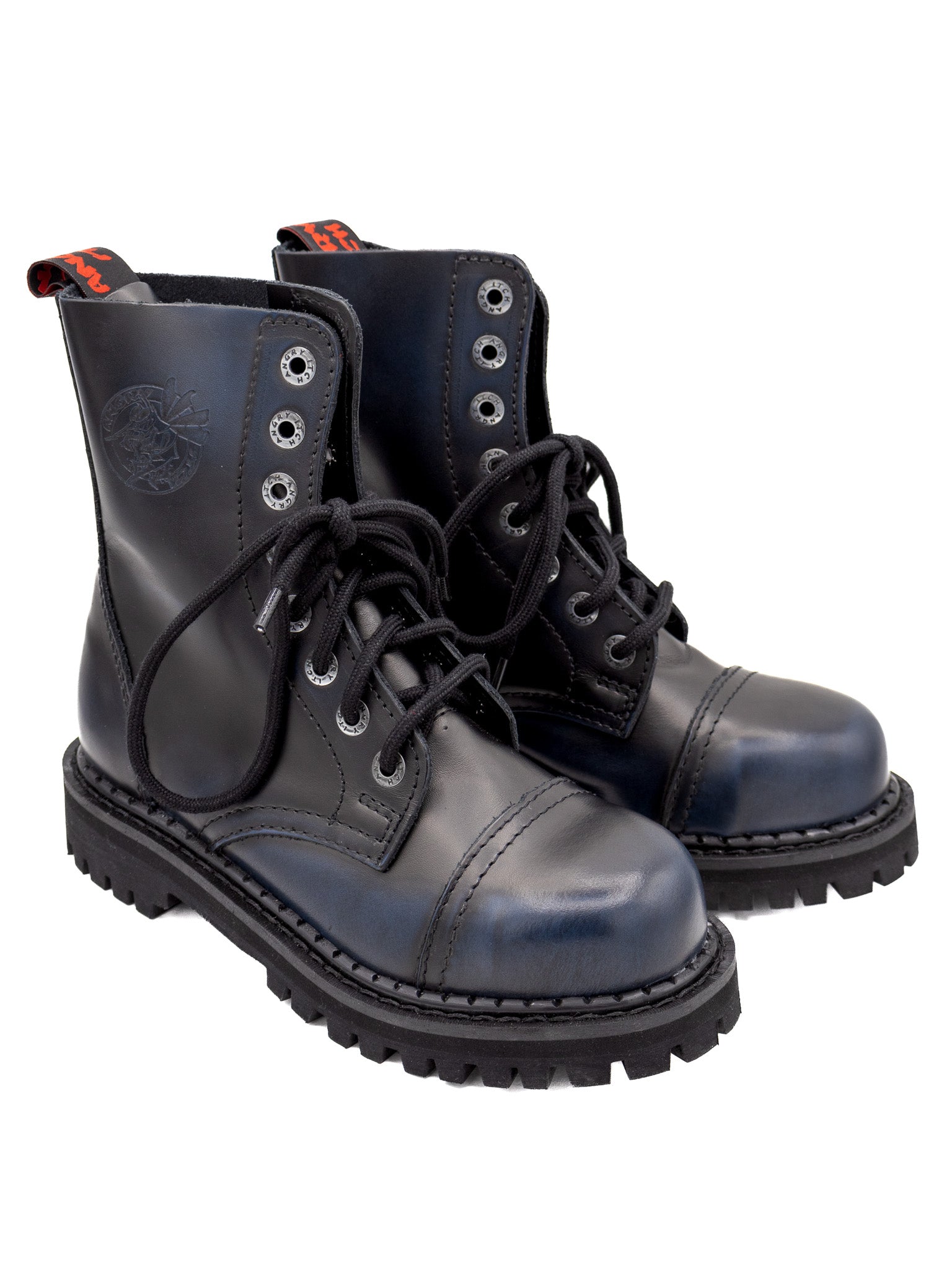 - Complete upper including the tongue is crafted from full cow leather in a unique navy and black ruboff finish.